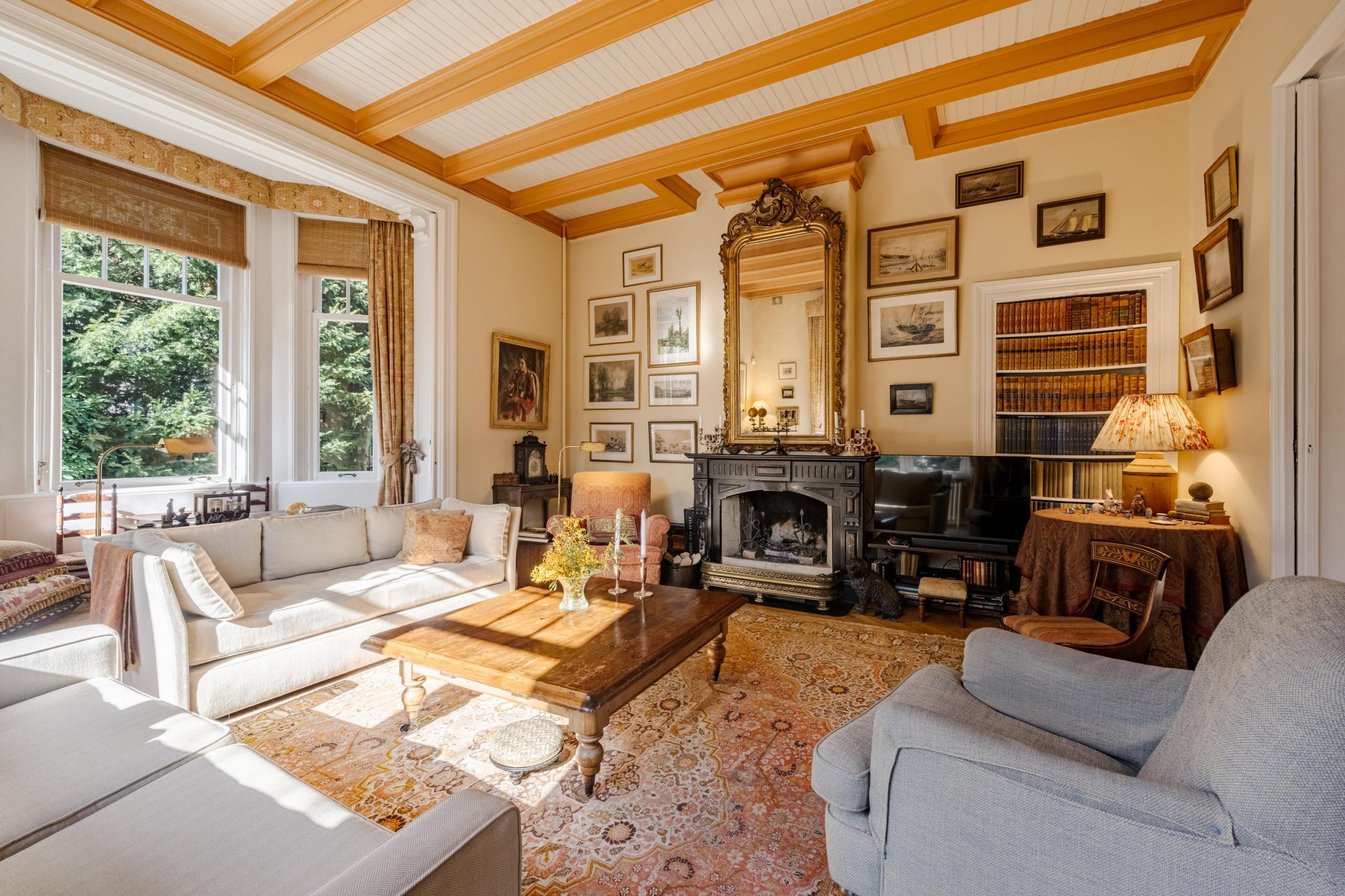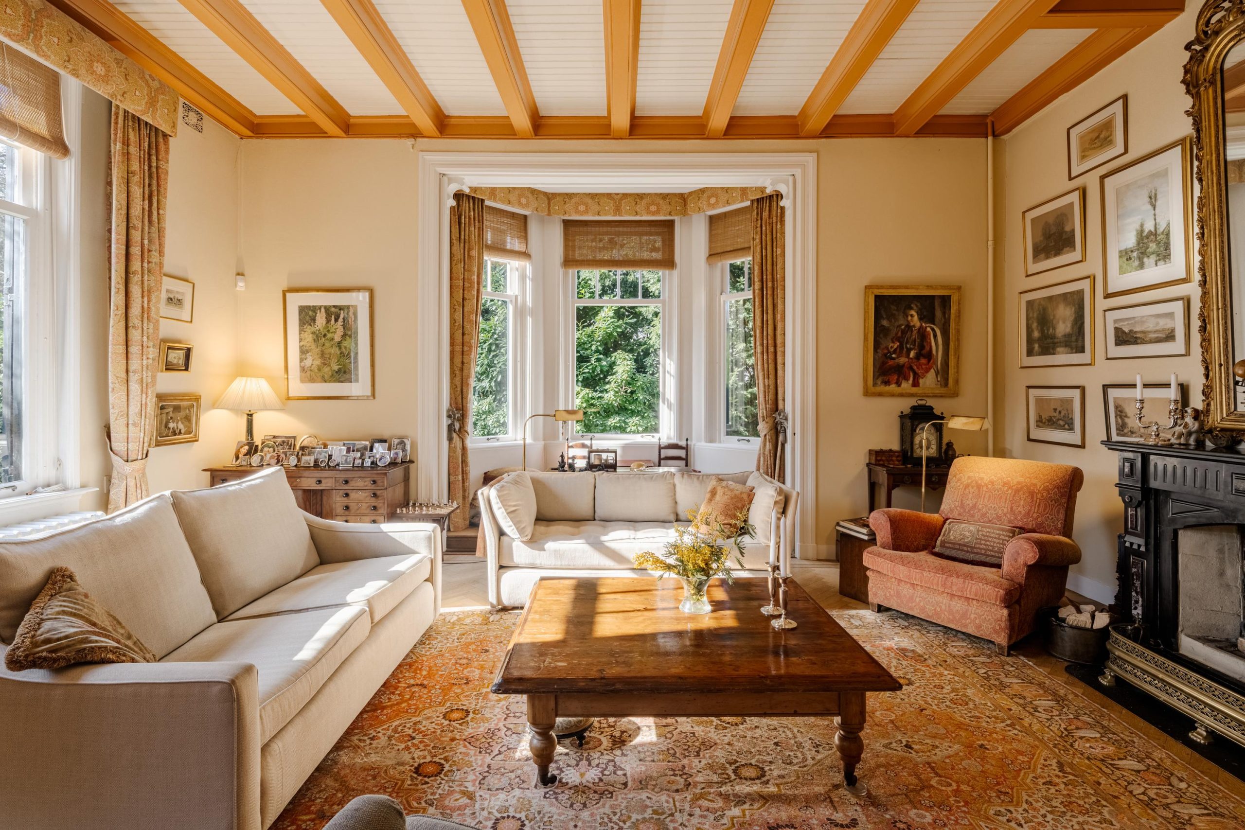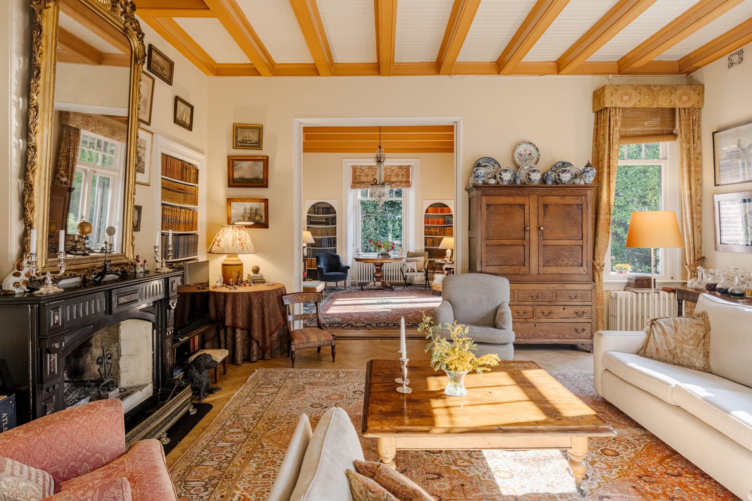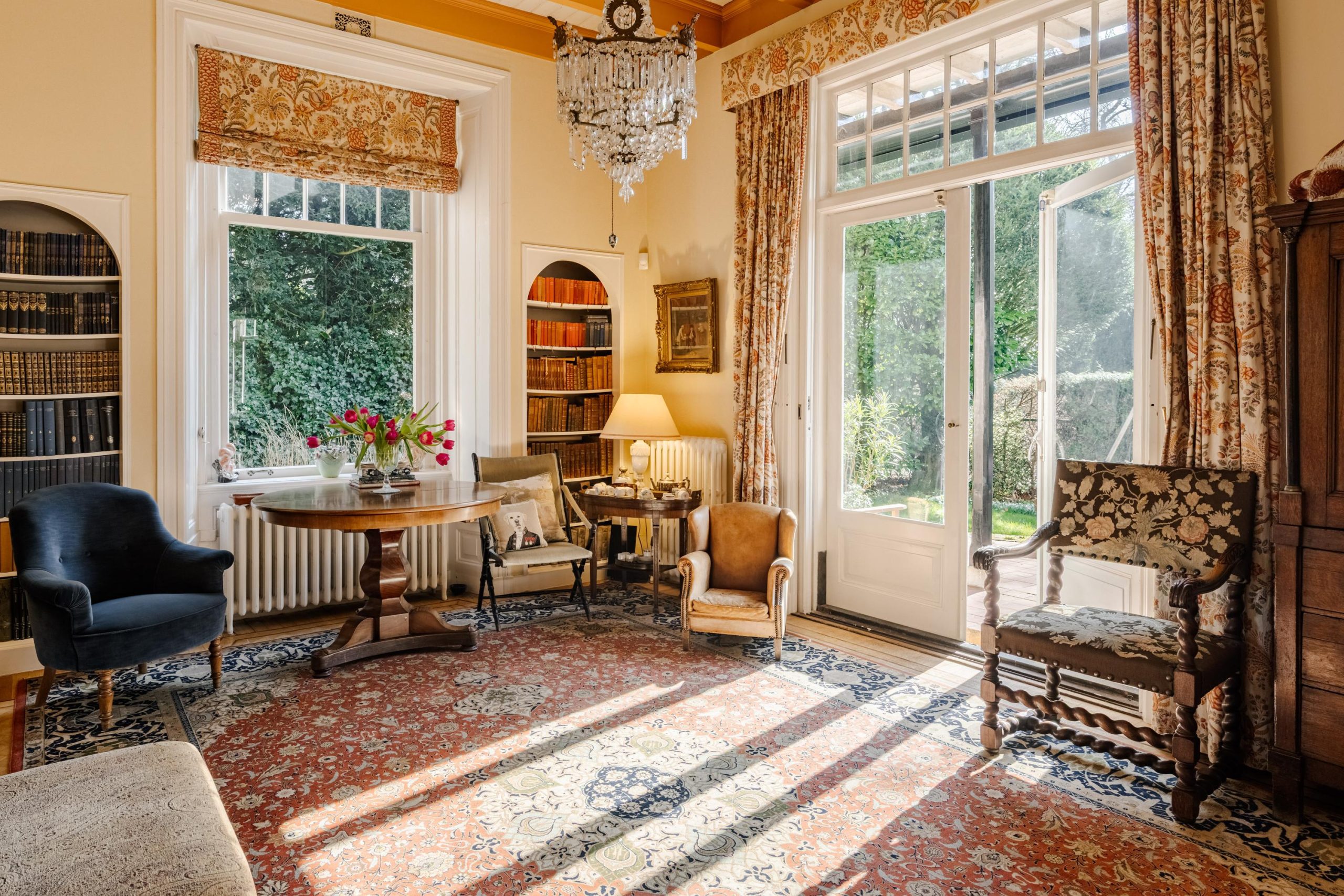 De royale woonkamer ensuite is licht en sfeervol, met een erker aan de zijkant en twee open haarden. Vanuit de eetkamer geven openslaande deuren toegang tot het zonnige terras aan de voorzijde. Dankzij de grote raampartijen is er gedurende de hele dag een prettige lichtinval.