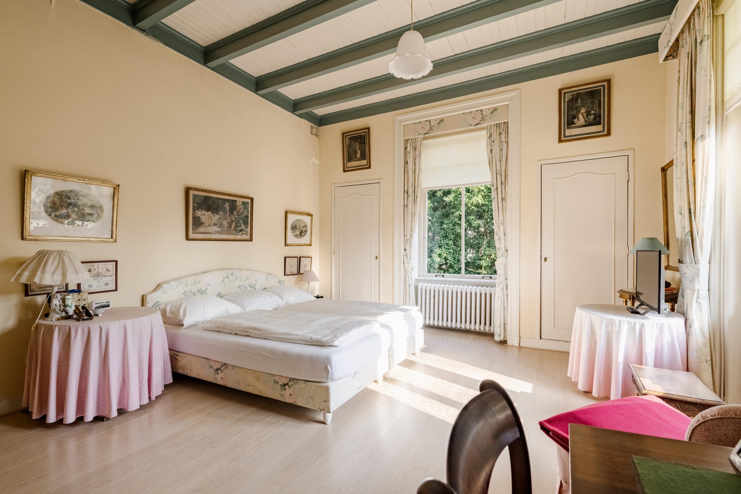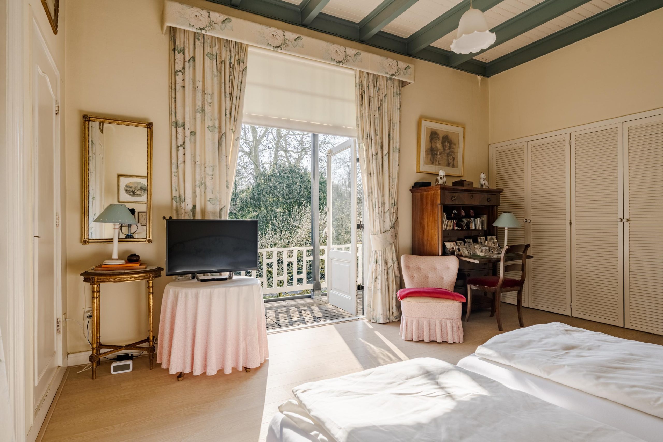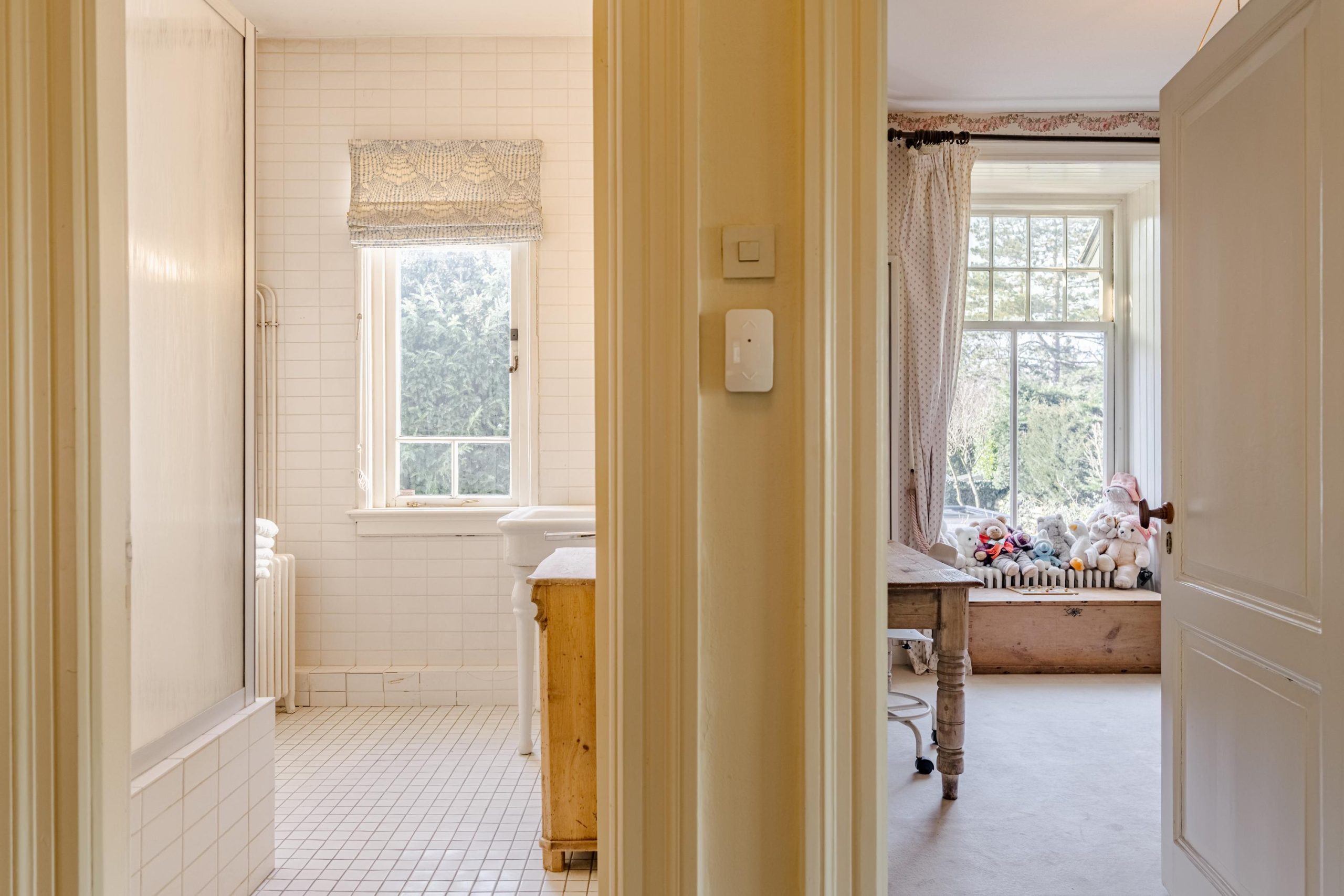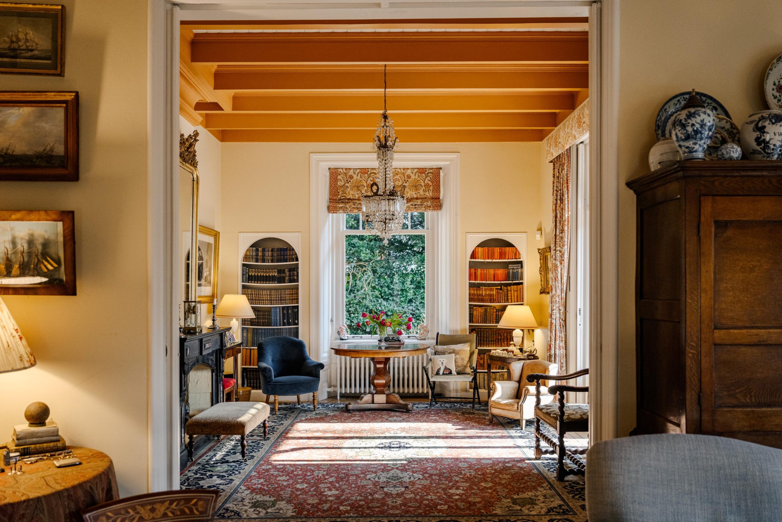 De royale woonkamer ensuite is licht en sfeervol, met een erker aan de zijkant en twee open haarden. Vanuit de eetkamer geven openslaande deuren toegang tot het zonnige terras aan de voorzijde. Dankzij de grote raampartijen is er gedurende de hele dag een prettige lichtinval.