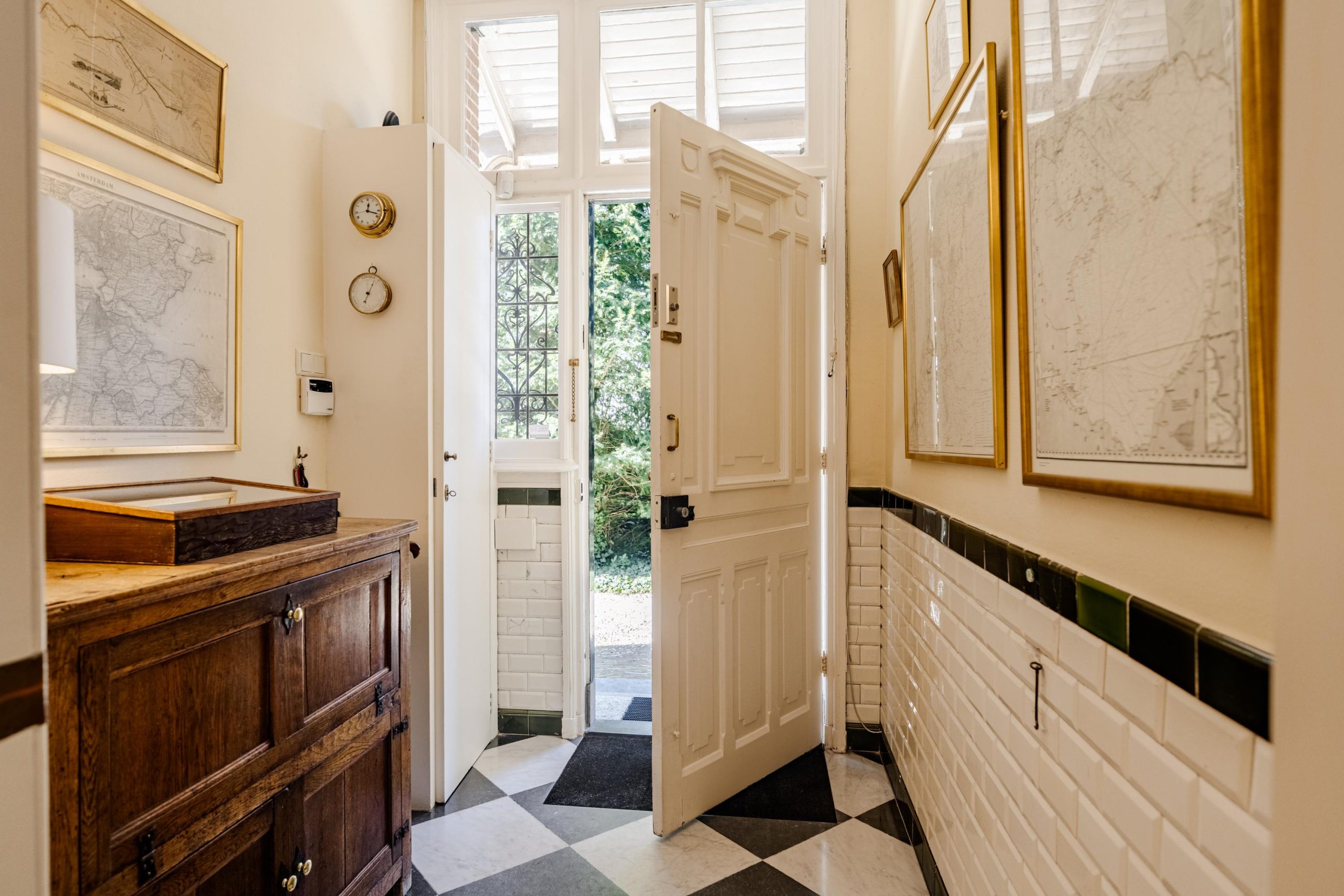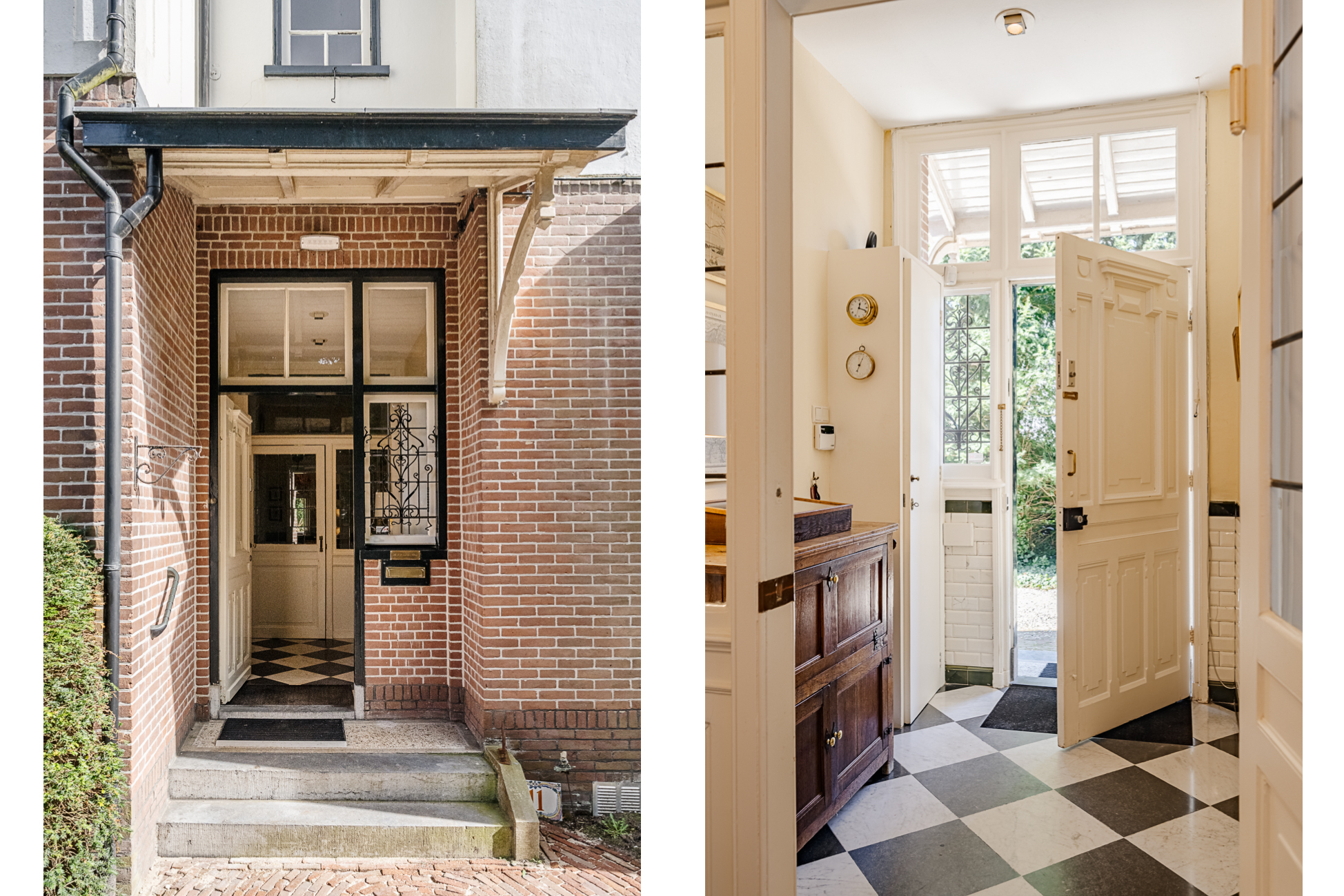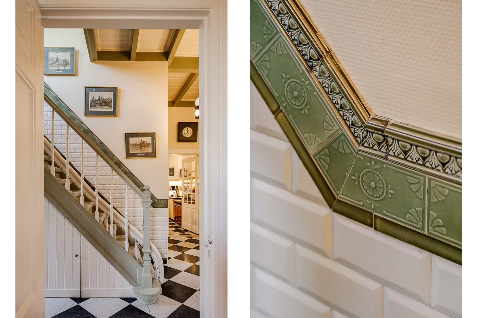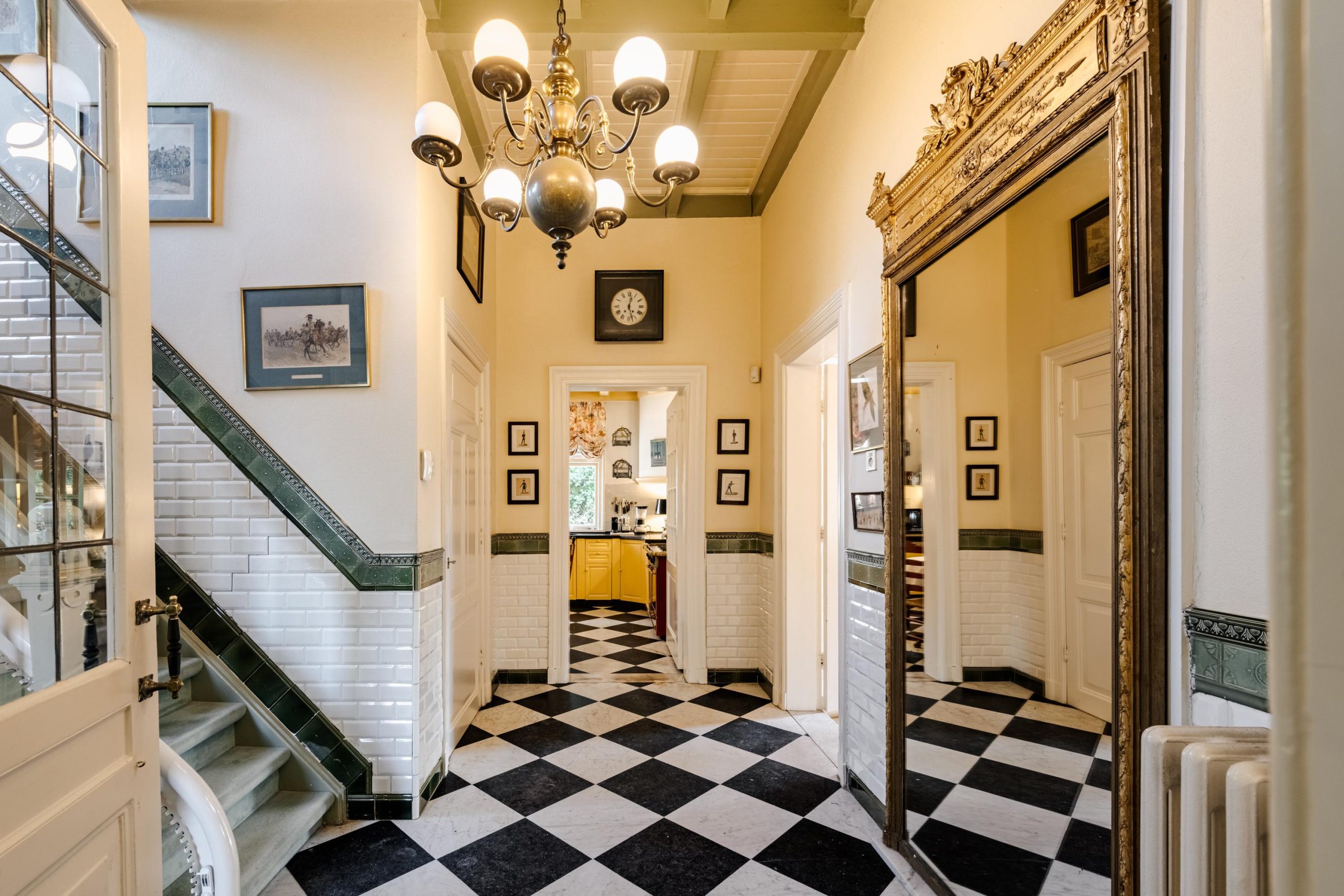 Via het tochtportaal kom je binnen in de imposante hal, waar direct de sfeer van de woning voelbaar is. De hoge plafonds, klassieke tegels en fraaie zichtlijnen zorgen voor een indrukwekkende entree.