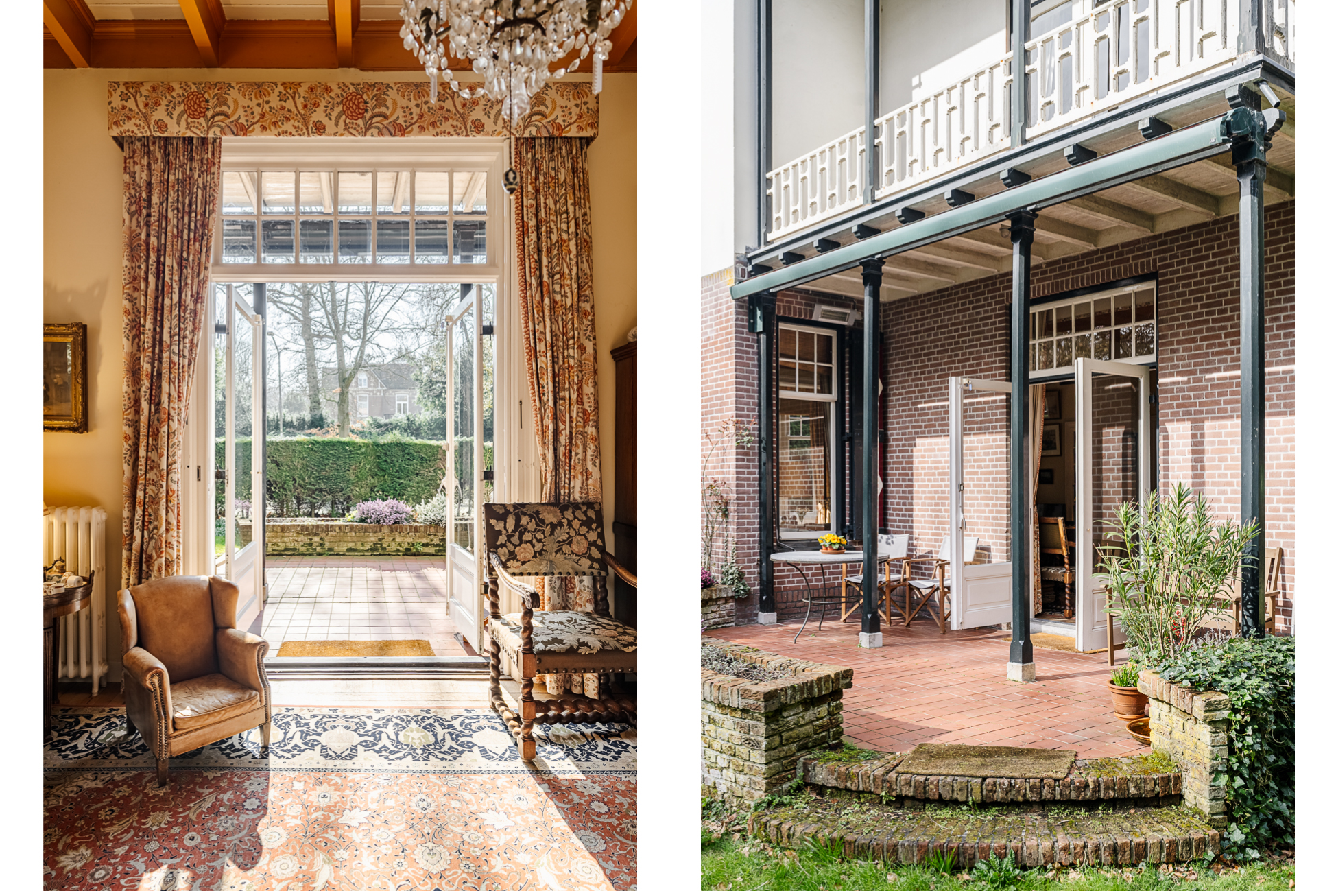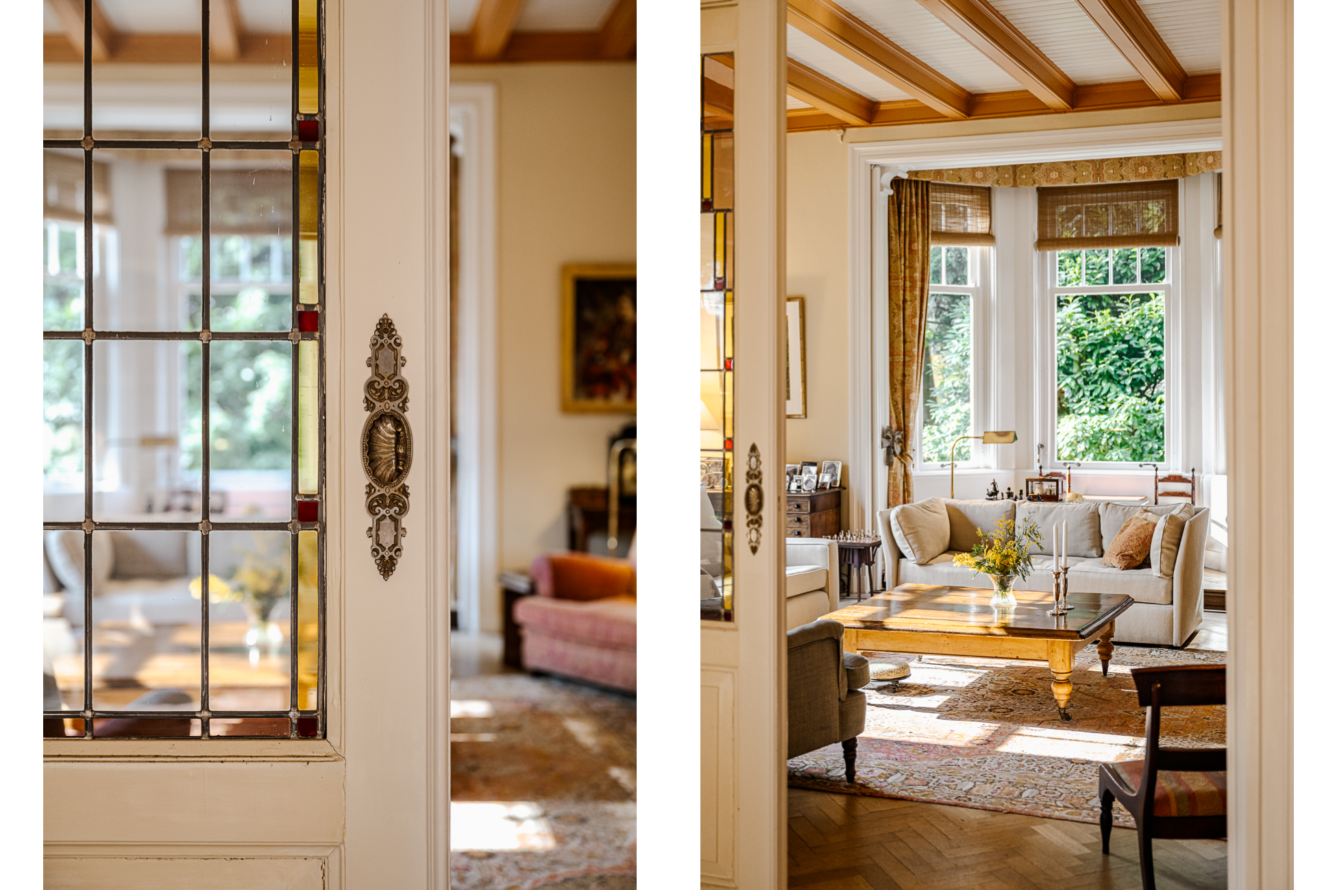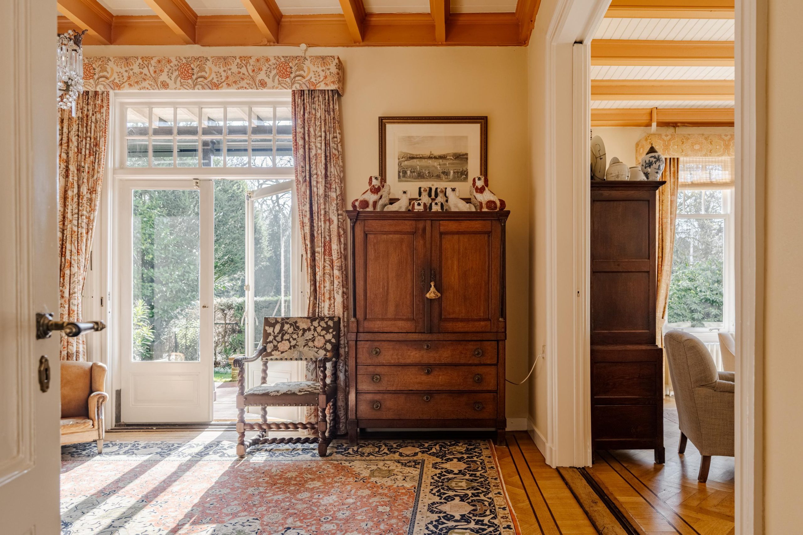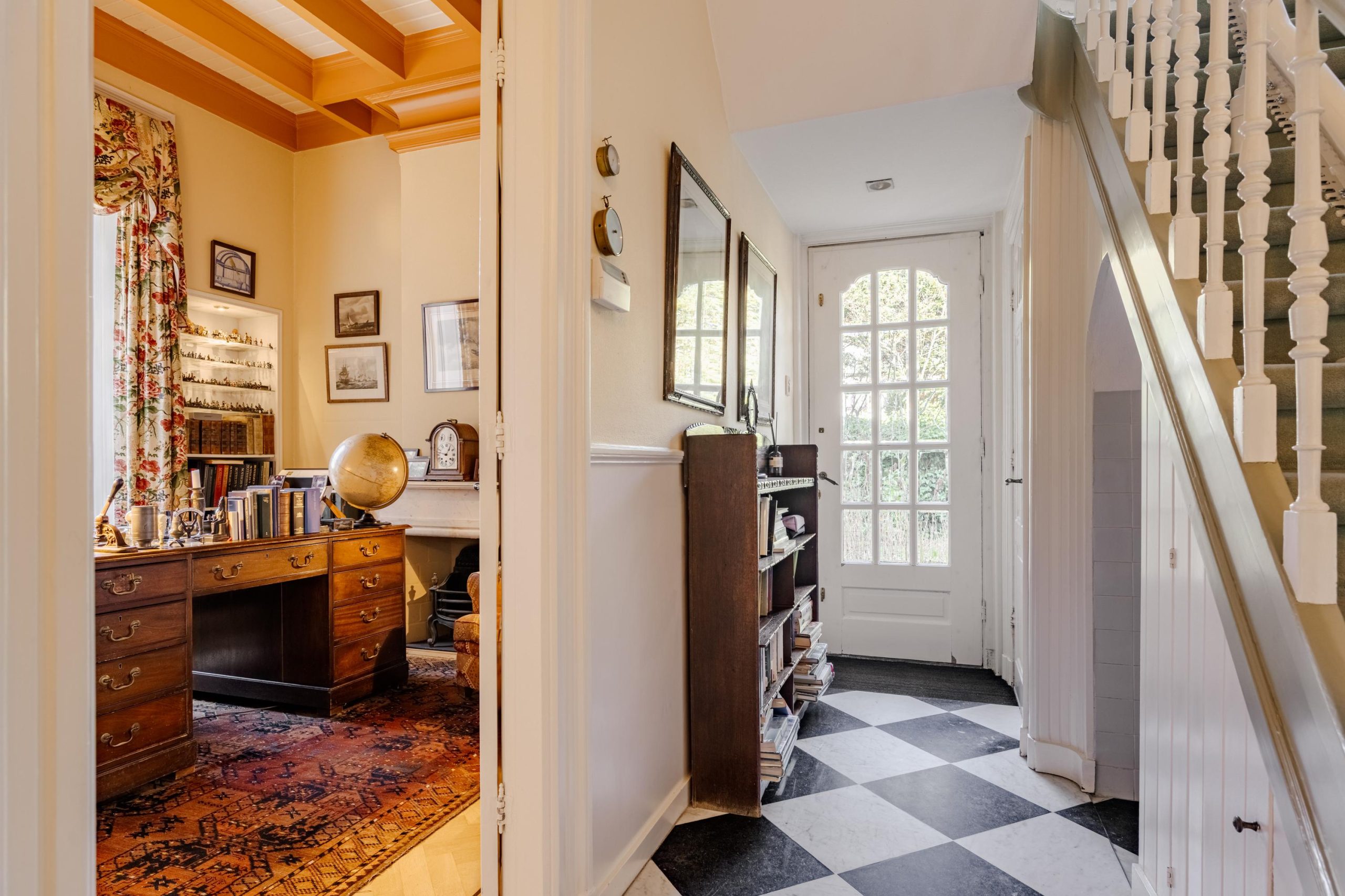 Via het tochtportaal kom je binnen in de imposante hal, waar direct de sfeer van de woning voelbaar is. De hoge plafonds, klassieke tegels en fraaie zichtlijnen zorgen voor een indrukwekkende entree.