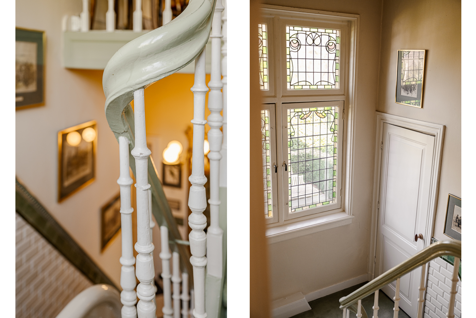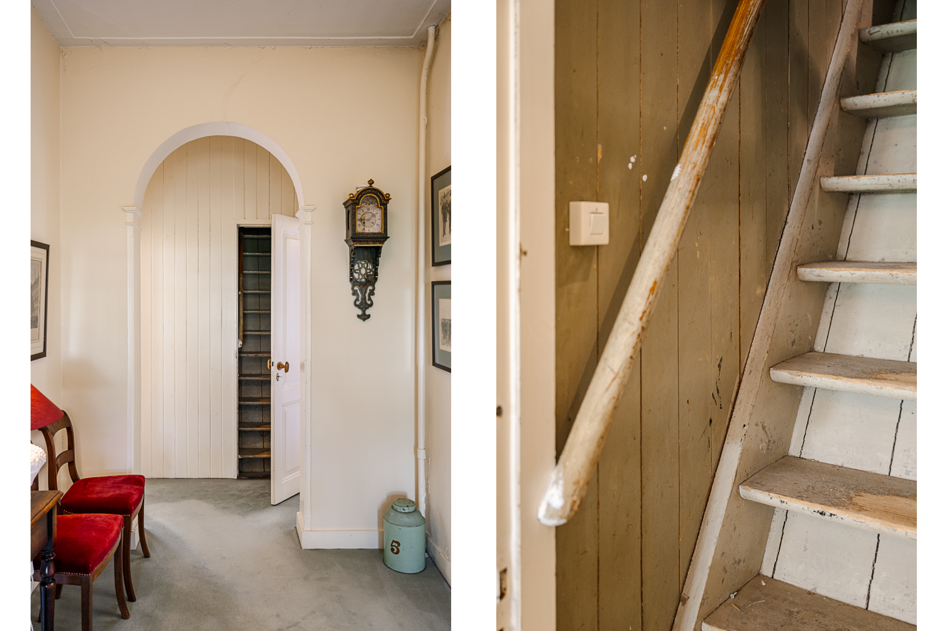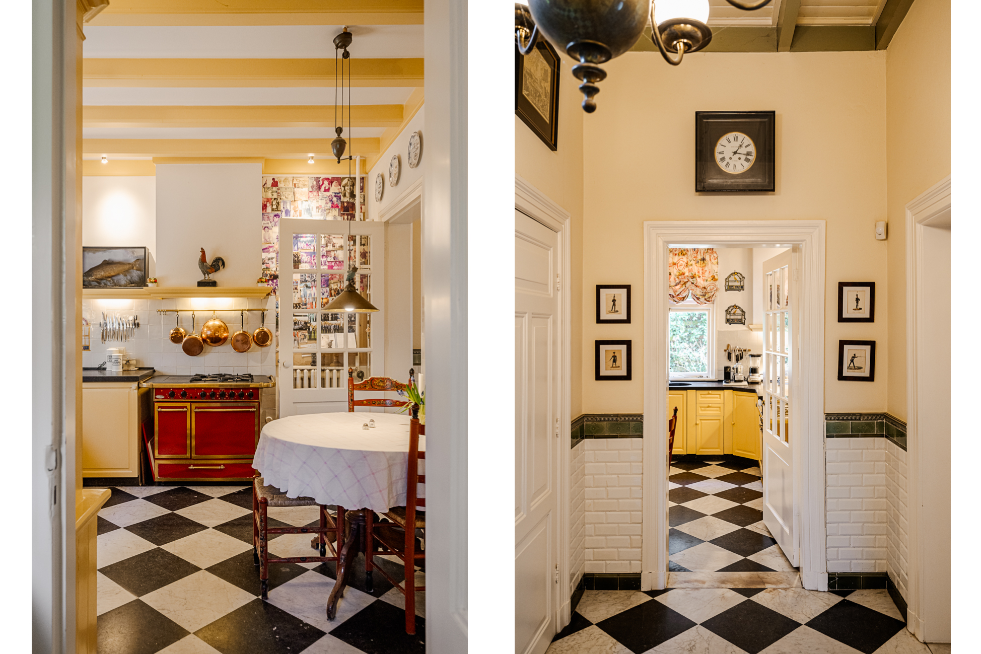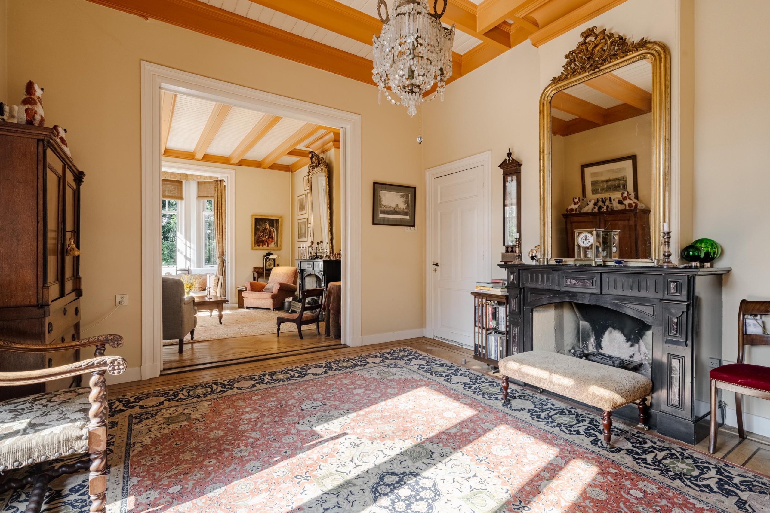 Via het tochtportaal kom je binnen in de imposante hal, waar direct de sfeer van de woning voelbaar is. De hoge plafonds, klassieke tegels en fraaie zichtlijnen zorgen voor een indrukwekkende entree.
