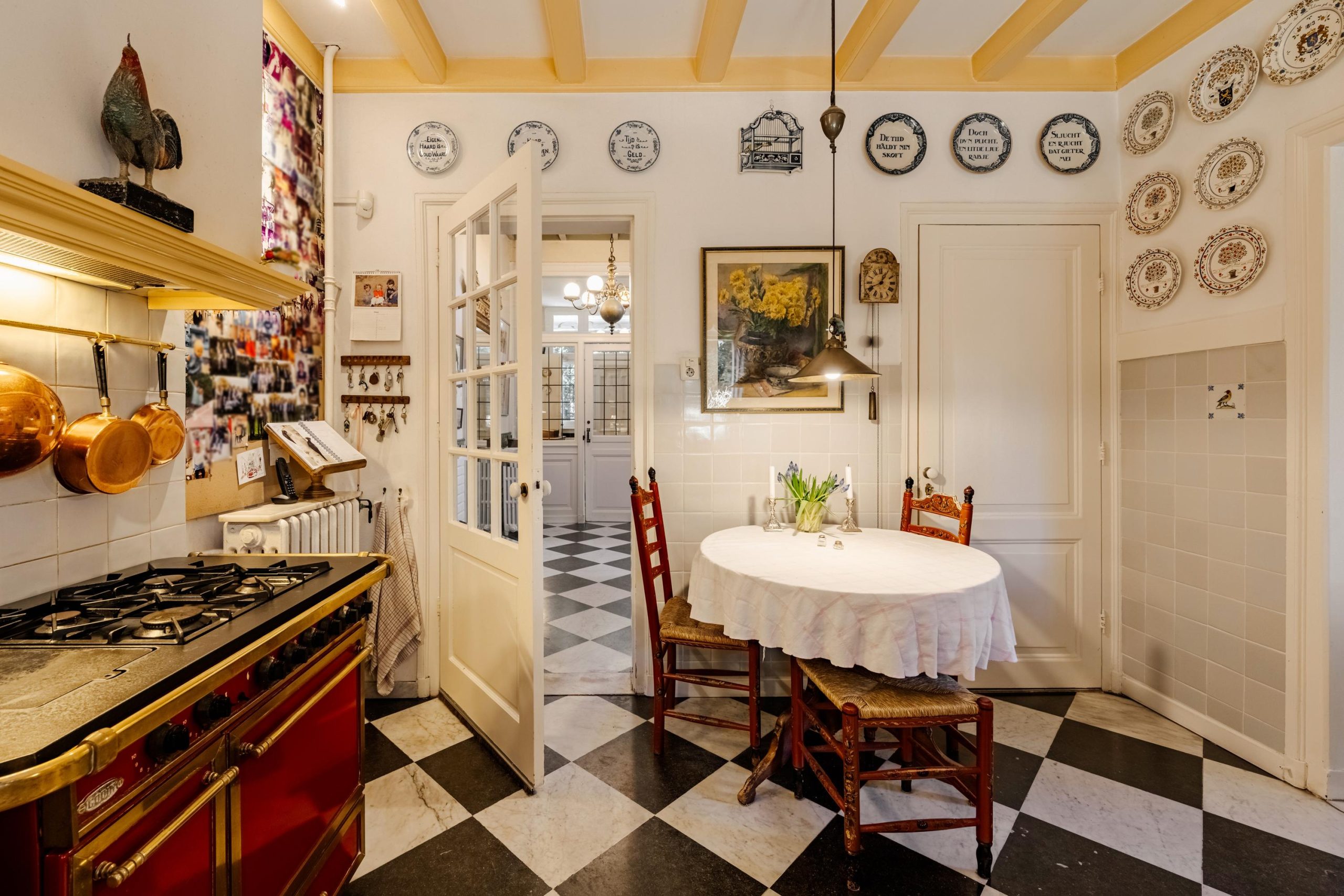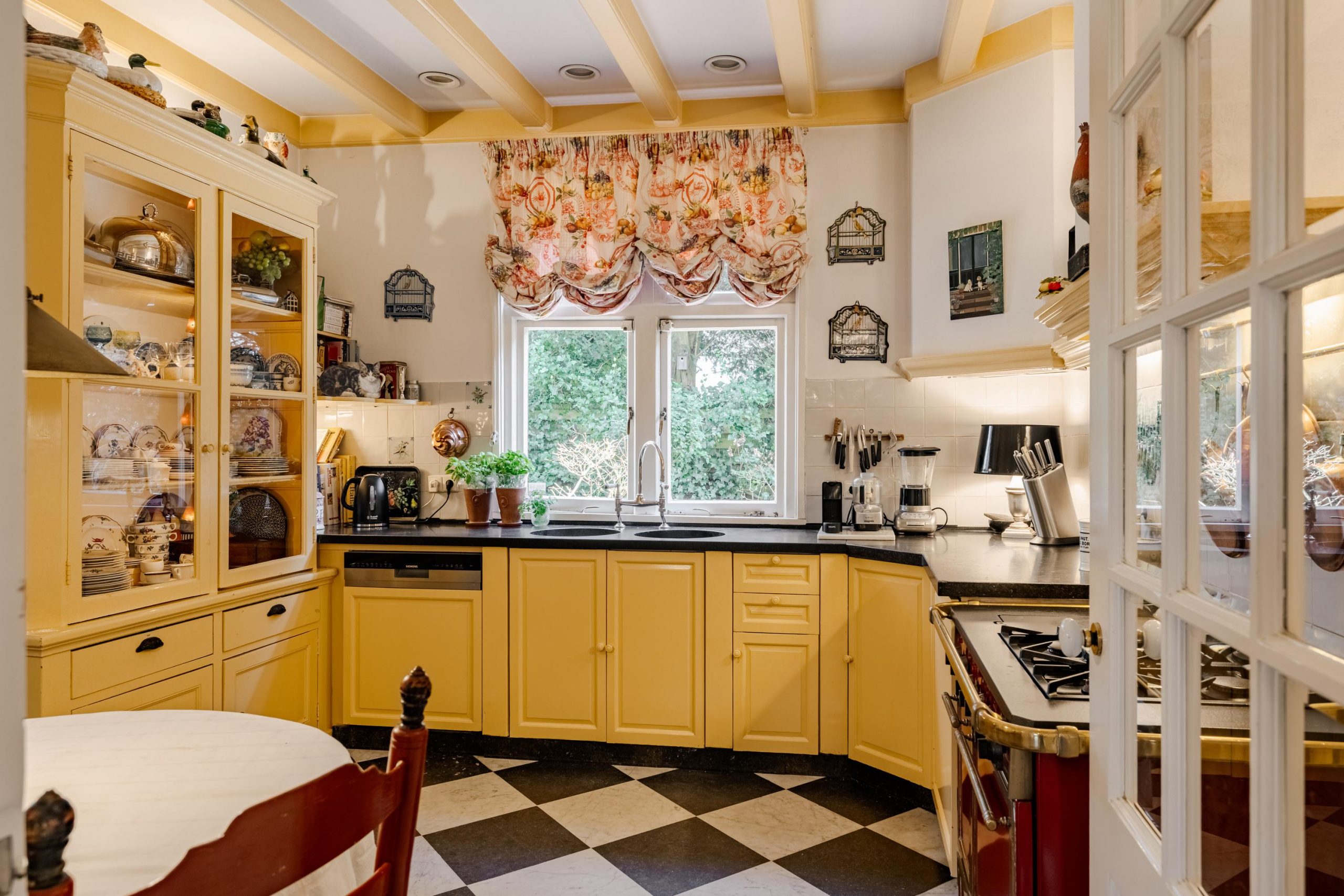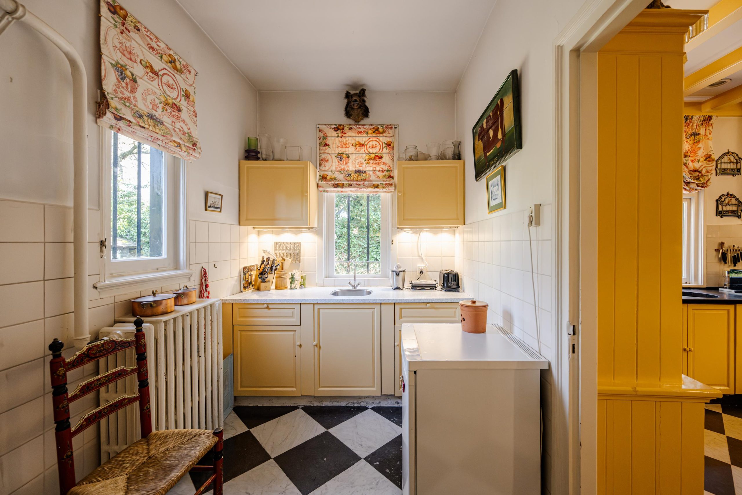 De keuken is ruim opgezet en voorzien van een klassiek fornuis en een praktische provisiekast. Aansluitend bevindt zich de bijkeuken met toegang tot de wasruimte, kelder en achtertuin. Ideaal voor het dagelijks gebruik.