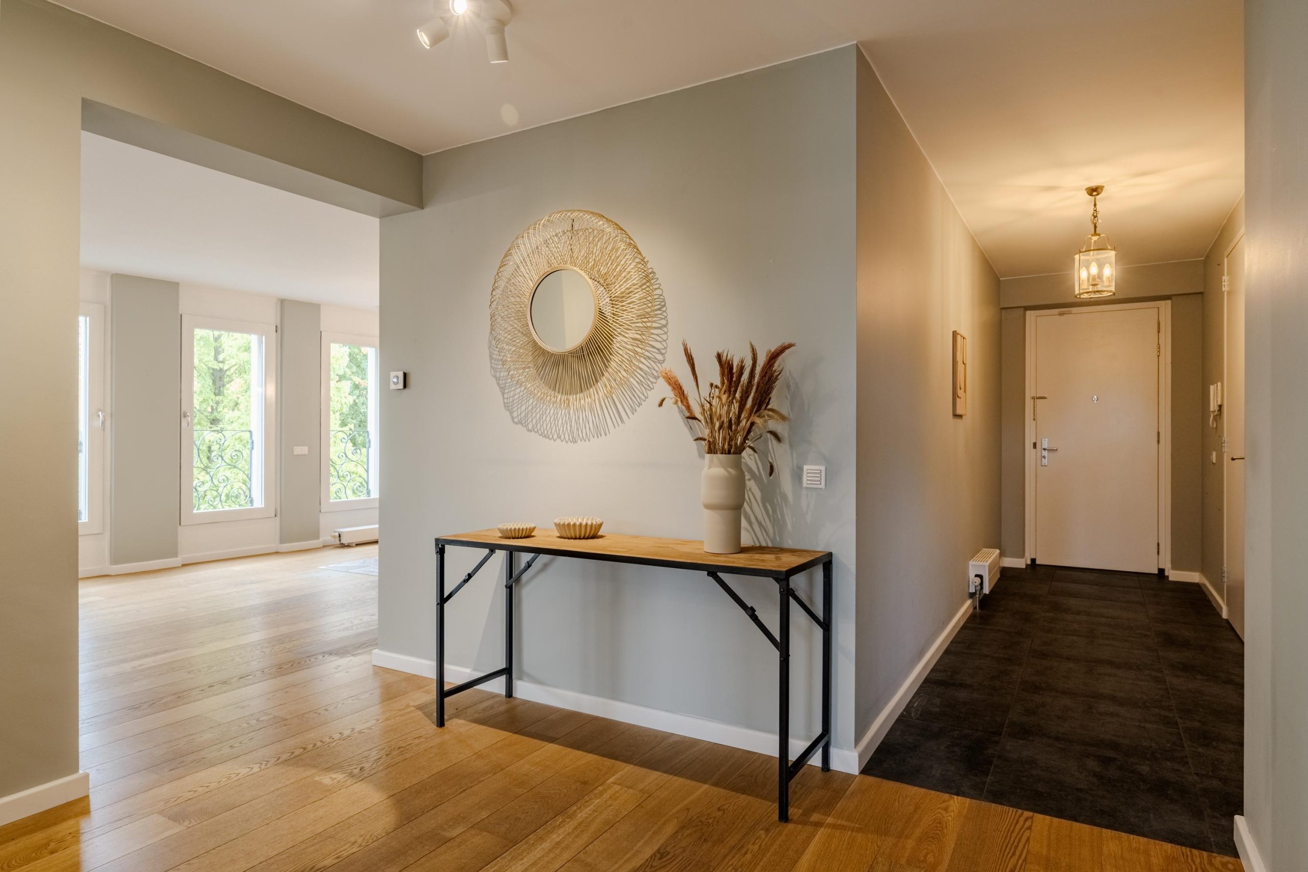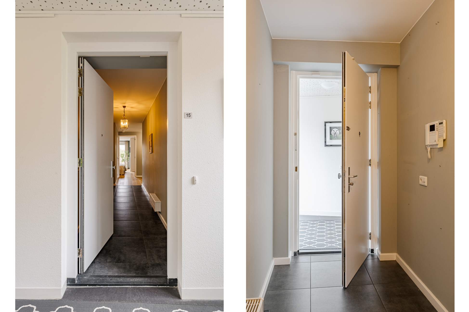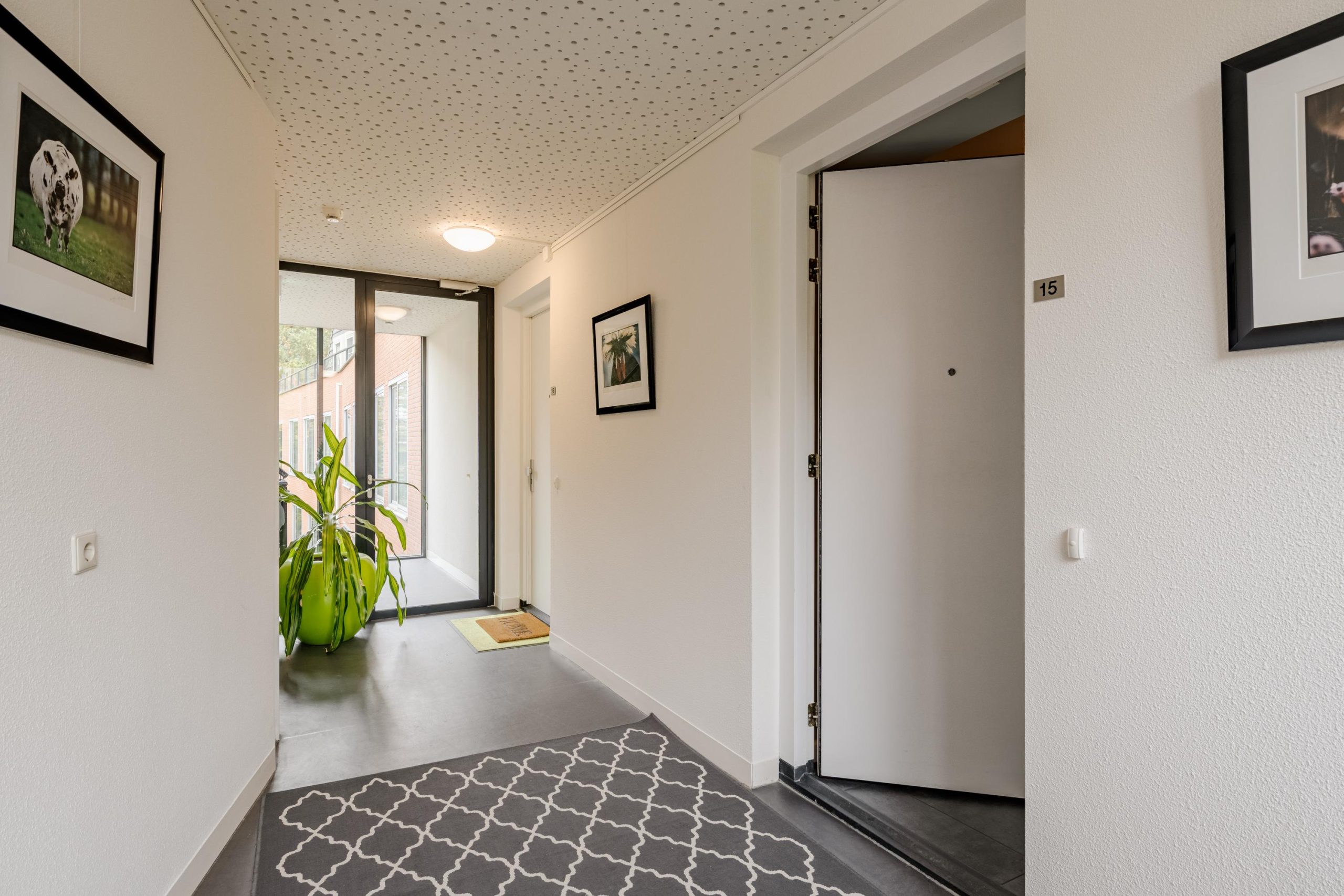 Via de verzorgde centrale hal met lift en trappenhuis bereik je het appartement. Binnenkomst in een ruime ontvangsthal met natuurstenen vloer, garderobe, apart toilet met fontein en een praktische inpandige berging met wasmachineaansluiting en de cv-installatie. De hal geeft direct toegang tot alle ruimtes van de woning.