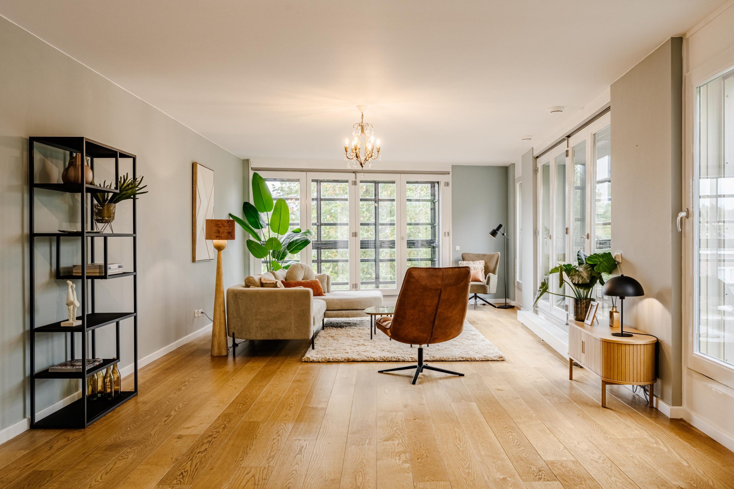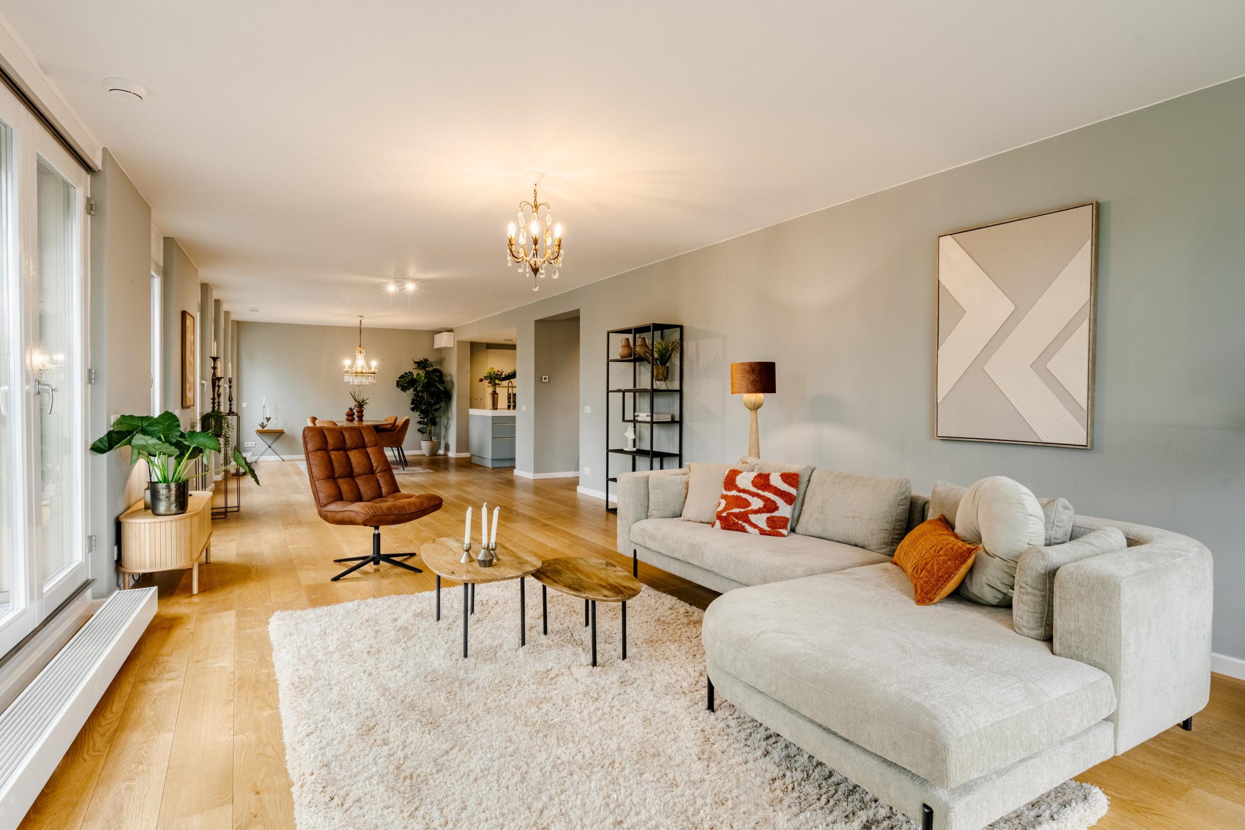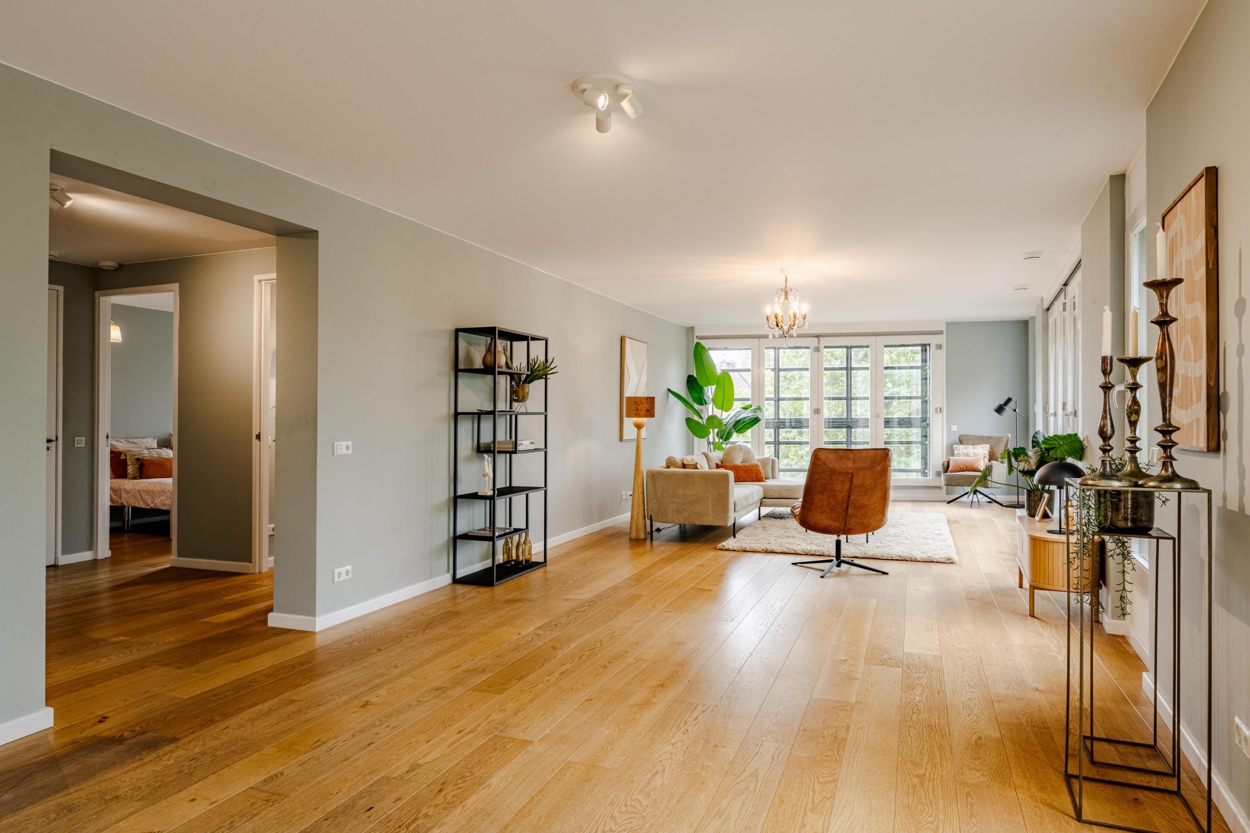 De royale living is heerlijk licht dankzij de grote raampartijen en kijkt uit over het groen. De woonkamer is voorzien van een houten vloer, airco, en elektrische blinds. Aan beide zijden zijn er inpandige balkons, zodat je beschut buiten kunt zitten met zicht op groen, zelfs op minder zonnige dagen.