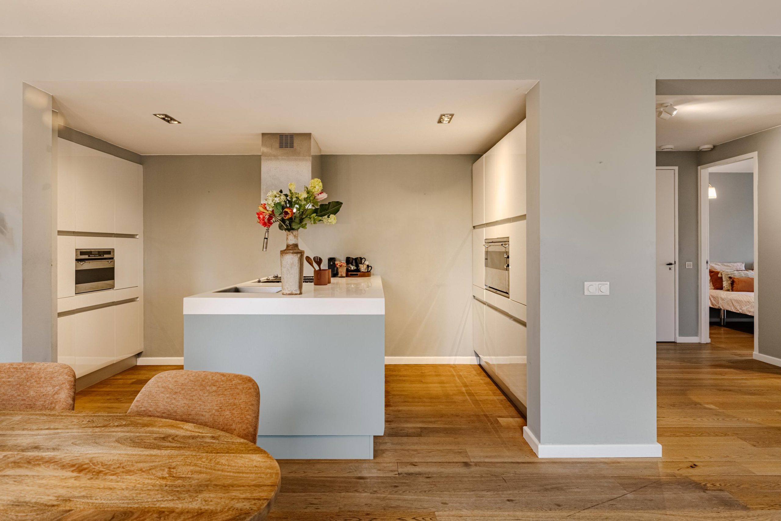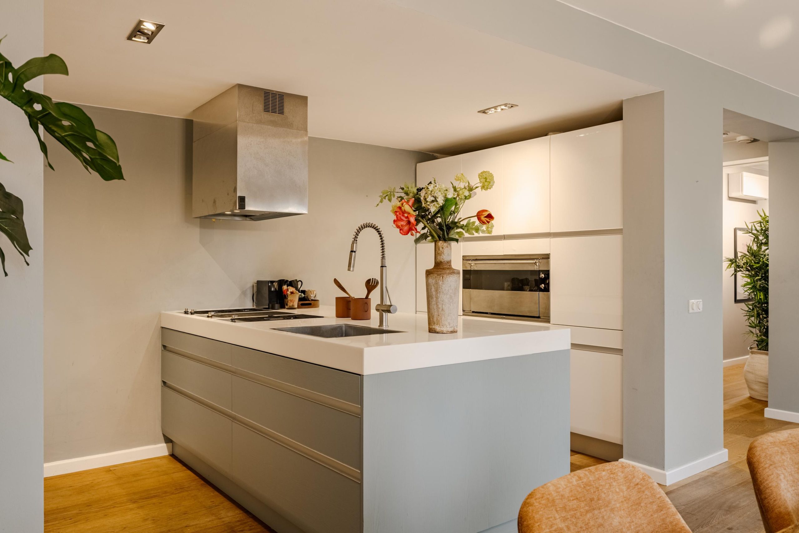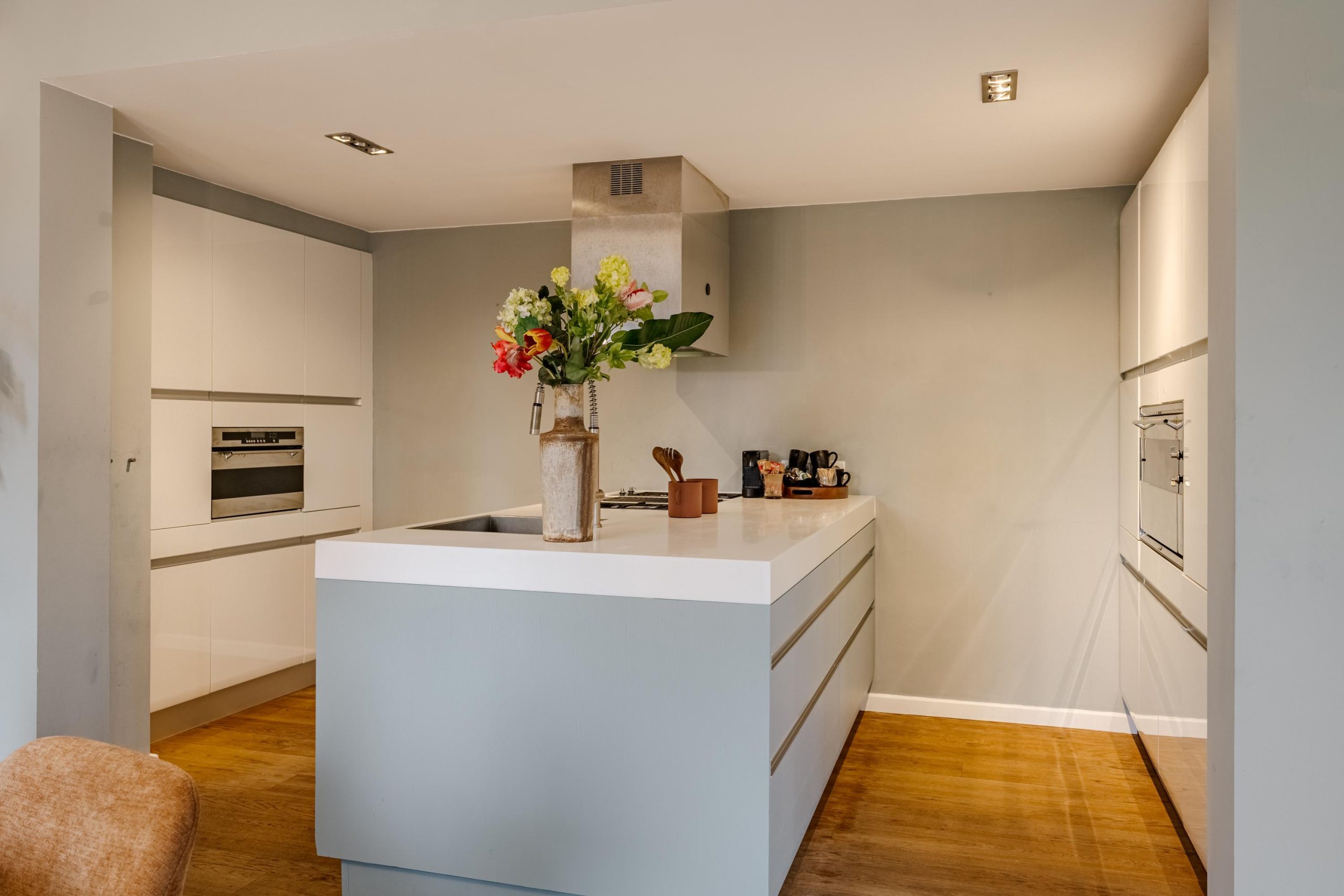 De open woonkeuken is stijlvol en volledig uitgerust. Je vindt hier een kookplaat met drie gaspitten en een aparte gril, een vaatwasser, een inbouw koel-vriescombinatie, veel kastruimte en een strakke afzuigkap. Het keukenblok is slim geplaatst, met veel werk- en bergruimte in lades onder het blad.