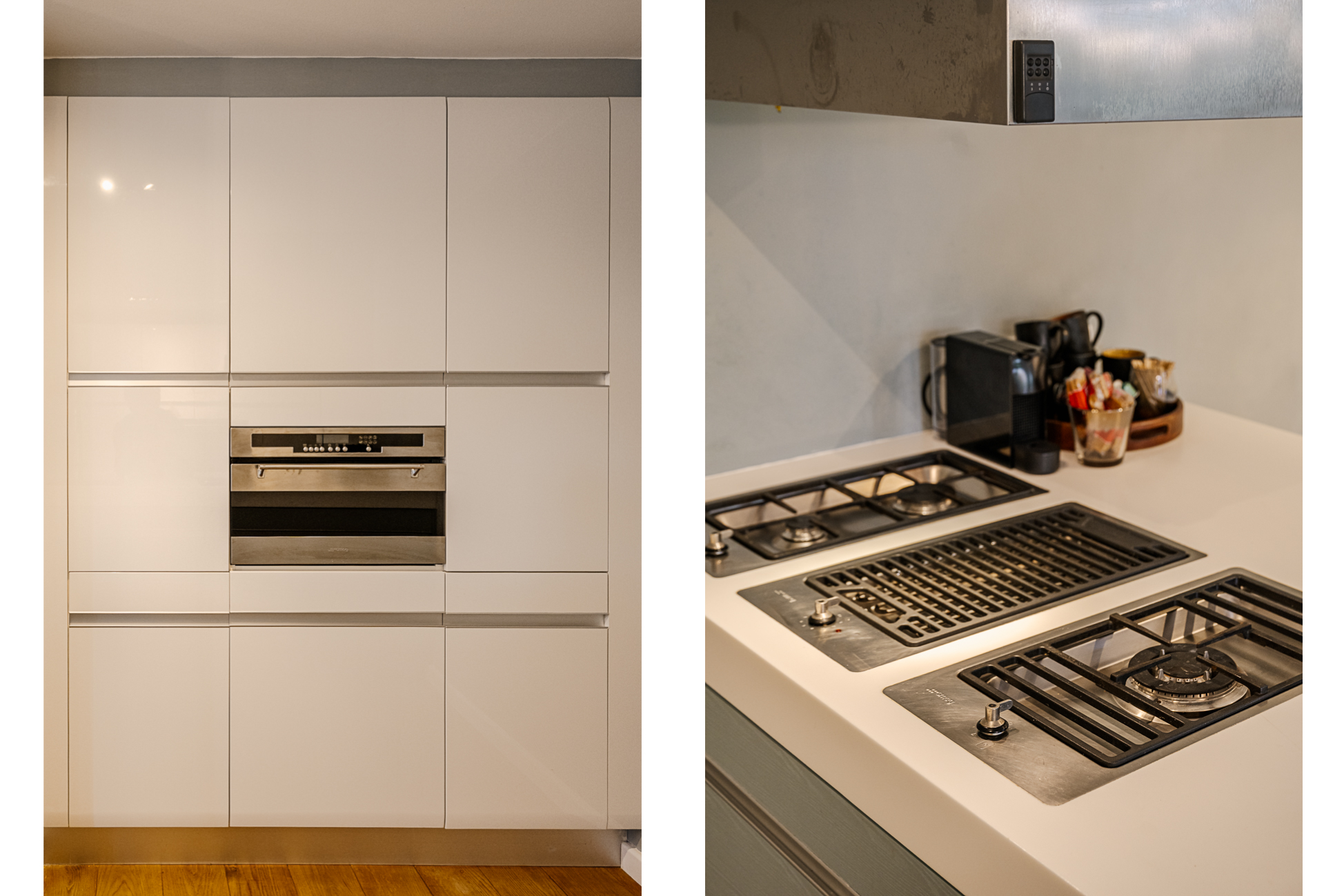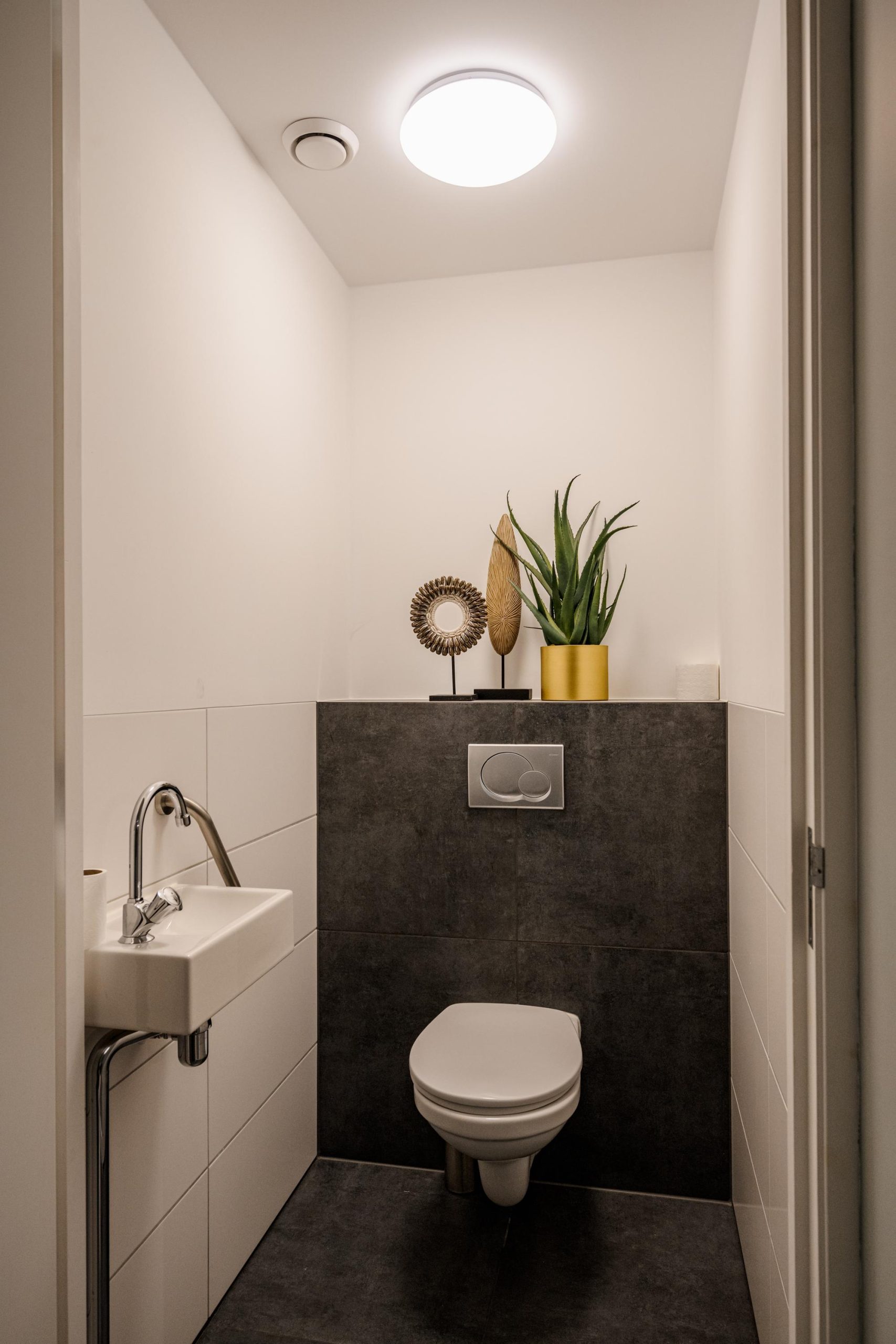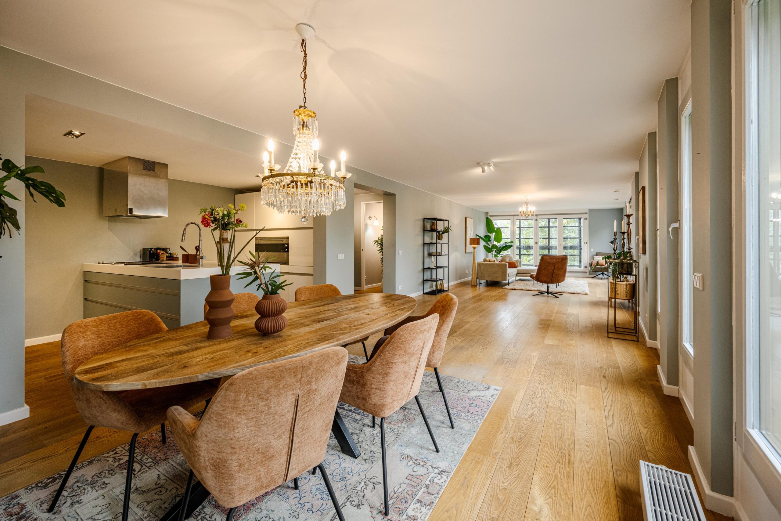 De open woonkeuken is stijlvol en volledig uitgerust. Je vindt hier een kookplaat met drie gaspitten en een aparte gril, een vaatwasser, een inbouw koel-vriescombinatie, veel kastruimte en een strakke afzuigkap. Het keukenblok is slim geplaatst, met veel werk- en bergruimte in lades onder het blad.