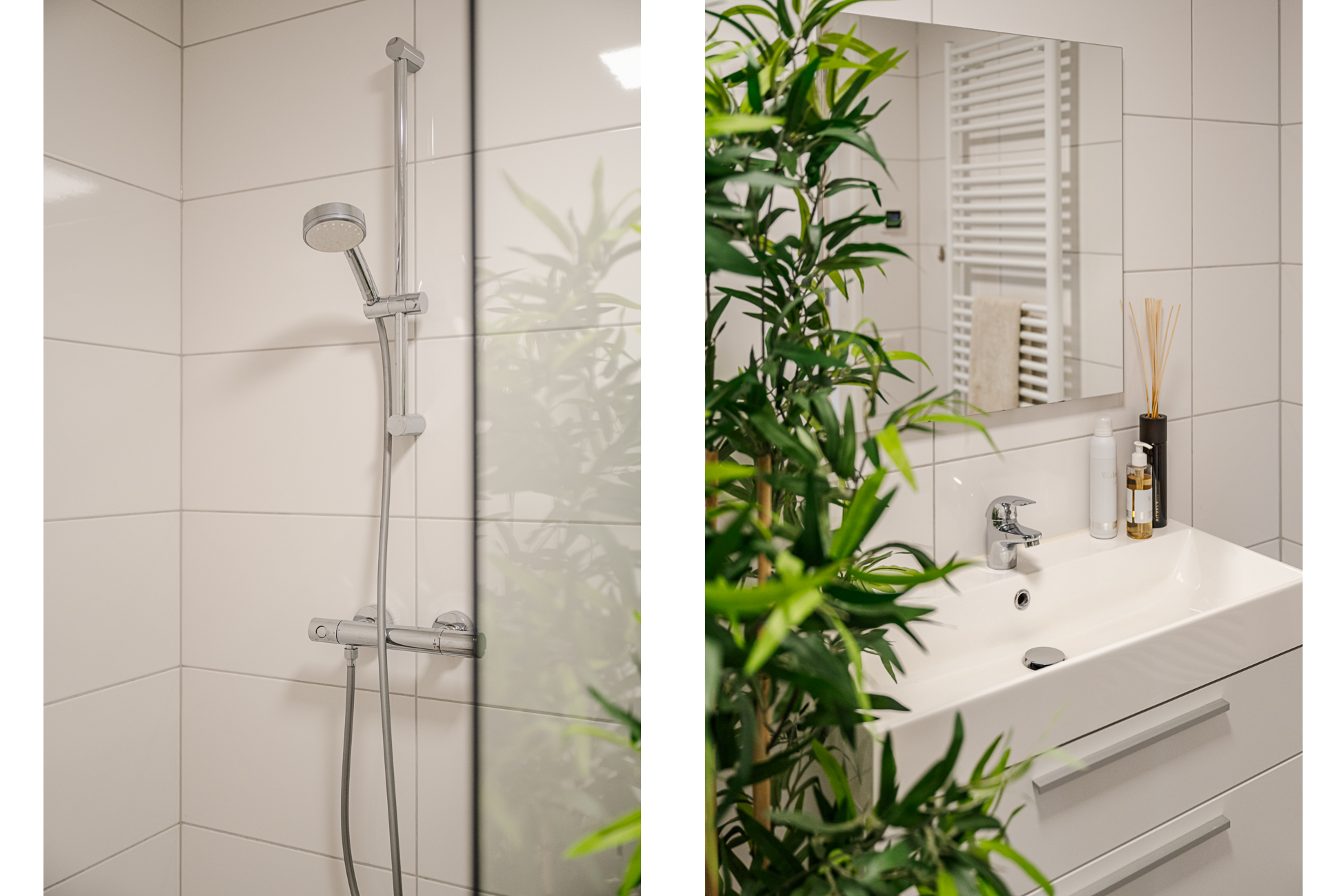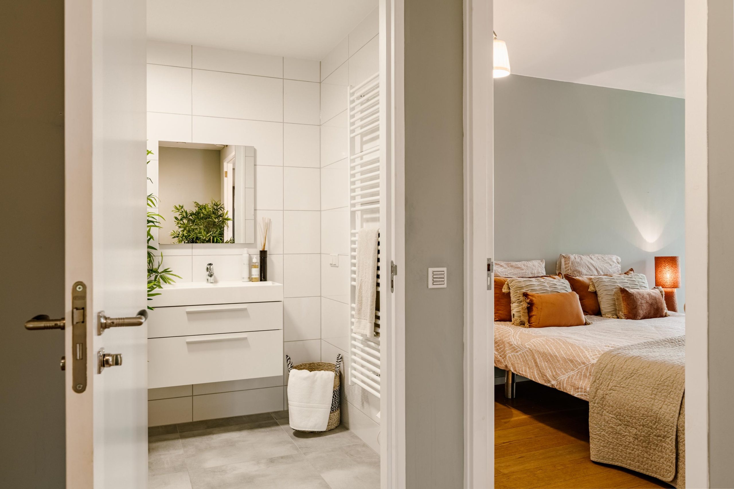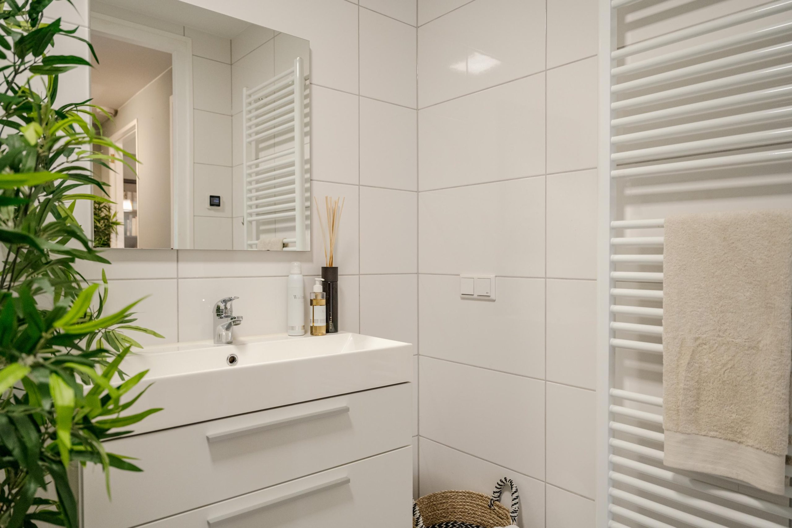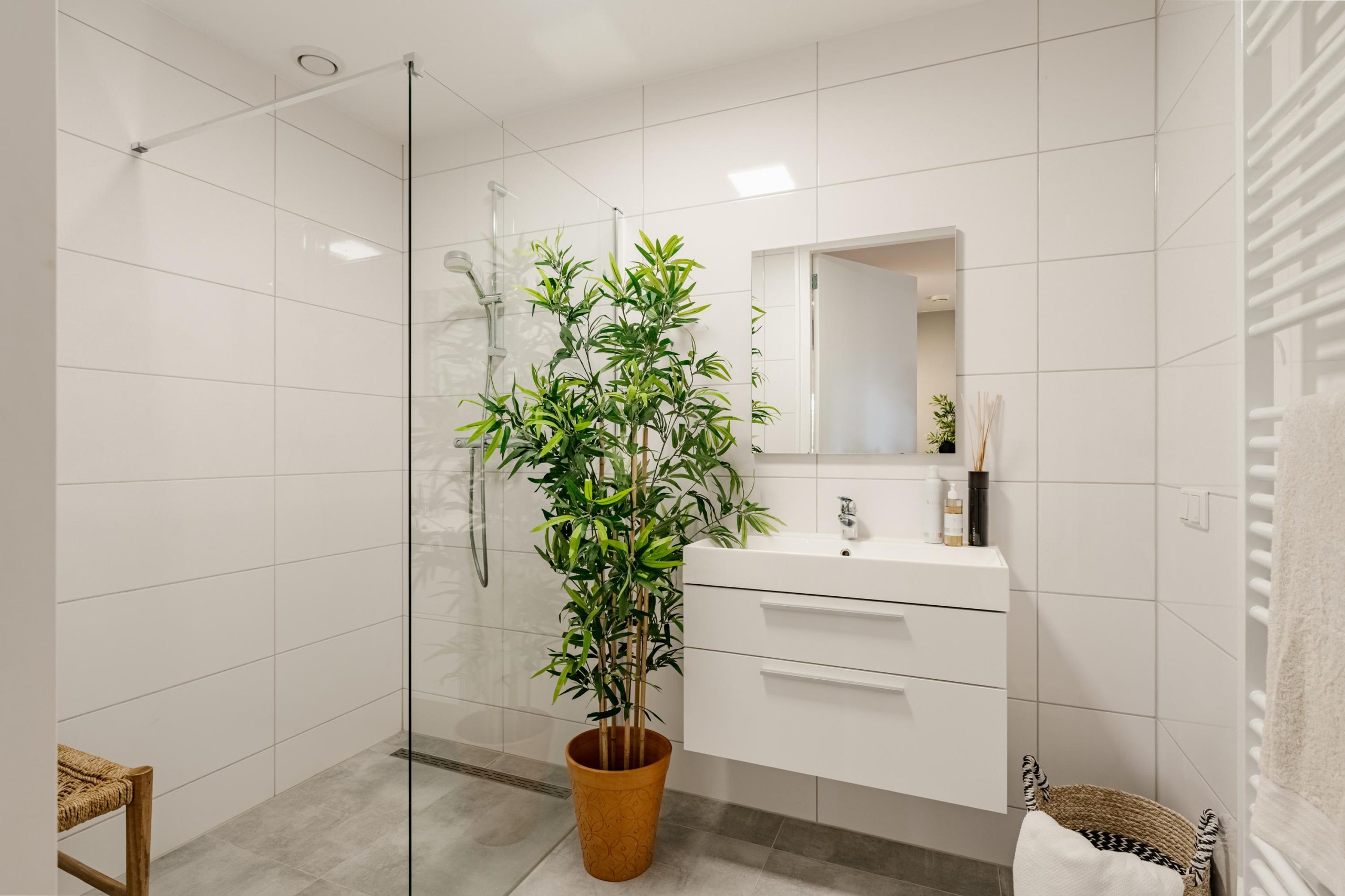 De badkamer is modern, licht en luxe: met vloerverwarming, een ruime inloopdouche en een wastafelmeubel met lades. Alles strak afgewerkt in lichte tinten.