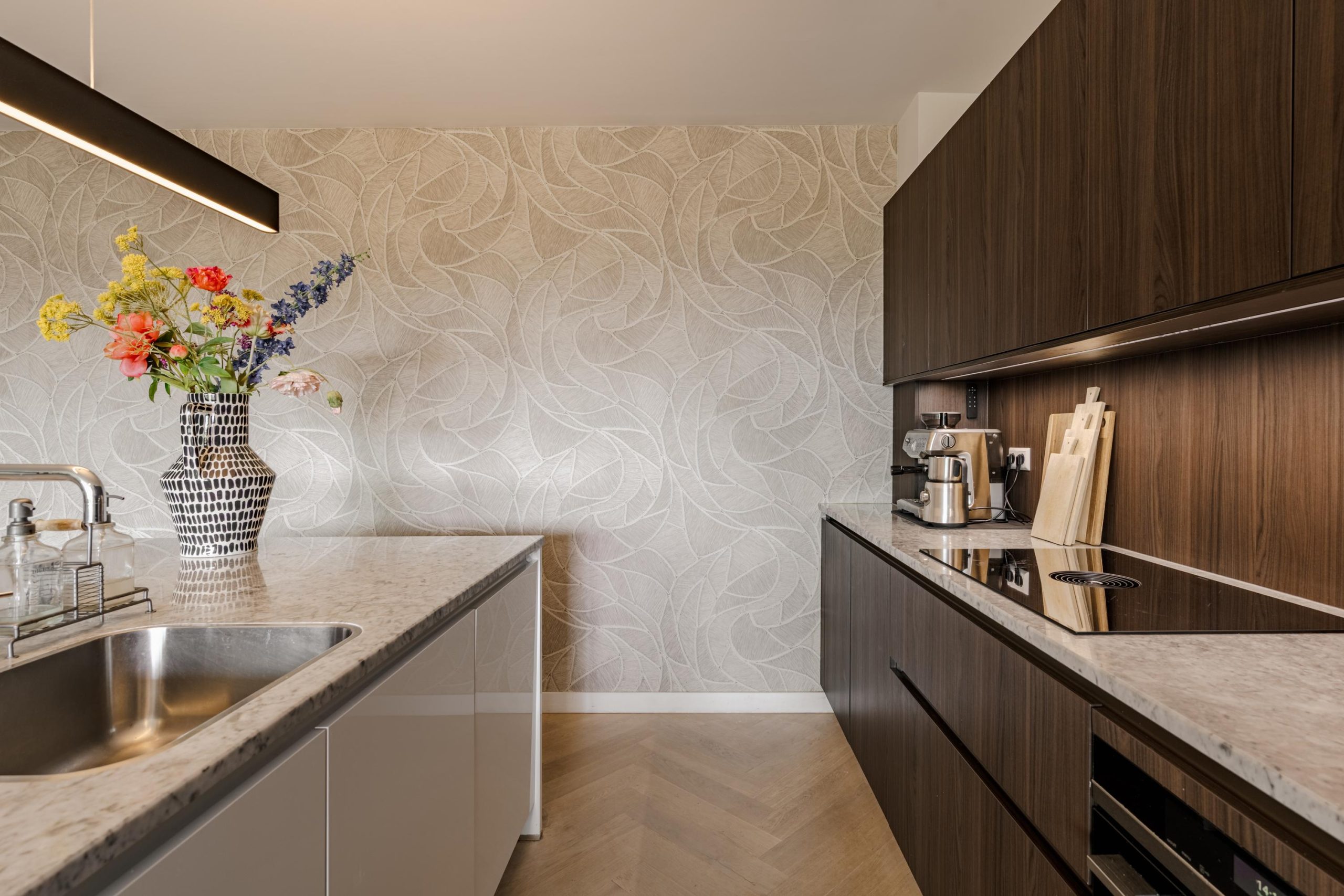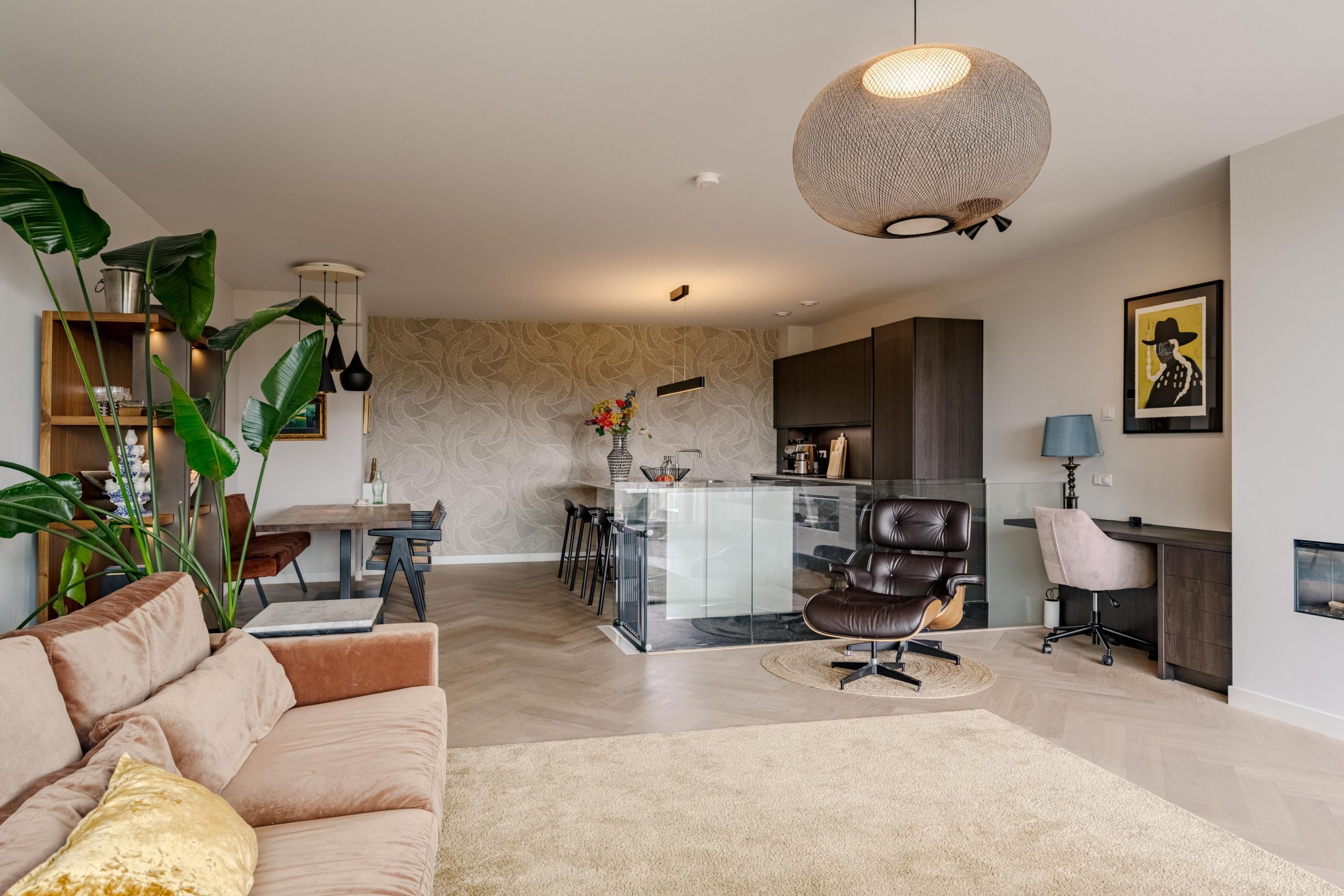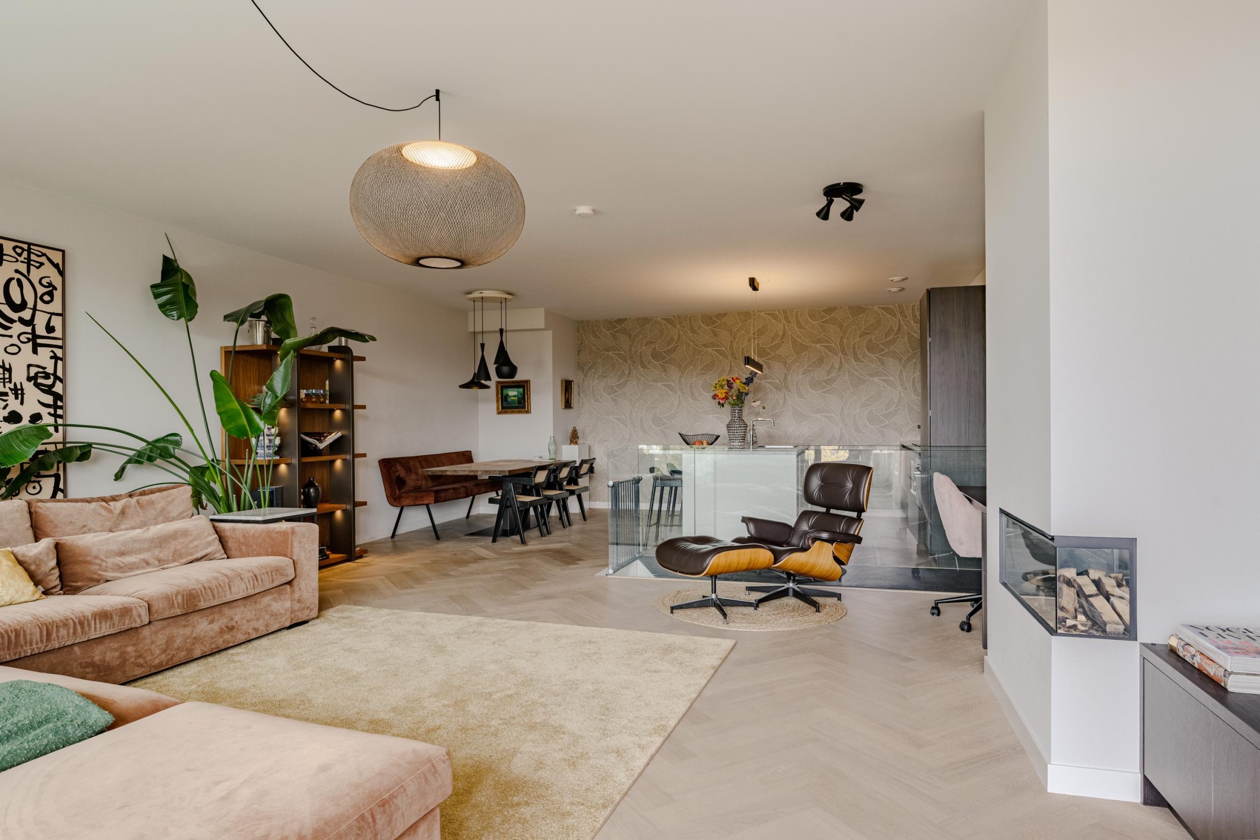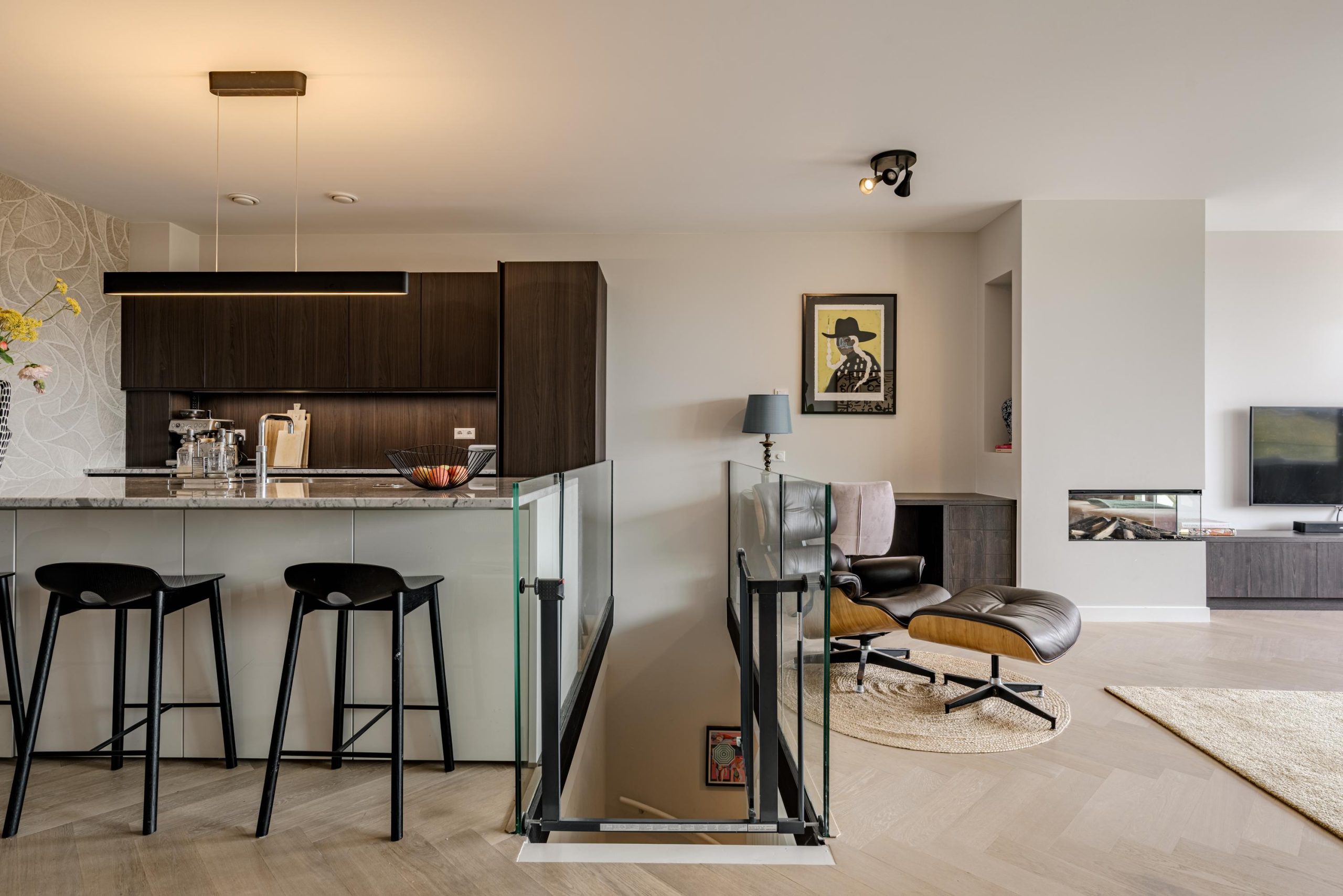 Via de vaste trap bereik je de lichte woonkamer met open keuken. De keuken is modern vormgegeven en voorzien van een inductiekookplaat en hoogwaardige inbouwapparatuur.
