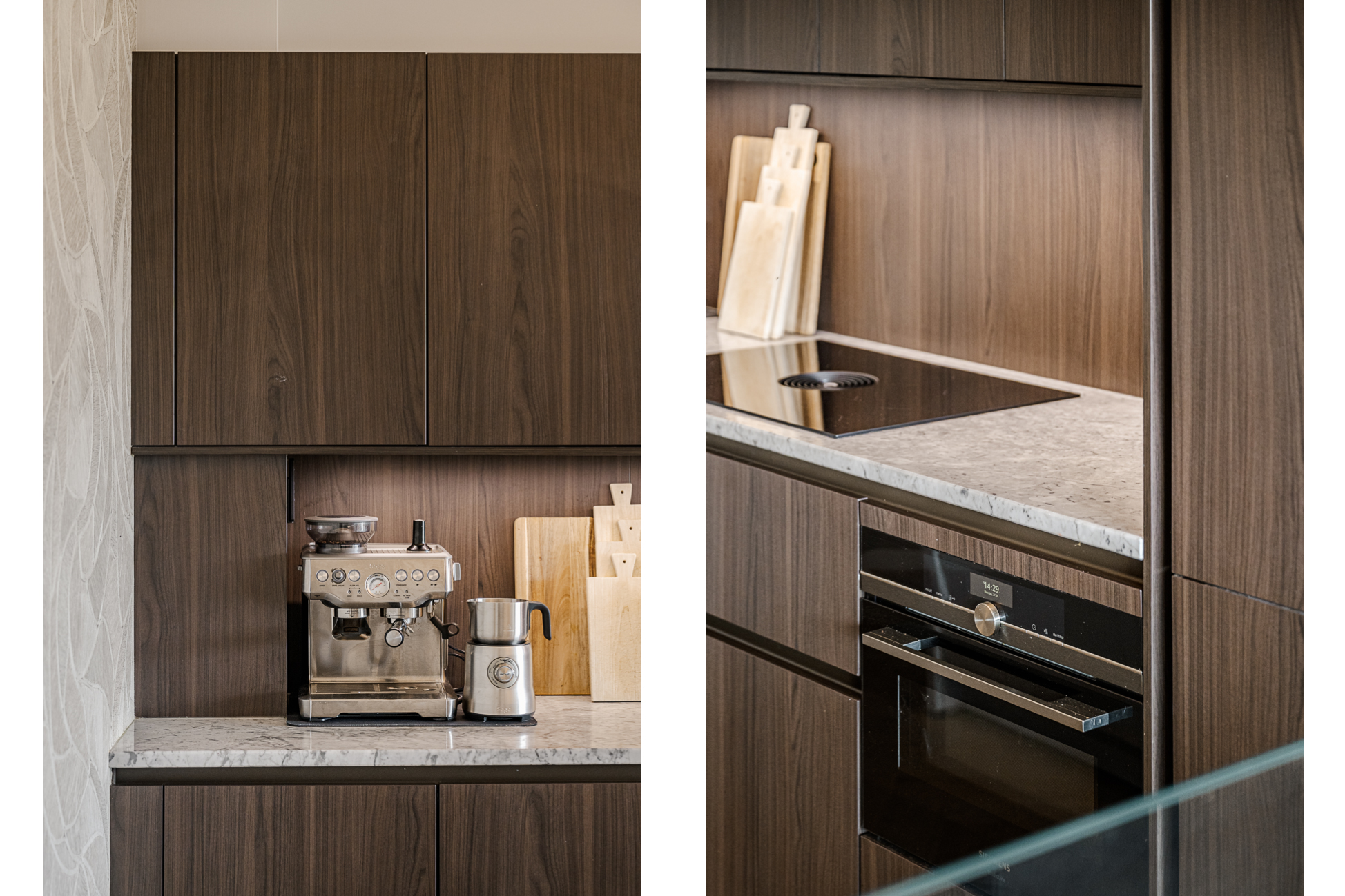 Thanks to the large windows and beautiful views over the water, this is a wonderful space to relax. The herringbone wooden floor spans the living area, creating a warm and elegant ambiance.