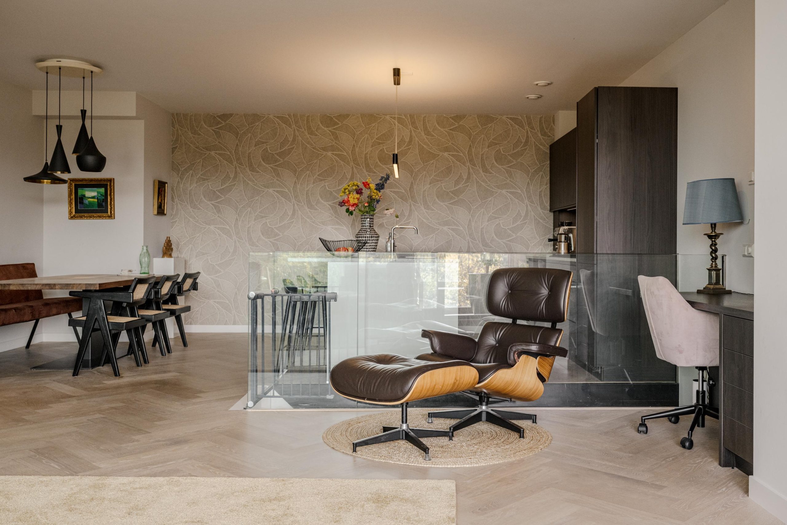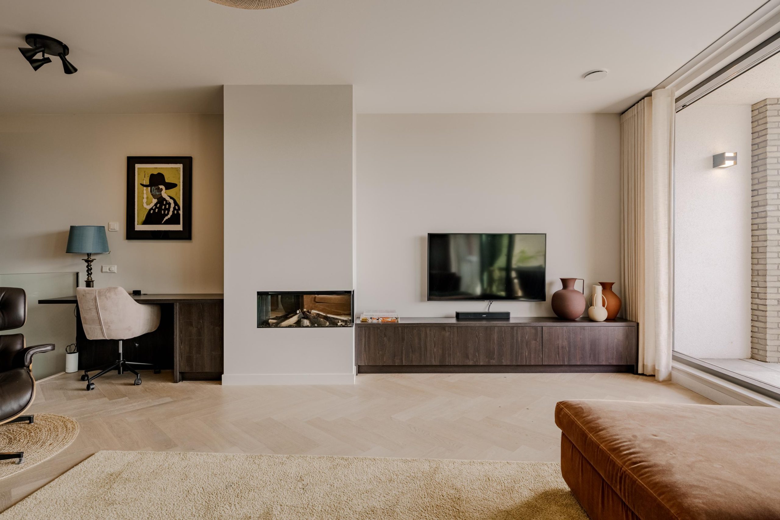Dankzij de grote ramen en het prachtige uitzicht over het water is dit een heerlijke plek om te ontspannen. De houten vloer in visgraatmotief loopt door over de gehele woonverdieping en geeft het interieur een warme, elegante uitstraling.