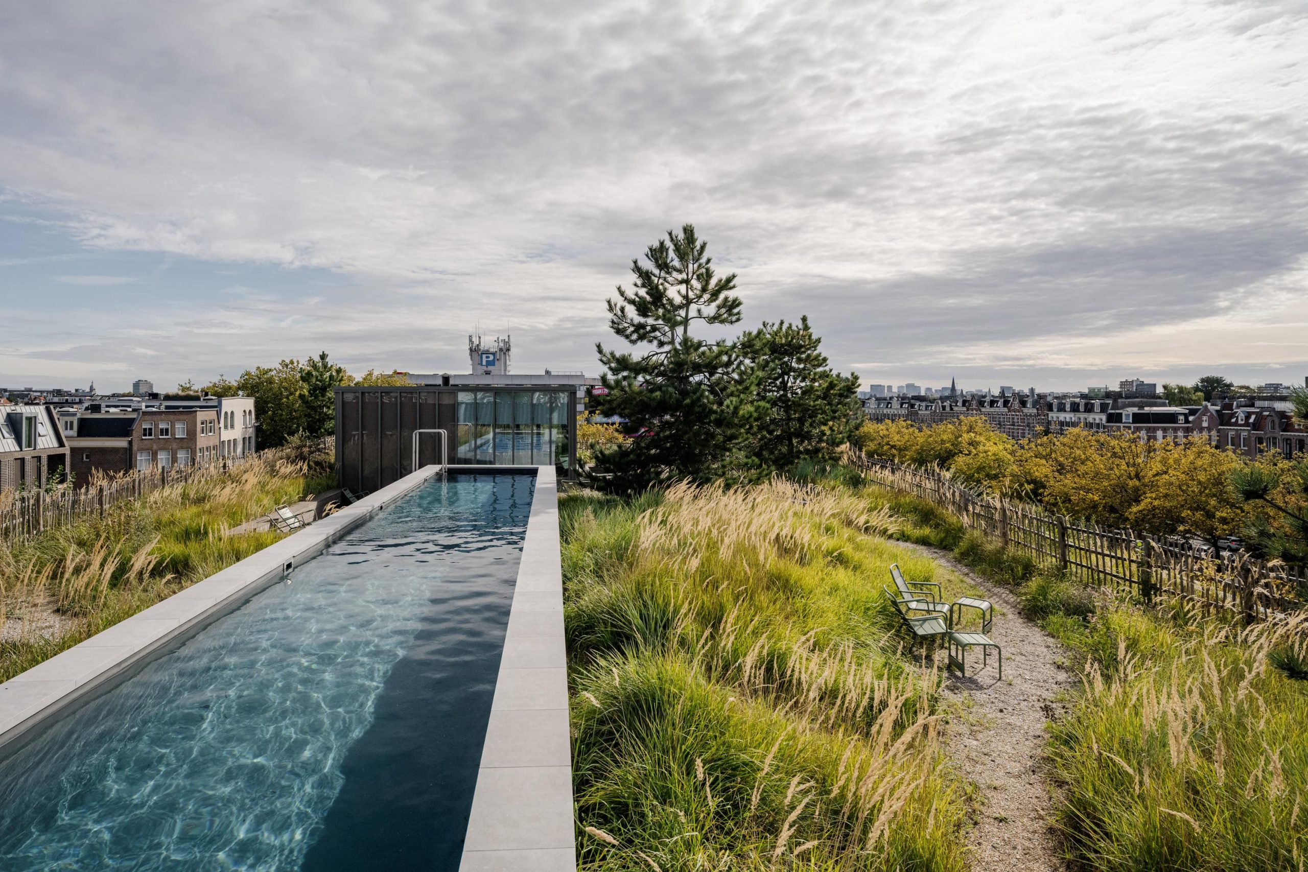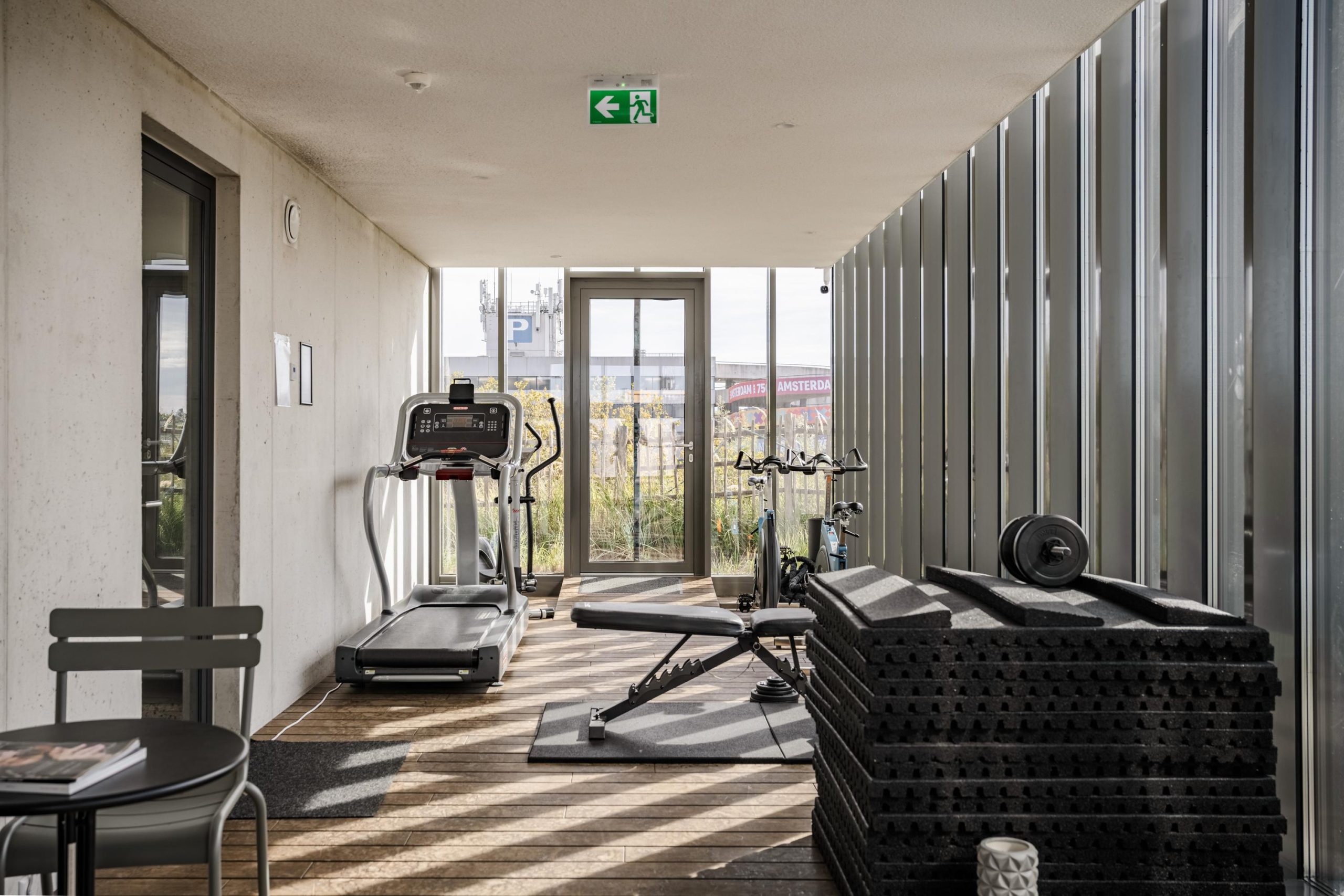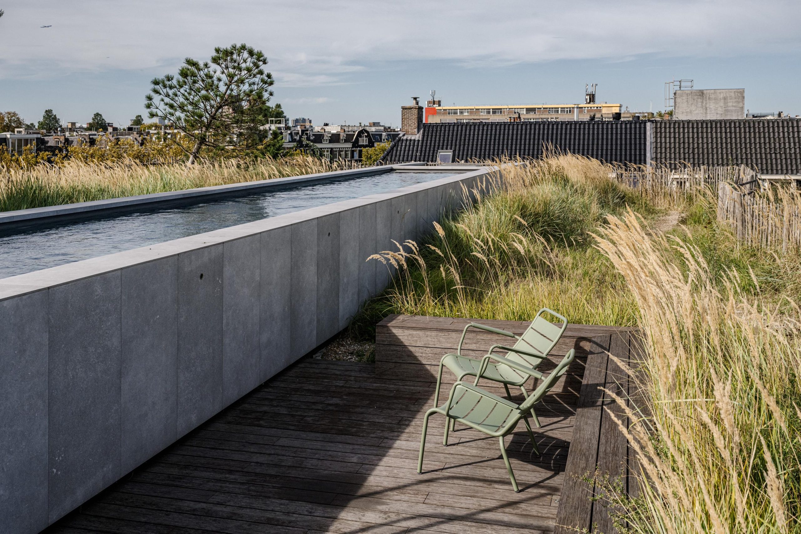 Tussen de helmgrassen en houten terrassen vind je zitgedeeltes om te ontspannen, een buitenzwembad om te zwemmen met uitzicht over Amsterdam, en een moderne gym om te sporten zonder de deur uit te gaan.