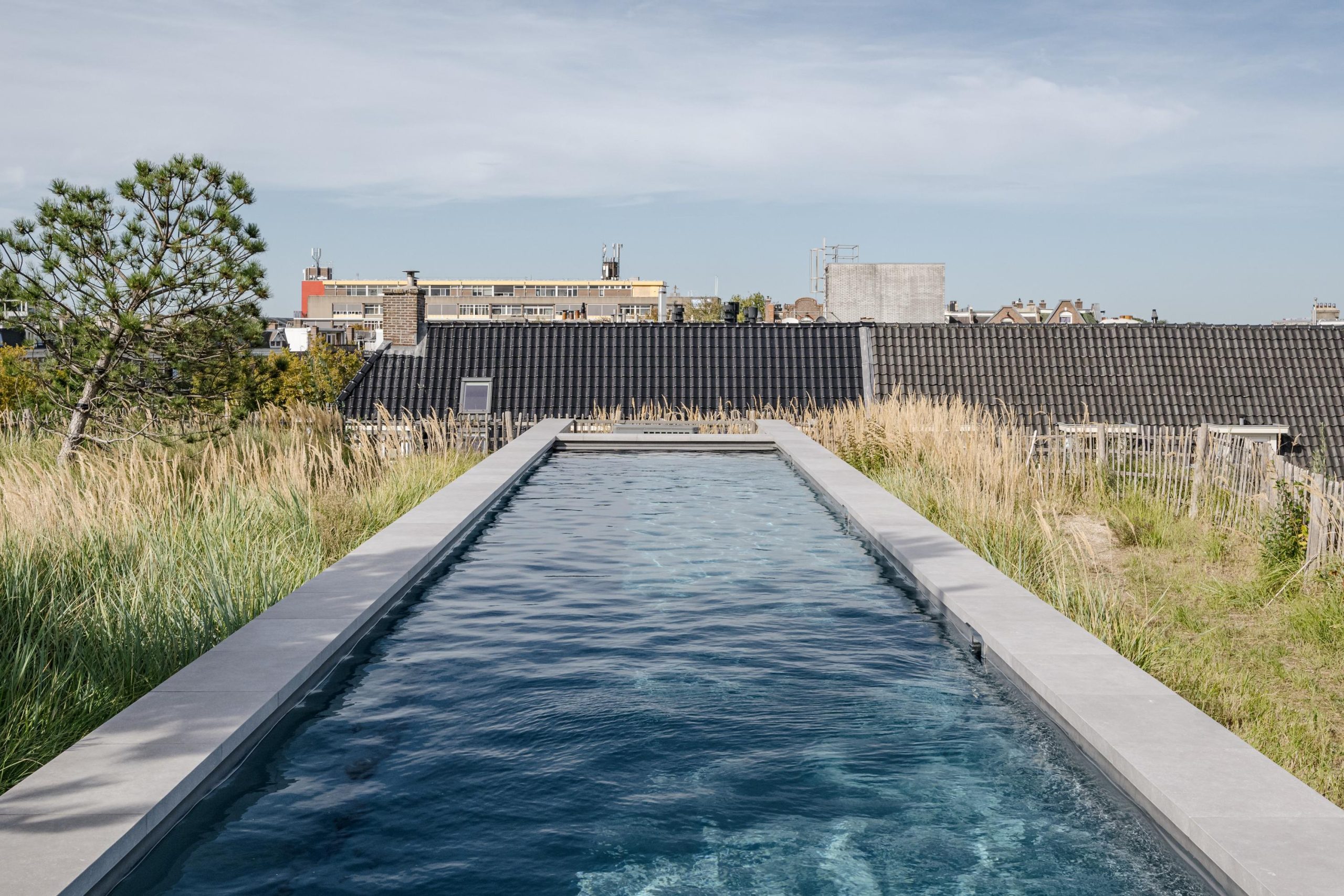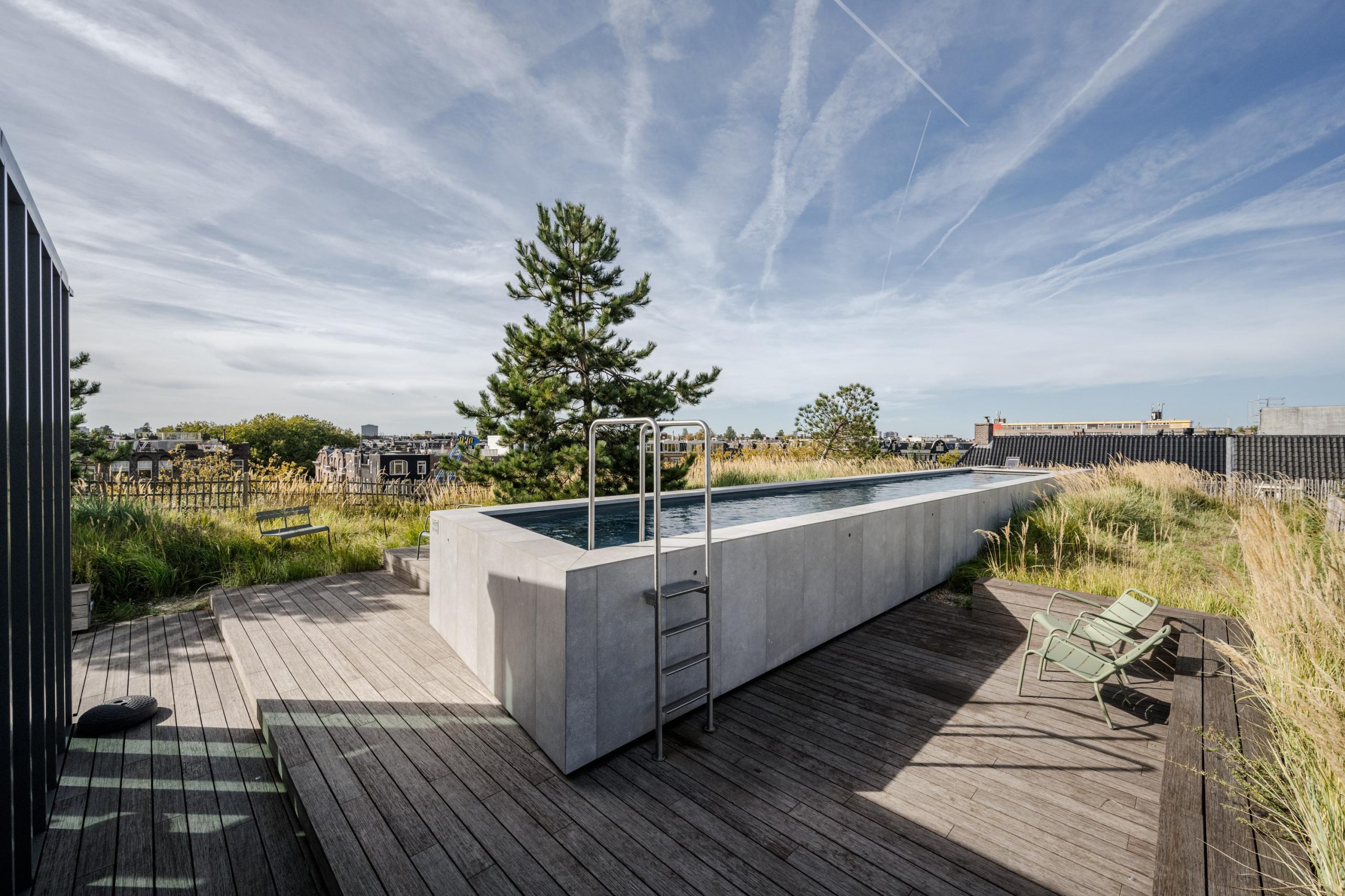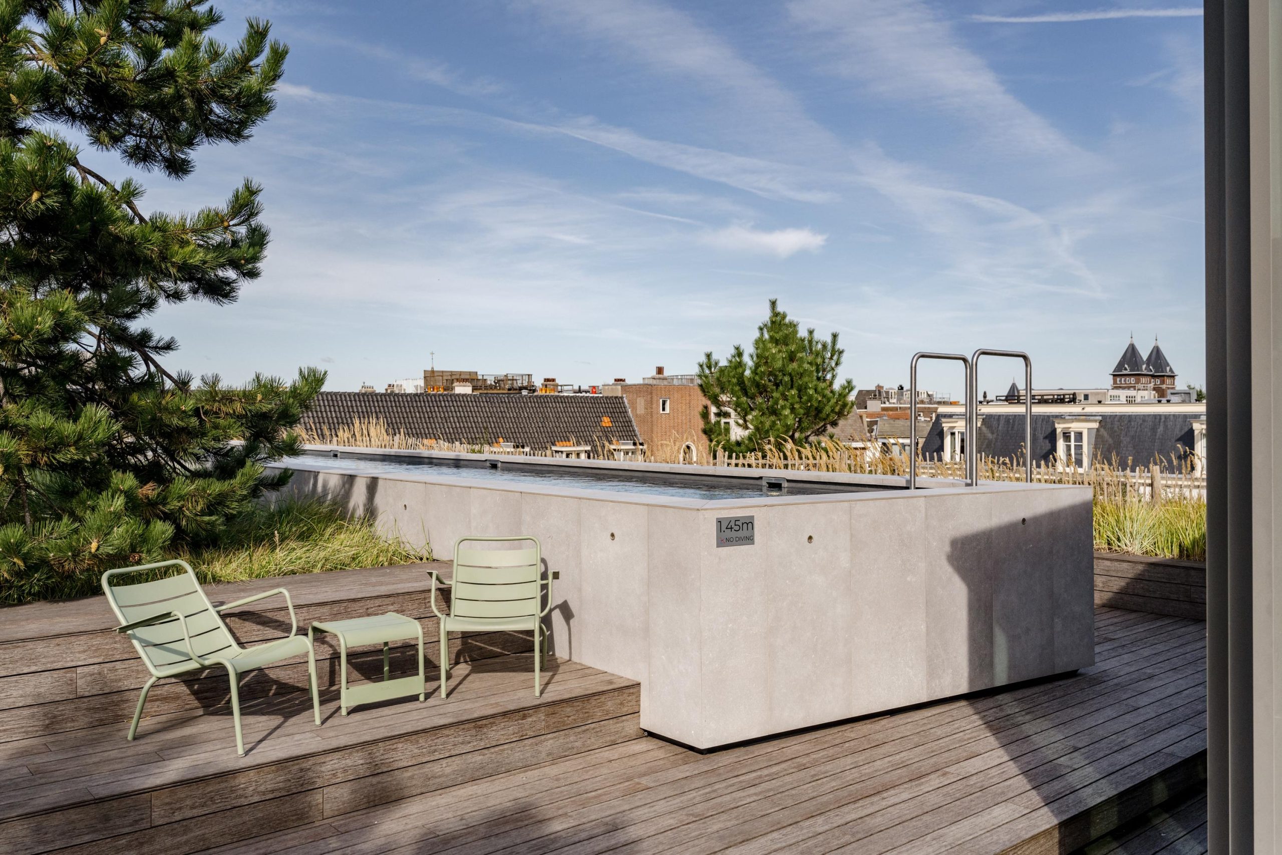 Tussen de helmgrassen en houten terrassen vind je zitgedeeltes om te ontspannen, een buitenzwembad om te zwemmen met uitzicht over Amsterdam, en een moderne gym om te sporten zonder de deur uit te gaan.