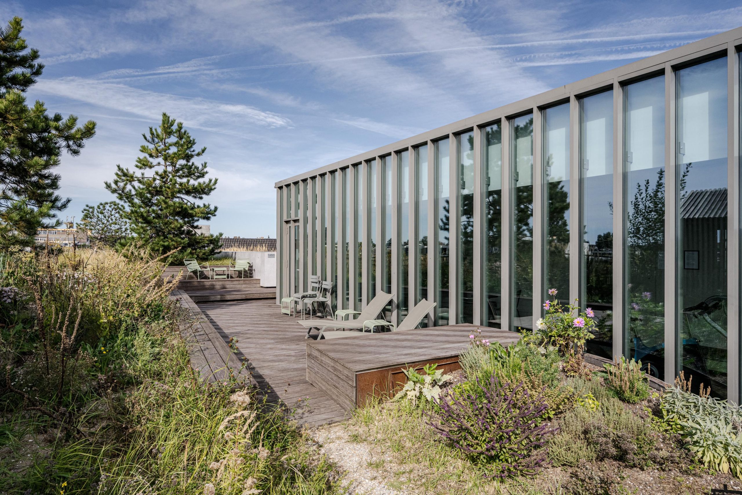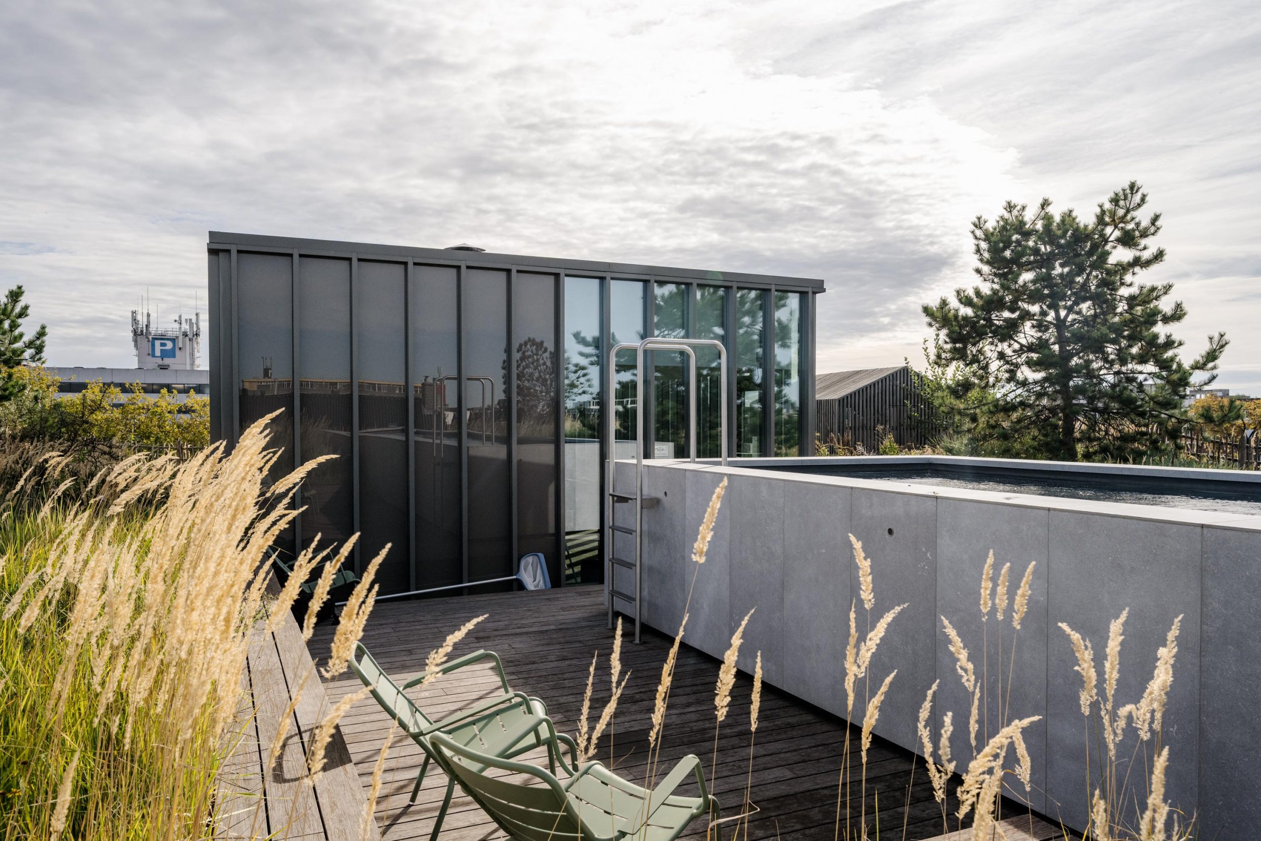 Amidst the dune grasses and wooden terraces, you’ll find seating areas for relaxation, an outdoor swimming pool with panoramic views over Amsterdam, and a modern gym where you can work out without ever leaving home.