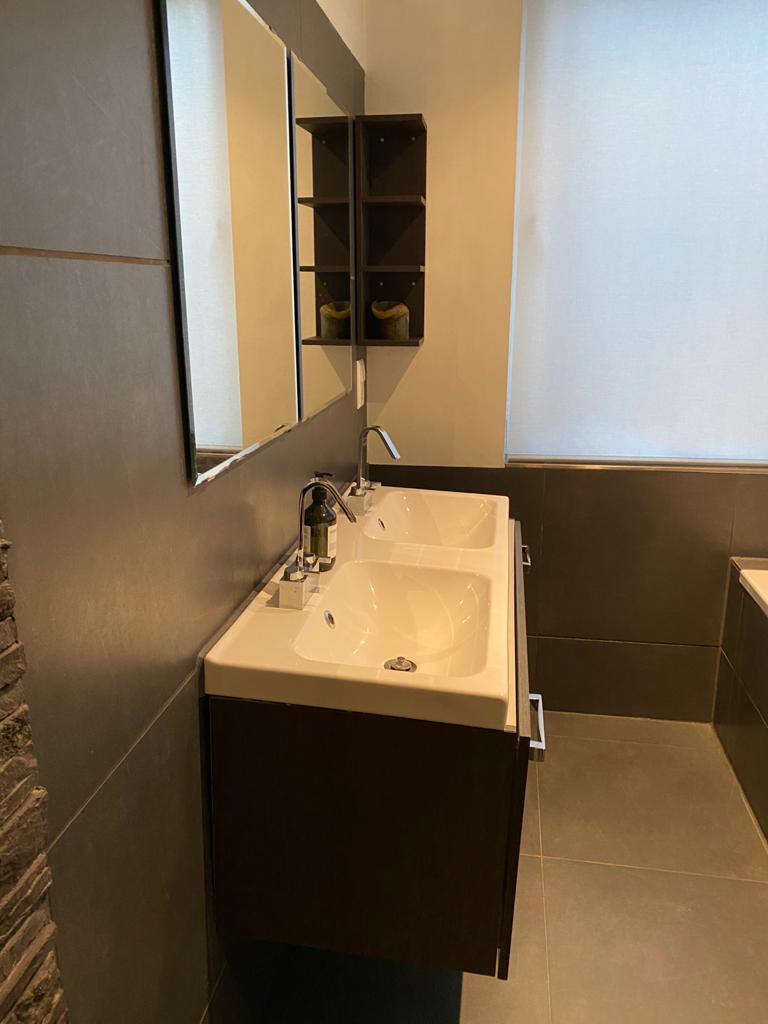 – Stylish bathroom with double basin vanity, bathtub and separate overhead shower, finished with dark stone tiling.
