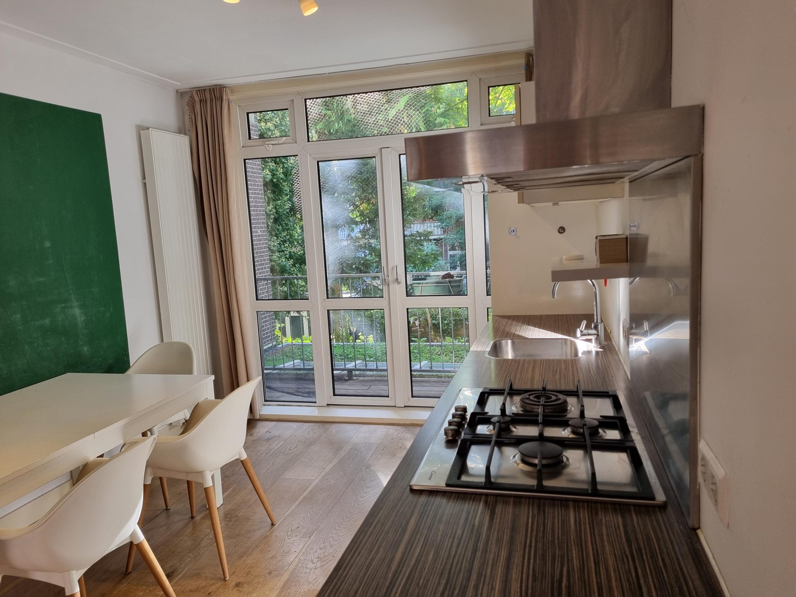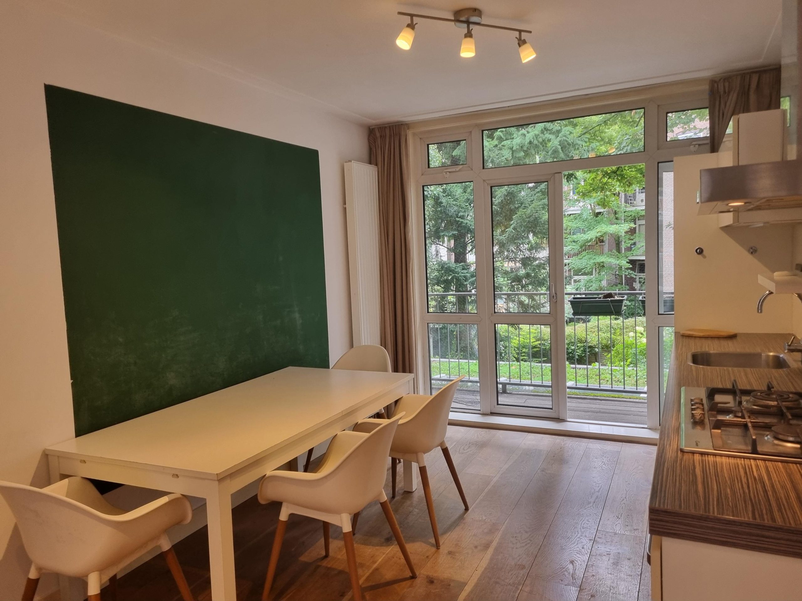 Binnen komt het licht je tegemoet: de open woonkamer, keuken en eetkamer liggen tussen twee sets openslaande deuren — aan de voorzijde met uitzicht over de lommerrijke straat, aan de achterzijde met een heerlijk rustig balkon aan de binnentuinen.