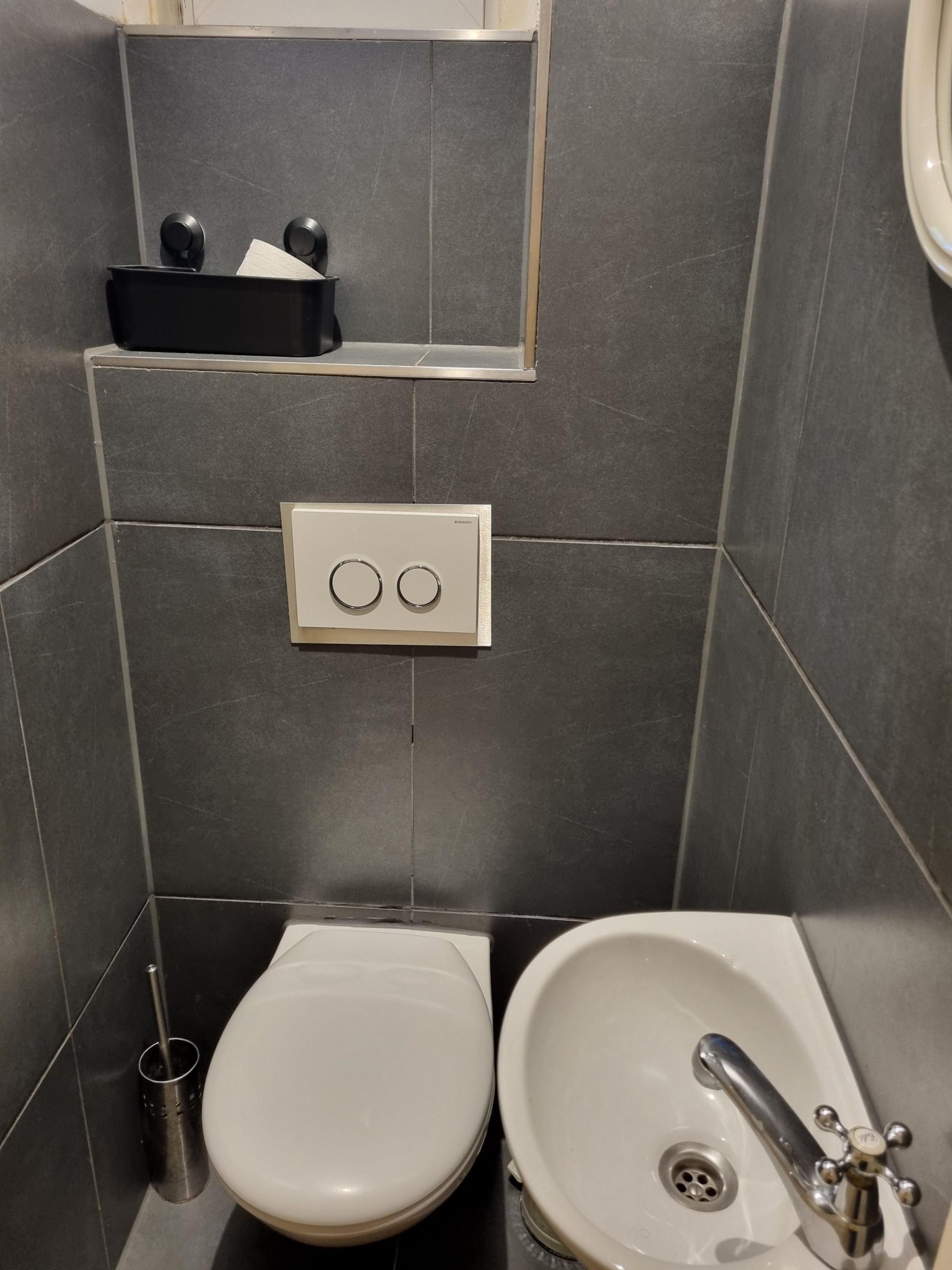 Aan de achterzijde ligt de ruime hoofdslaapkamer, terwijl de tweede kamer ideaal is als logeerplek, kinderkamer of thuiskantoor. De badkamer is stijlvol afgewerkt met donkere natuurstenen tegels, een ligbad, aparte douche en dubbele wastafel. Daarnaast is er een separaat toilet in dezelfde smaakvolle stijl.