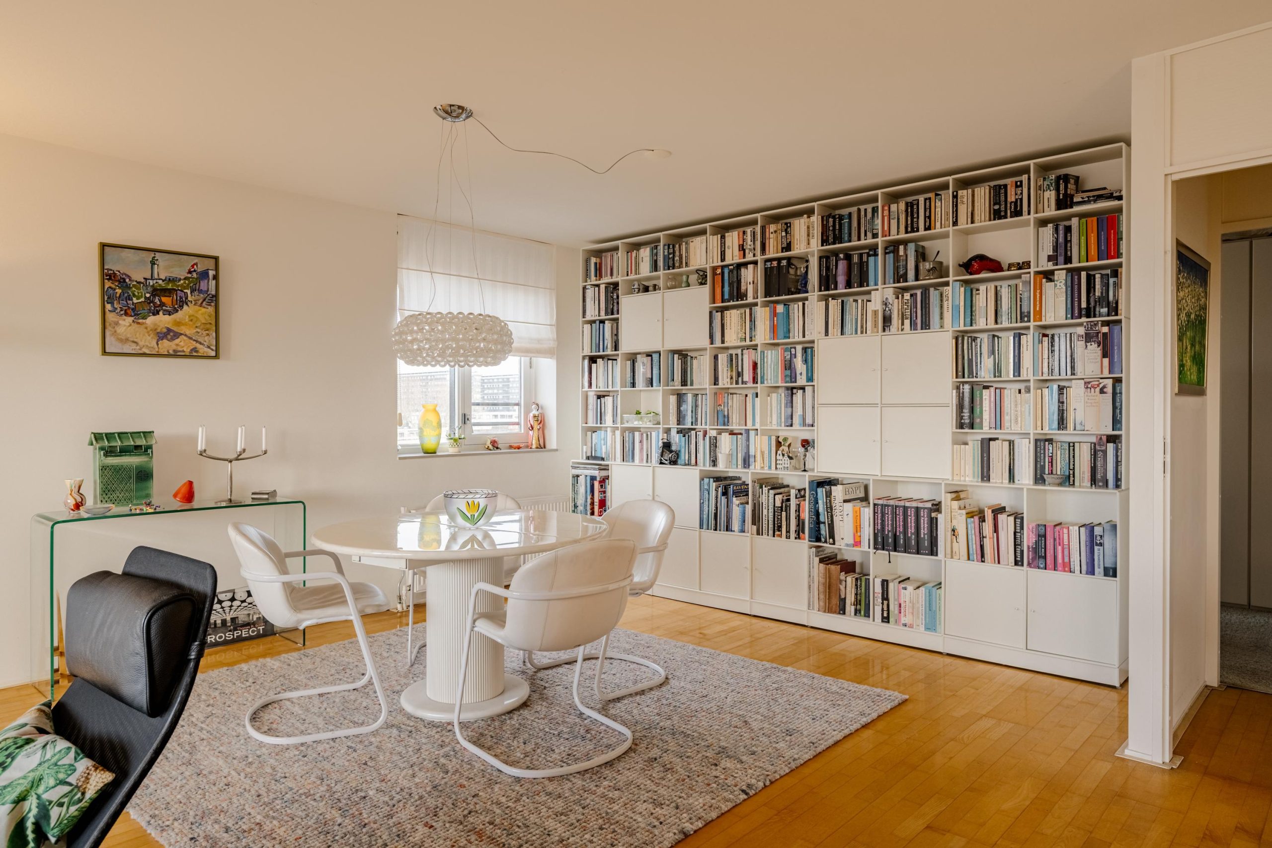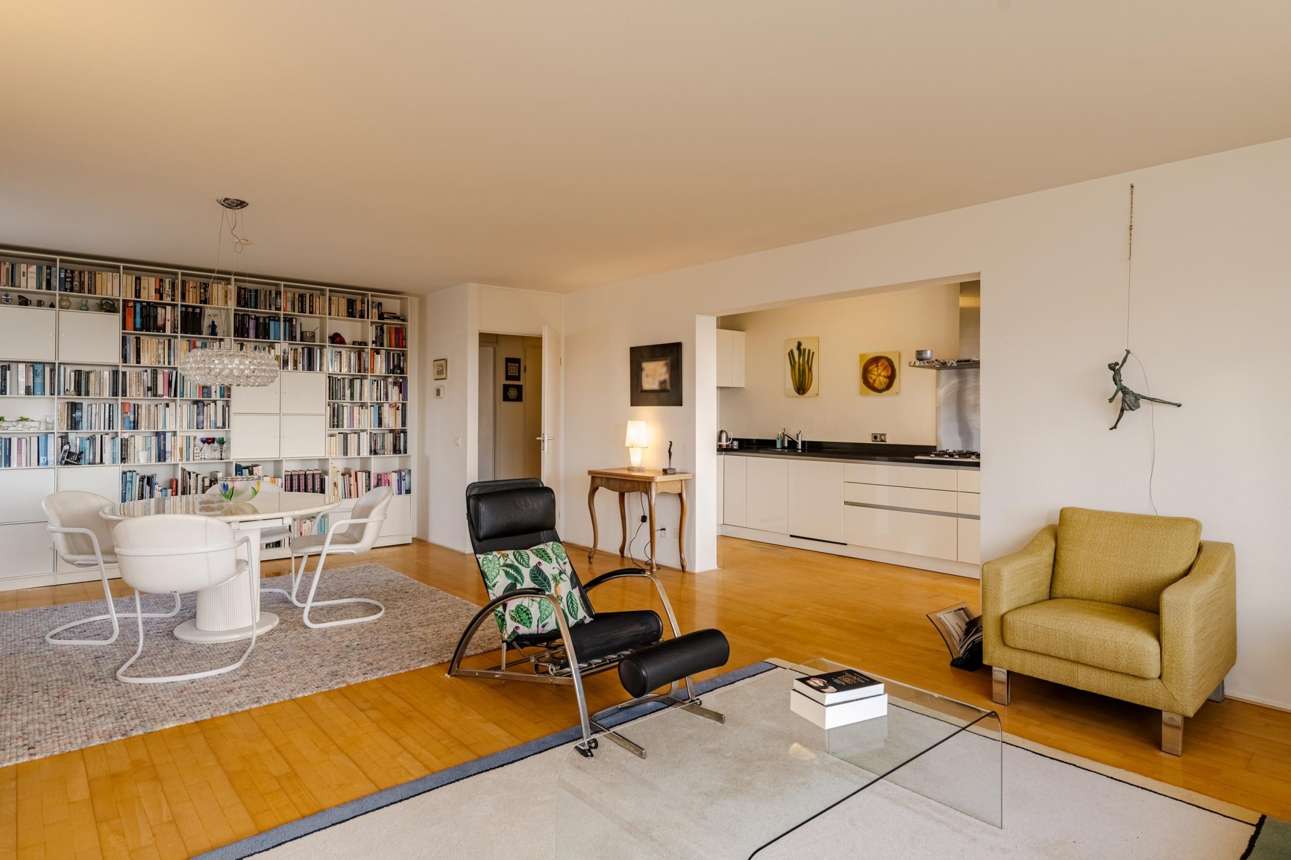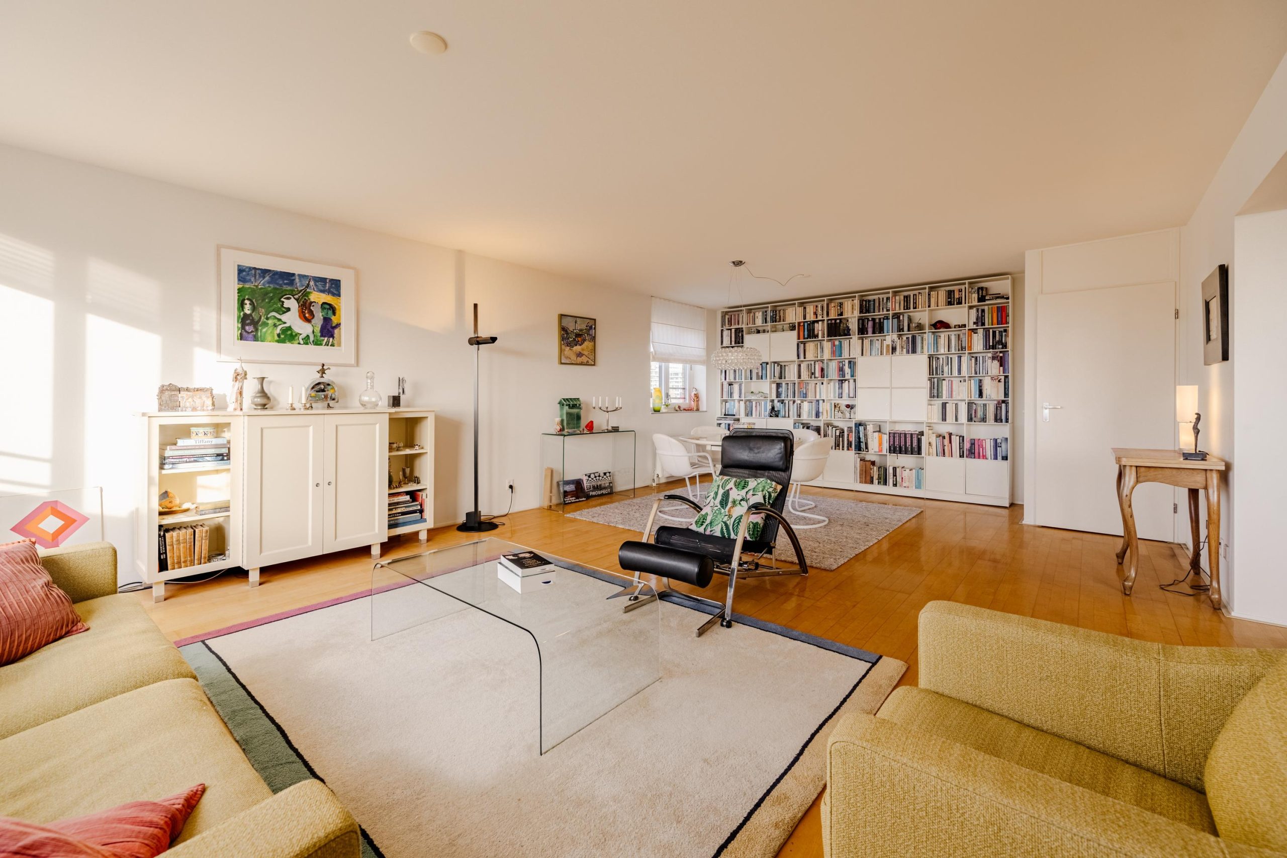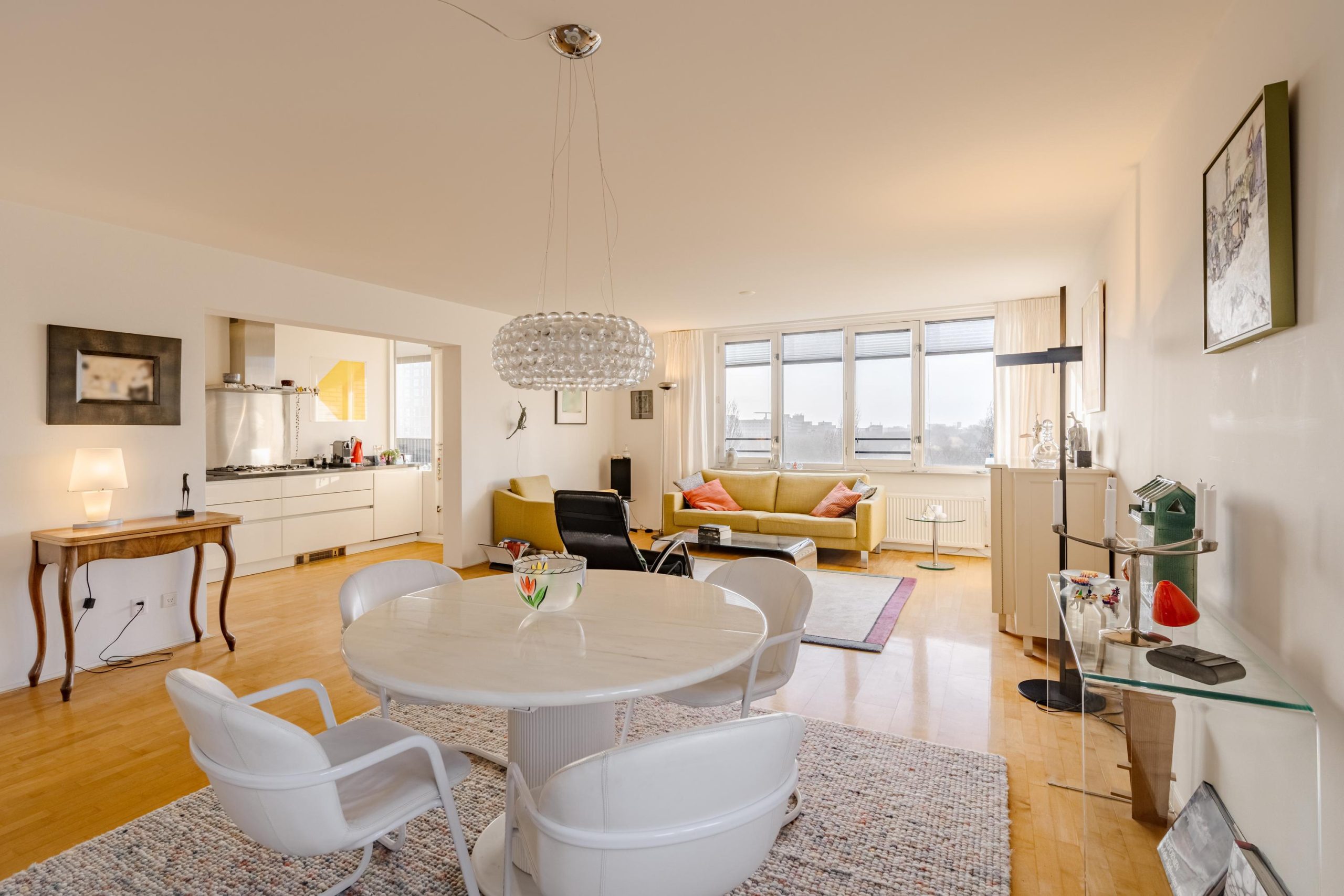 De royale woonkamer vormt samen met de open keuken het hart van de woning. De keuken is