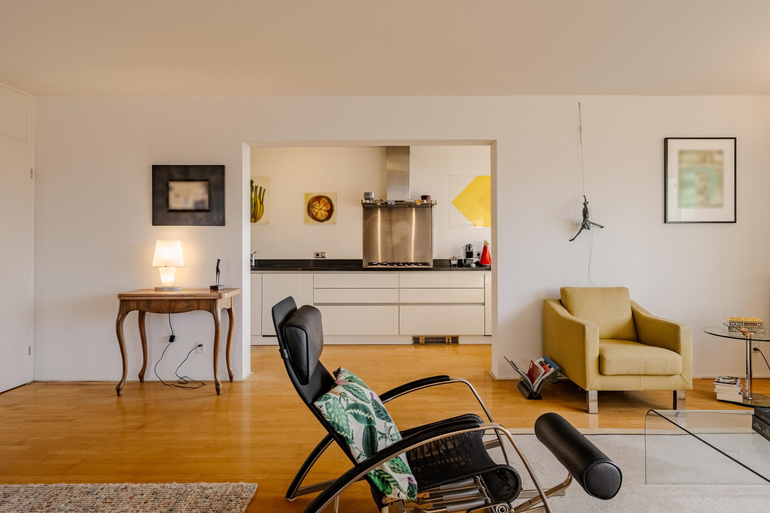 woonkamer en keuken zijn afgewerkt met een houten vloer.