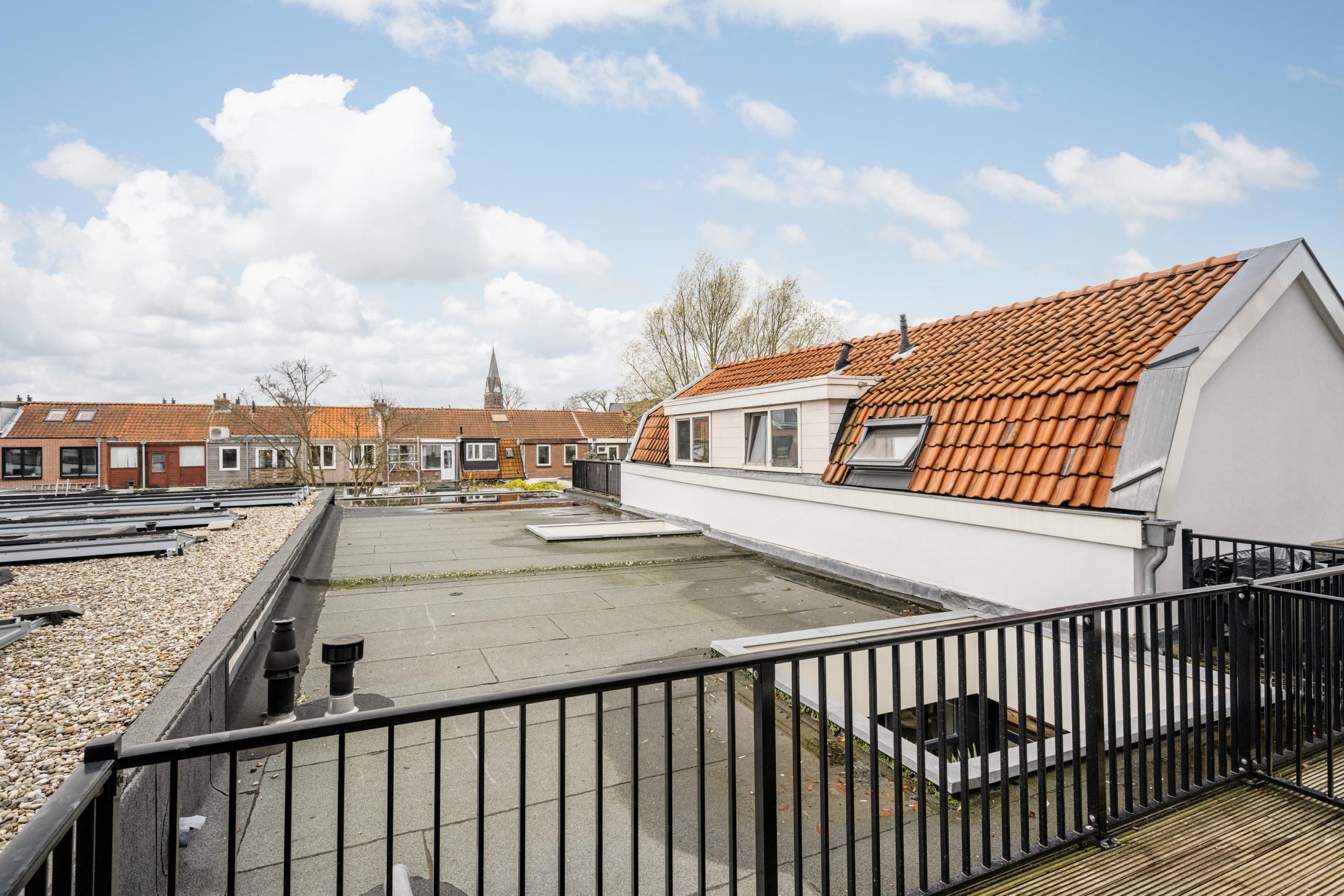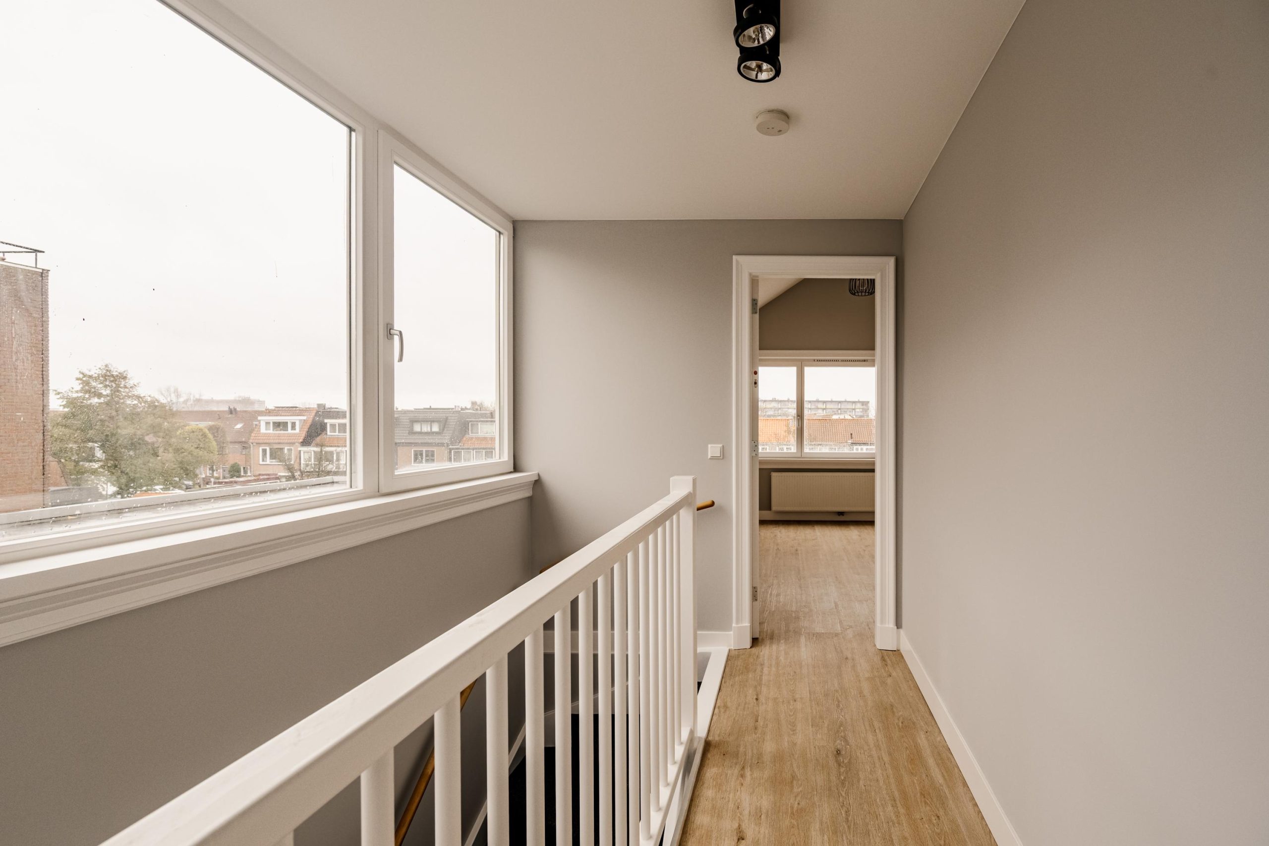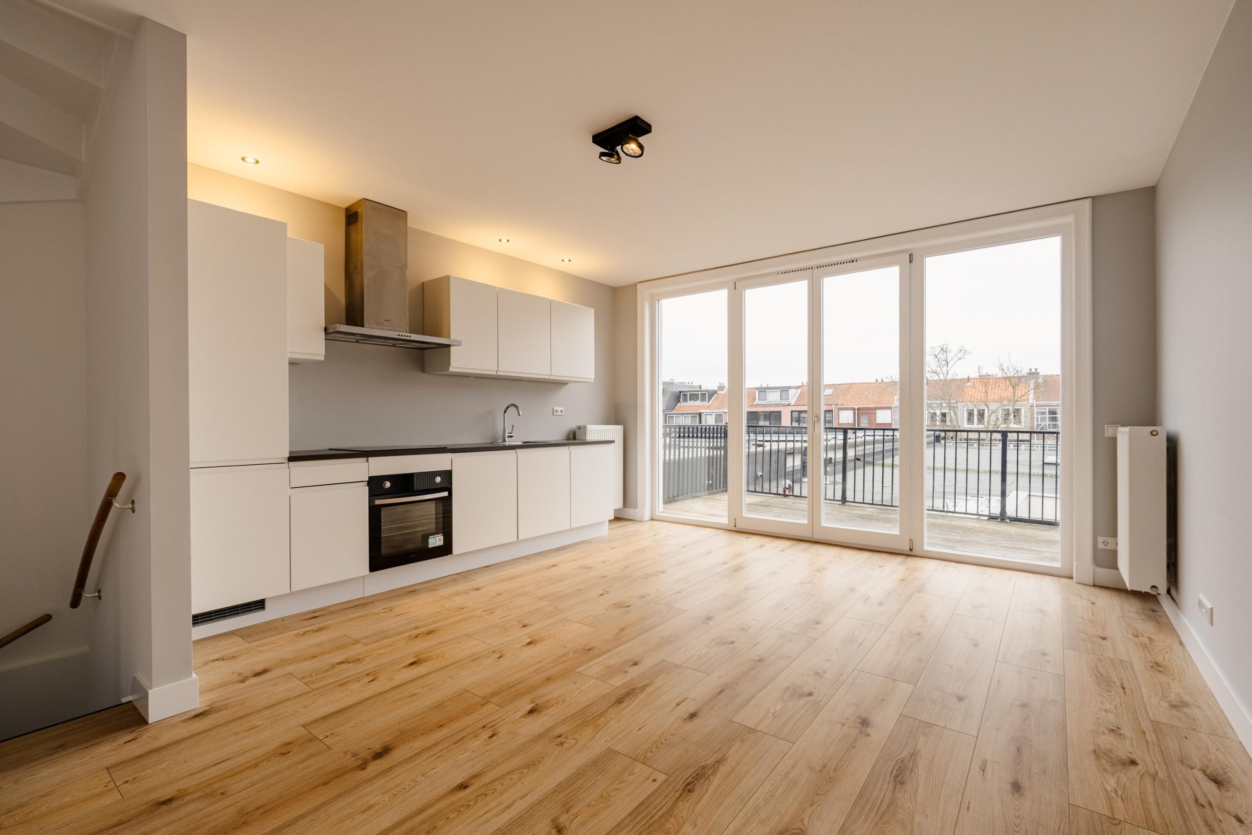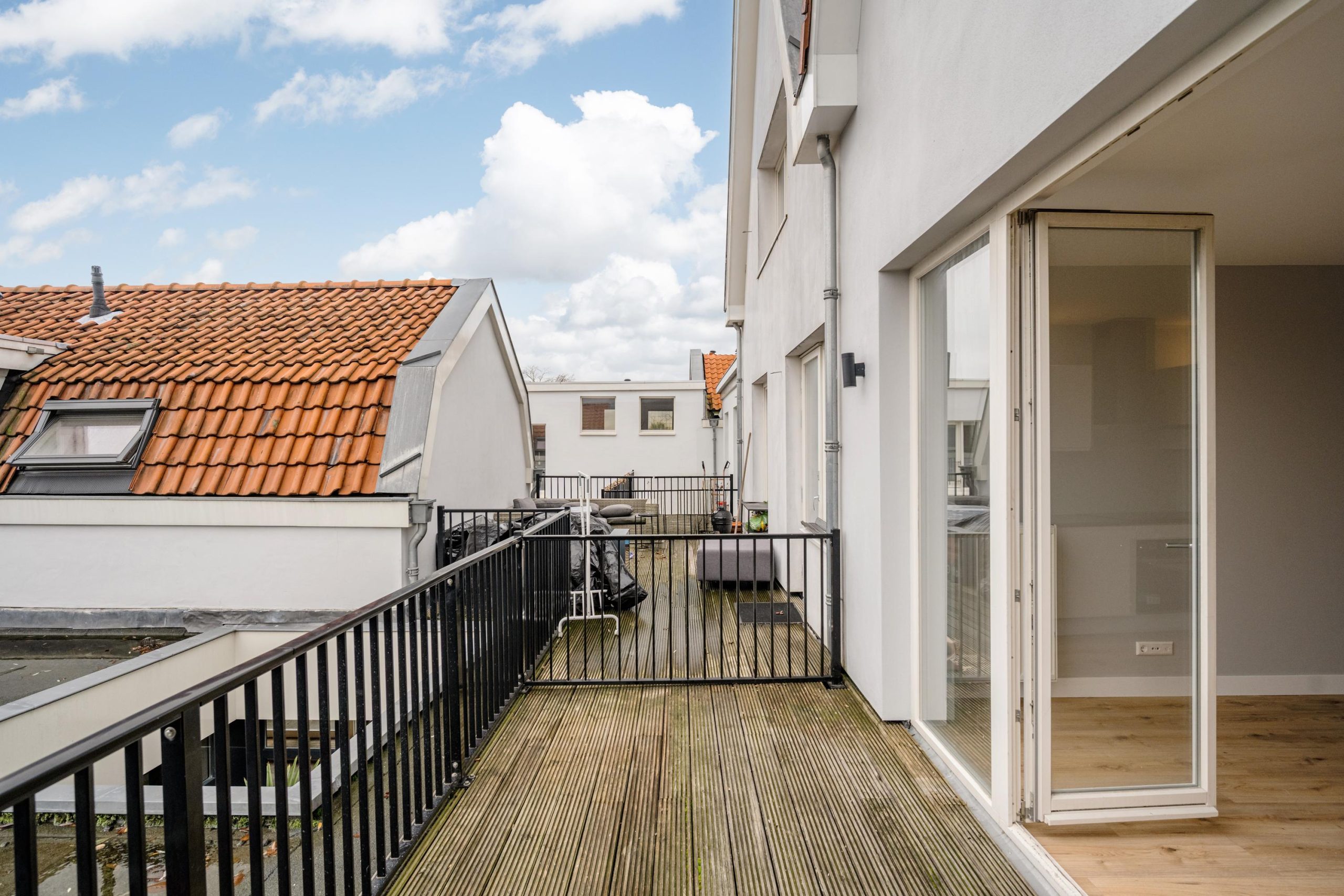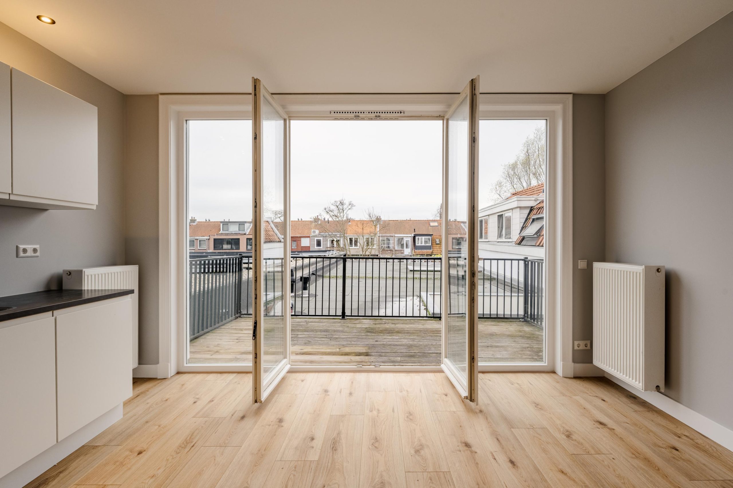 De openslaande deuren brengen je naar het ruime balkon op het zuiden – een heerlijke plek om in alle rust van de zon te genieten met uitzicht over de karakteristieke Haarlemse daken.