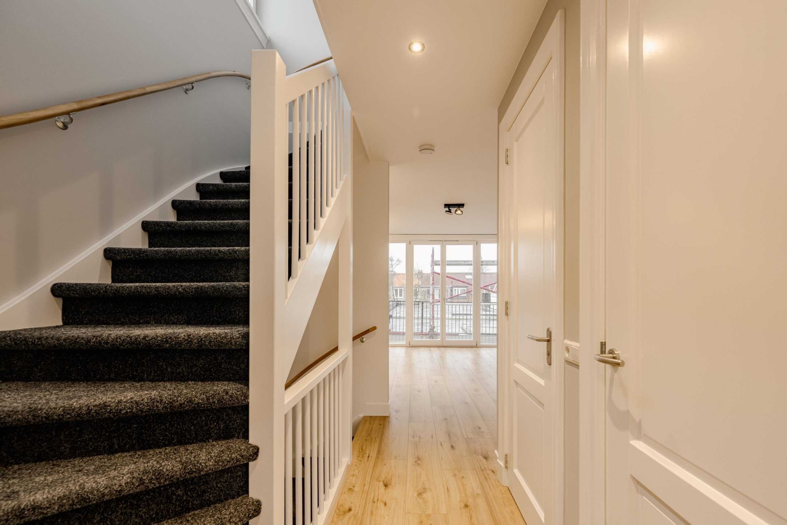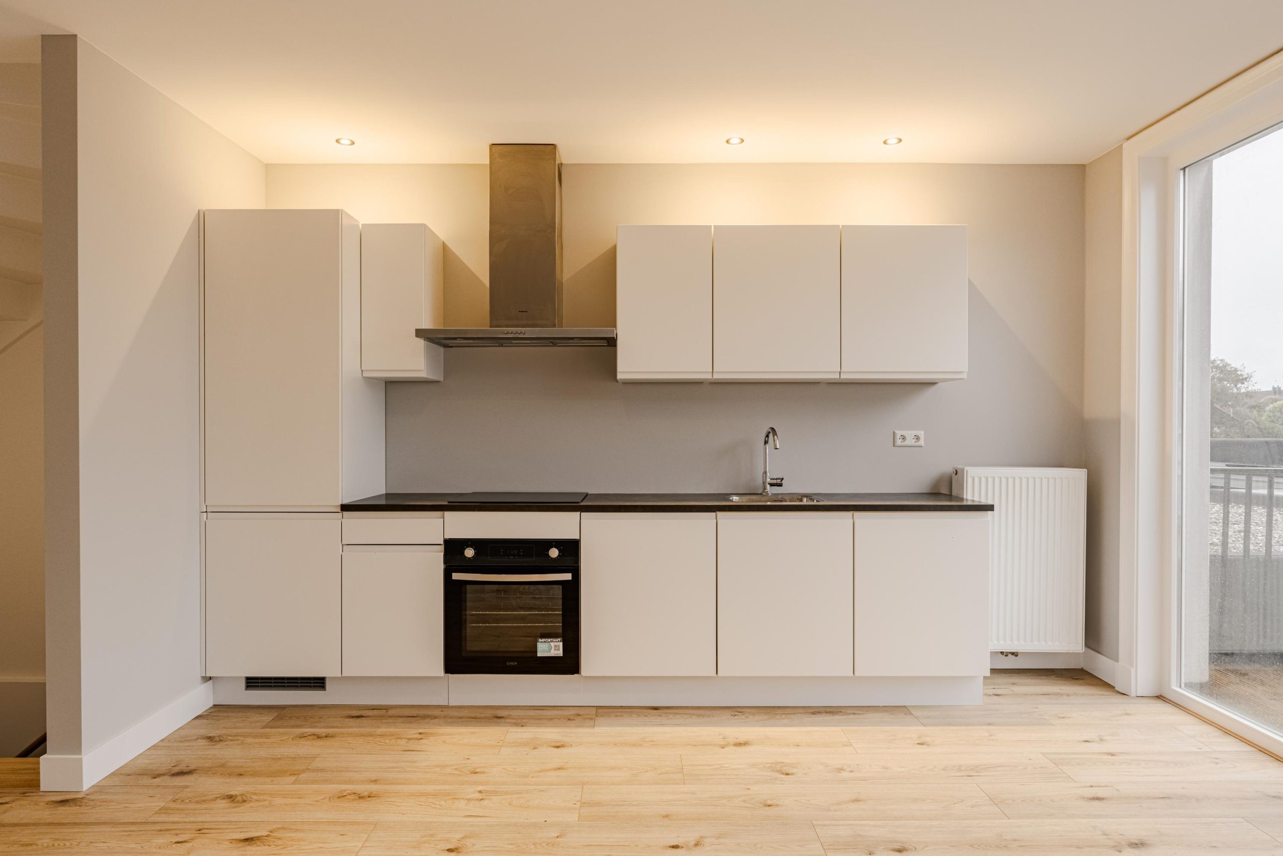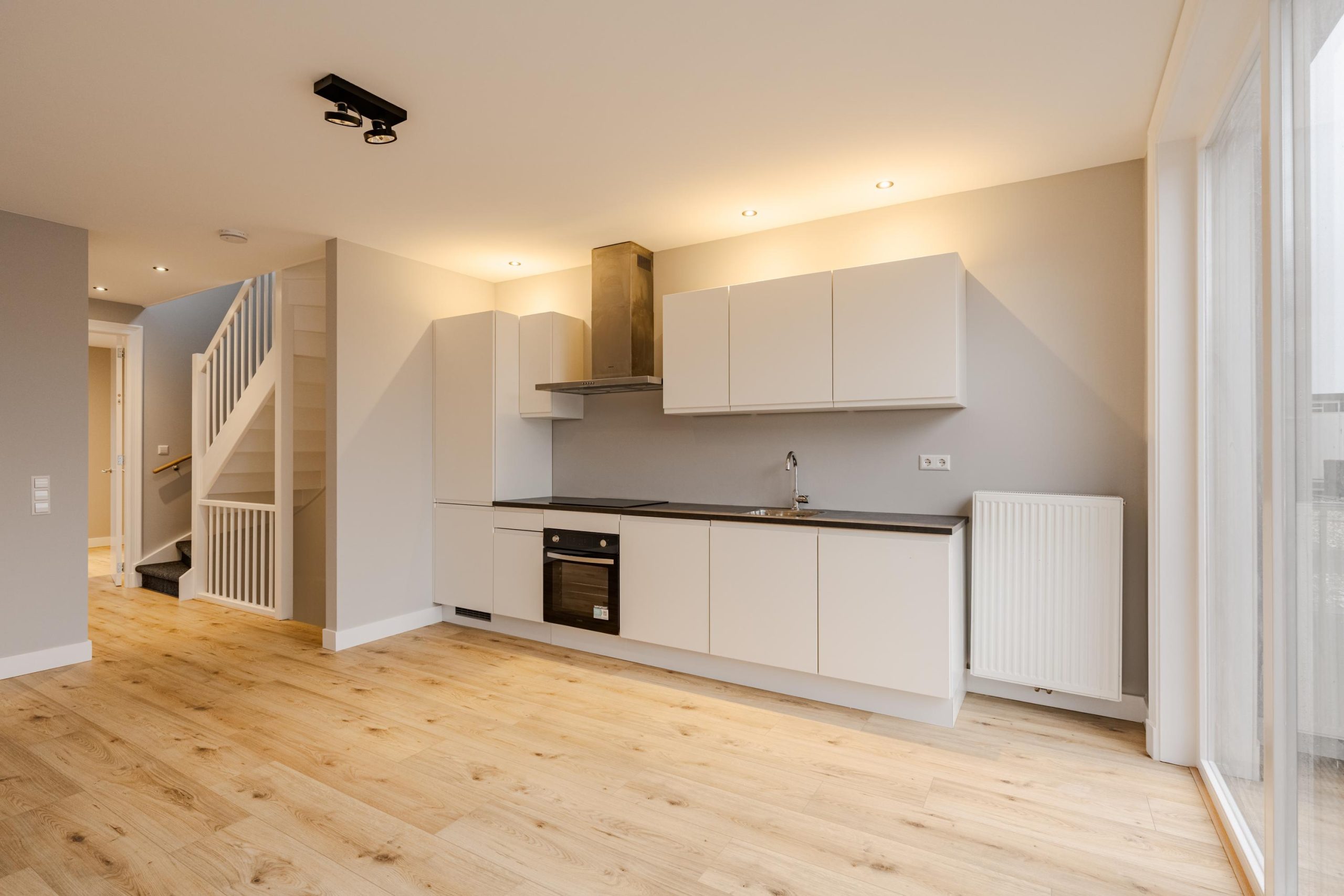Via een privé-entree stap je binnen in de hal met garderobe en meterkast. Een trap leidt je naar de eerste verdieping waar de lichte woonkamer met open keuken direct een gevoel van ruimte geeft. De moderne keuken is uitgerust met alle gewenste inbouwapparatuur, waaronder een inductiekookplaat, oven, vaatwasser, koel- en vrieskast.