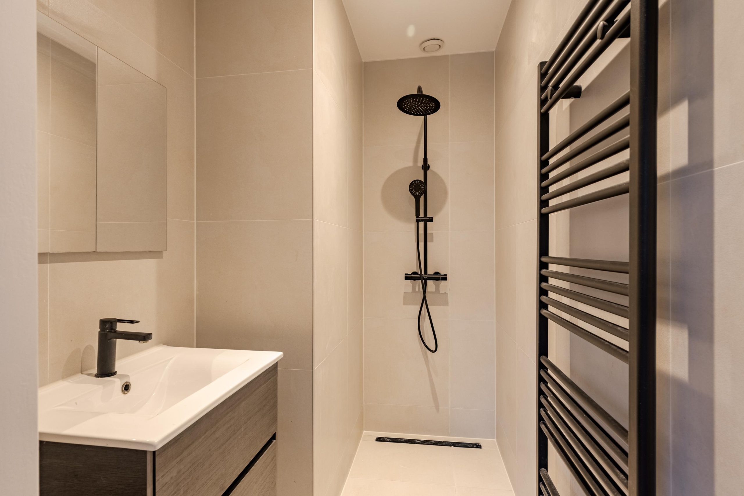 Karakteristiek en compleet gerenoveerd bovenappartement (97 m²) met drie slaapkamers, drie badkamers en een zonnig dakterras op het zuiden.