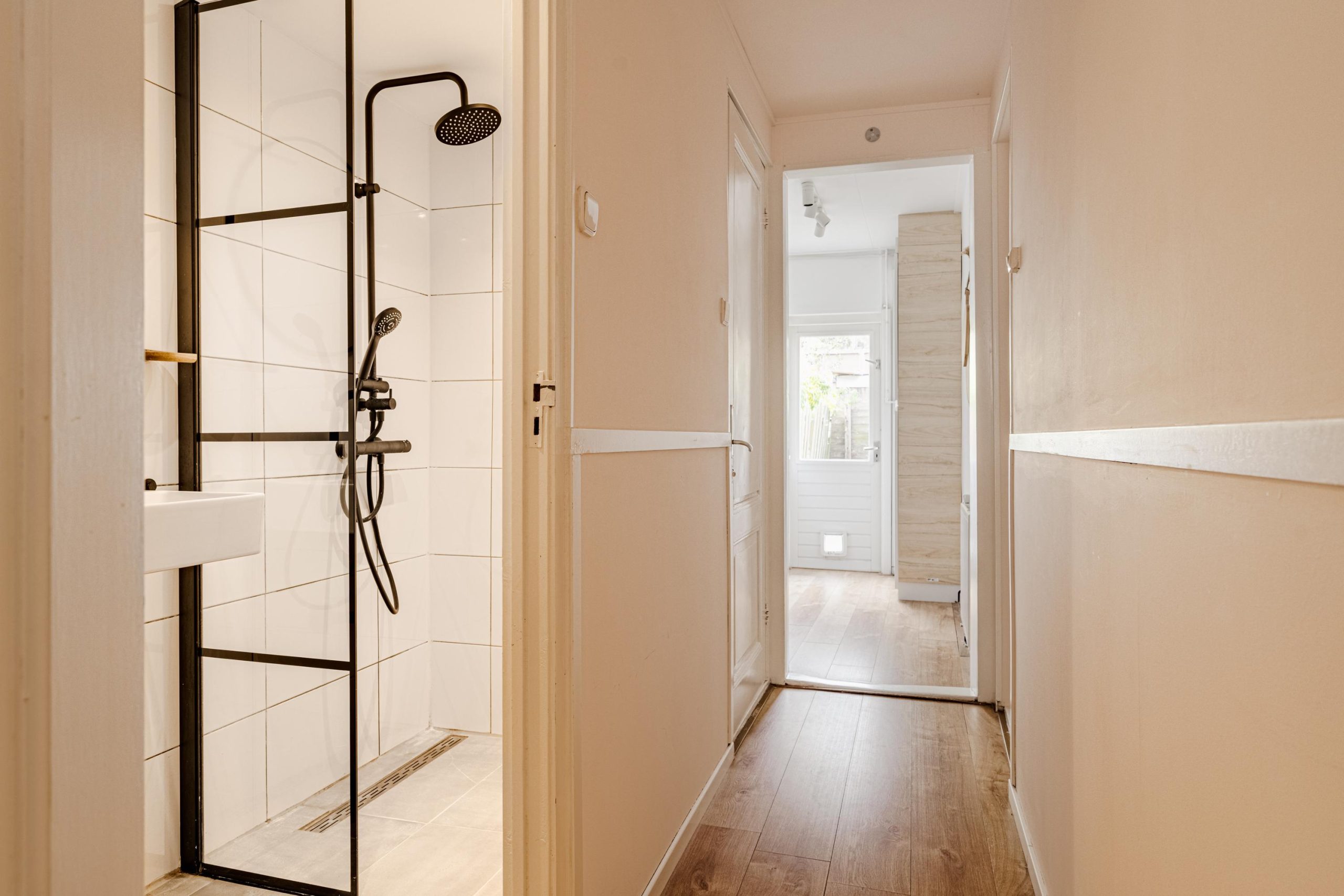 Via de hal kom je in de lichte woonkamer met hoge ramen en een nette laminaatvloer. De en-suite met vaste kasten scheidt de woonkamer van de slaapkamer aan de achterzijde. In deze kamer vind je eveneens vaste kasten en uitzicht op de tuin. De badkamer is praktisch ingedeeld met een inloopdouche, wastafel en aansluiting voor de wasmachine. In de hal bevindt zich een separaat toilet.
