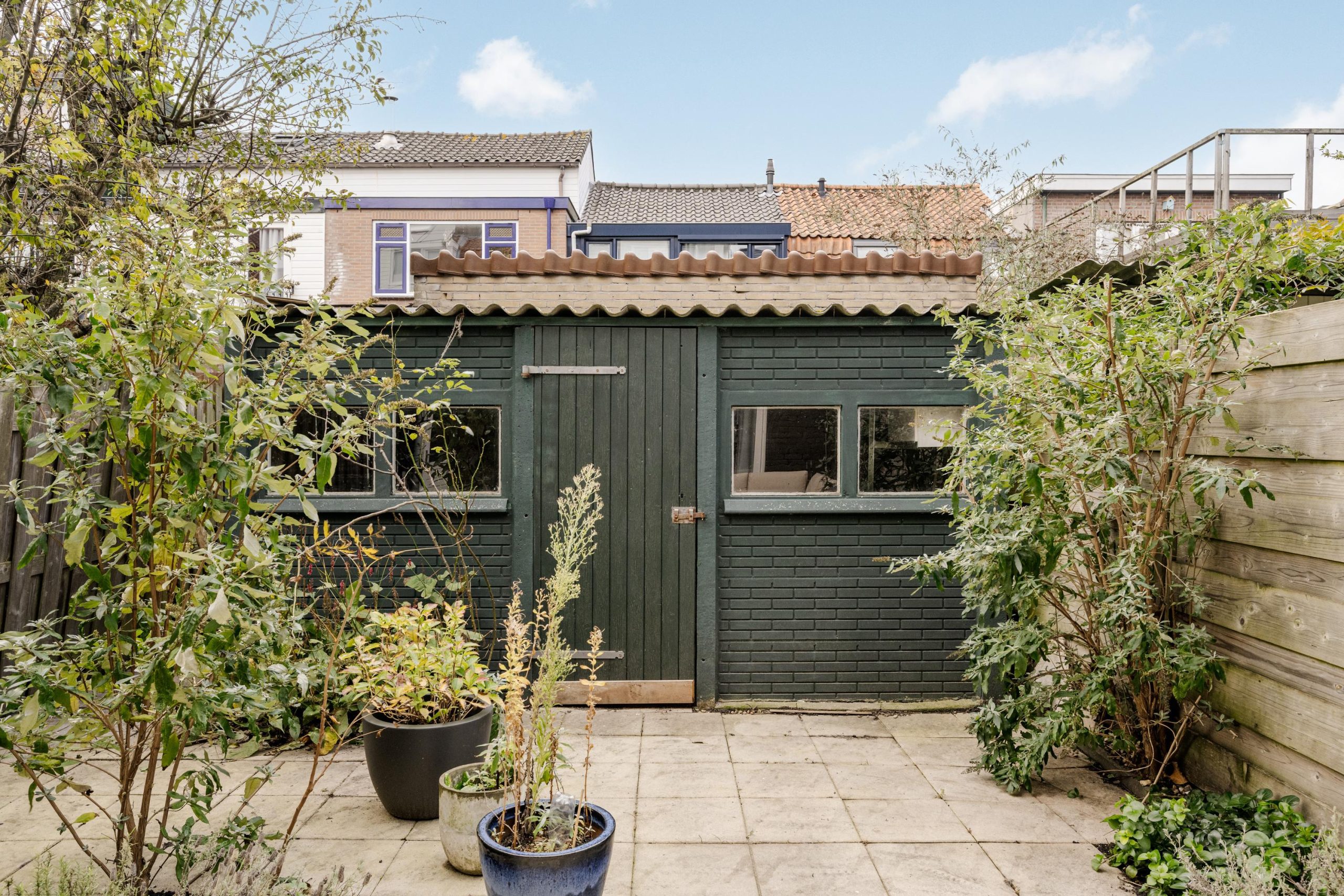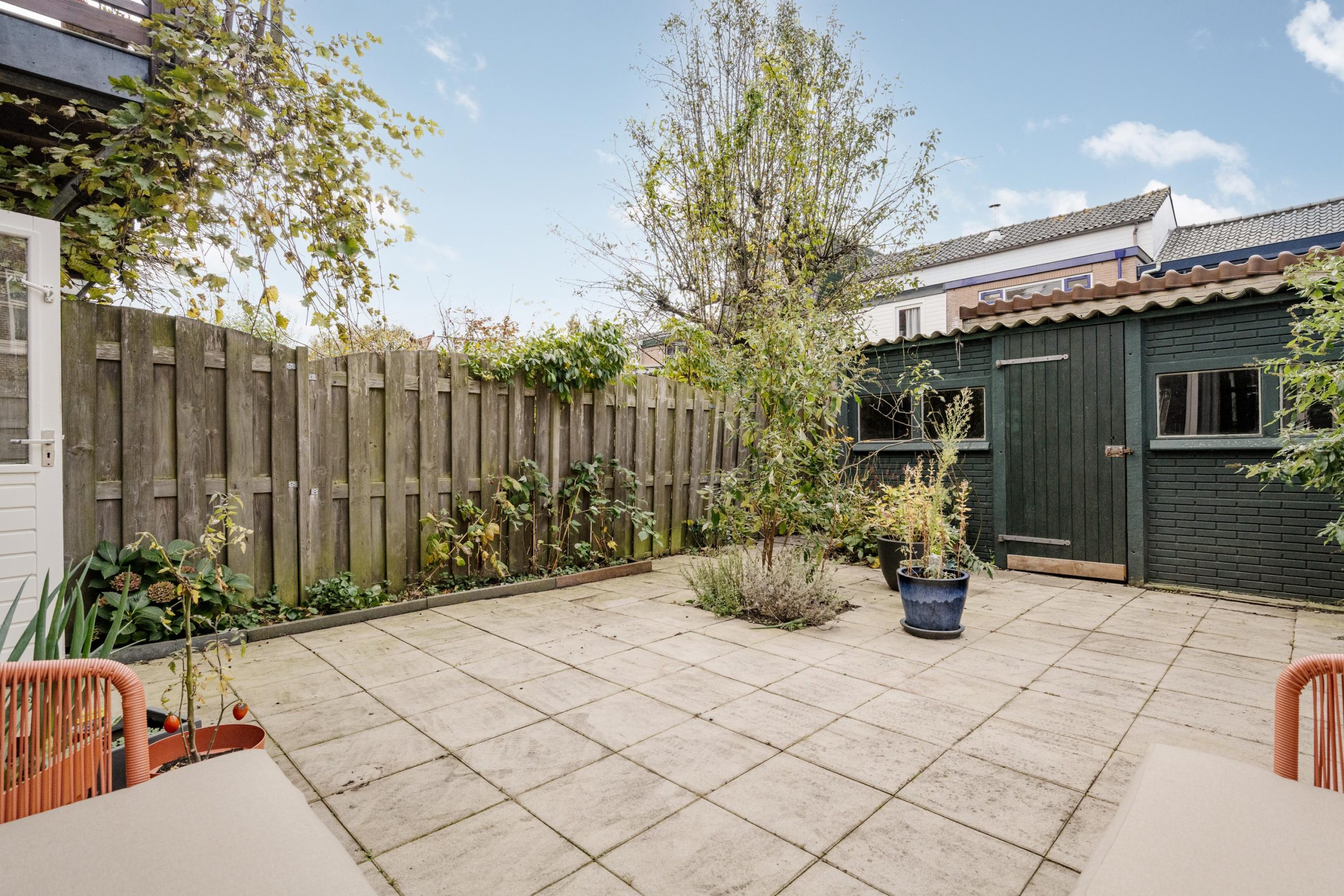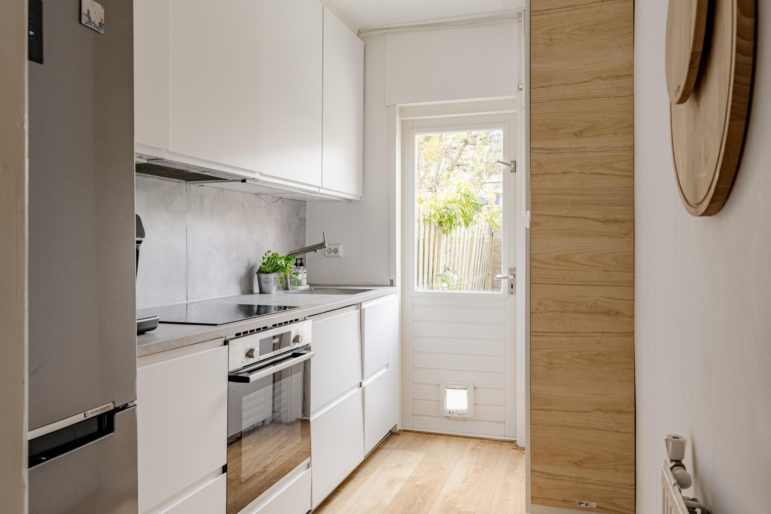 De keuken ligt aan de achterzijde en is uitgerust met moderne apparatuur en een deur naar de tuin. Fijn detail: je stapt met je kopje koffie of borrelplank zó naar buiten. De tuin op het westen biedt volop middag- en avondzon. Achterin staat een houten berging met elektra, ideaal voor fietsen of extra opslag.