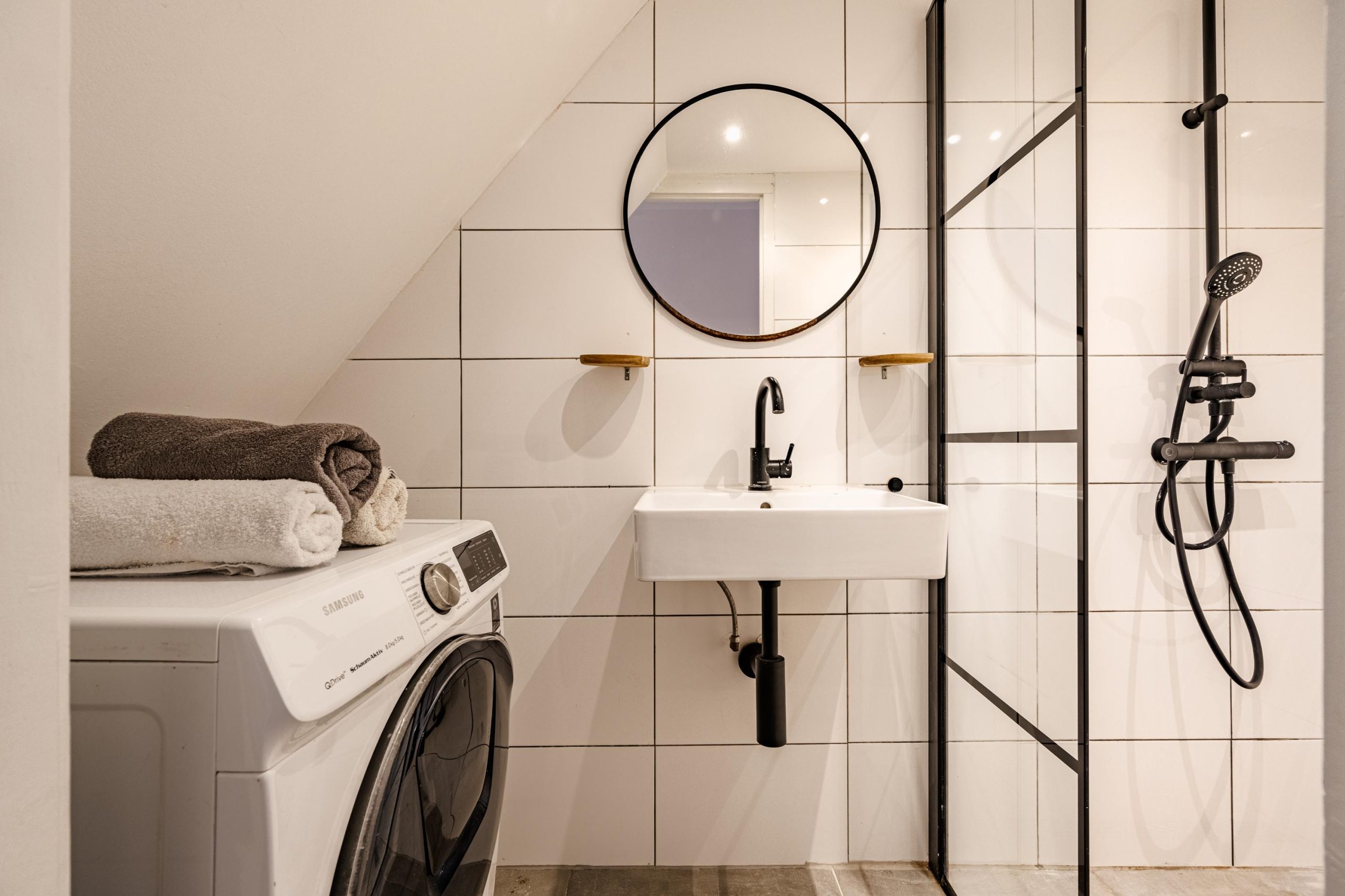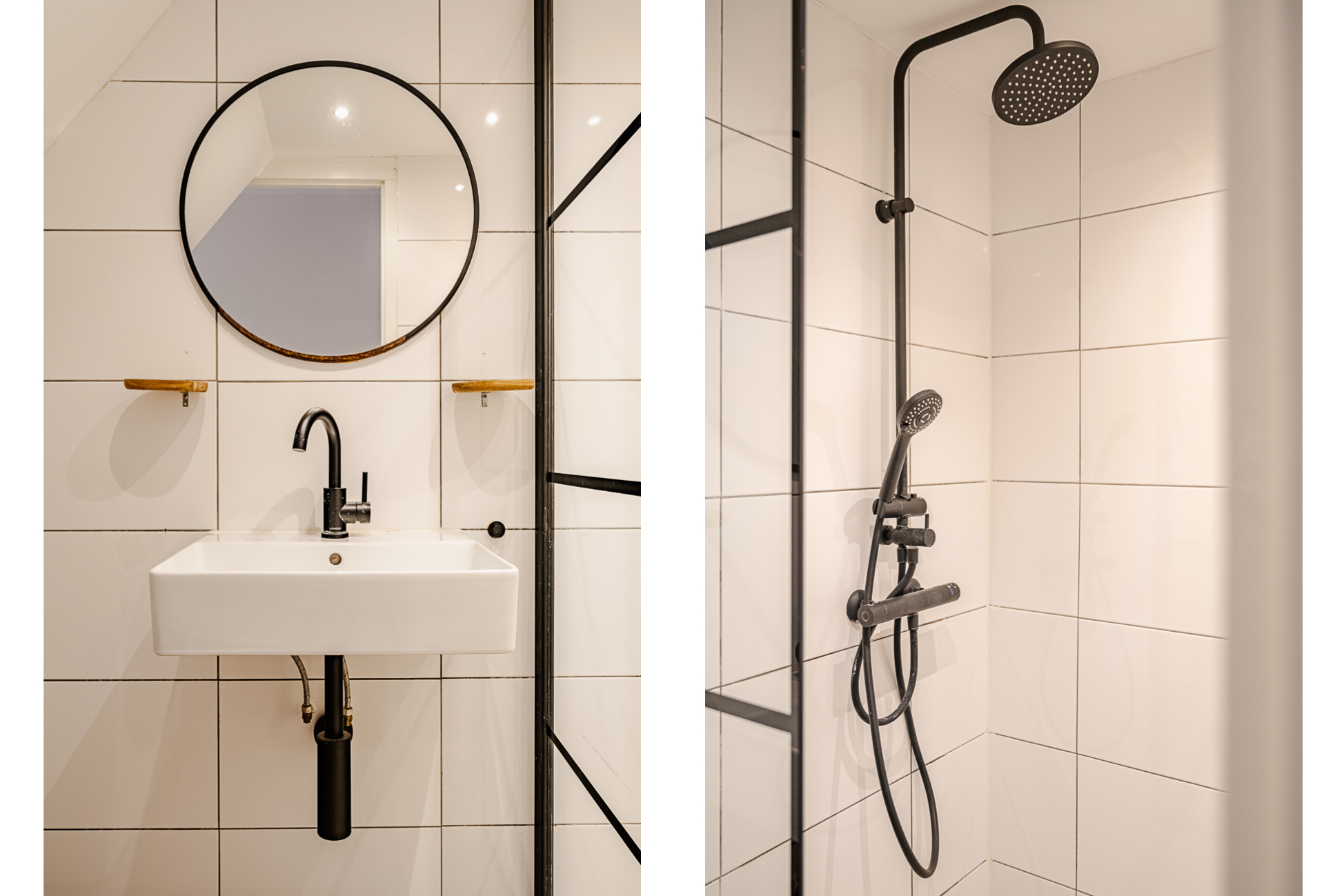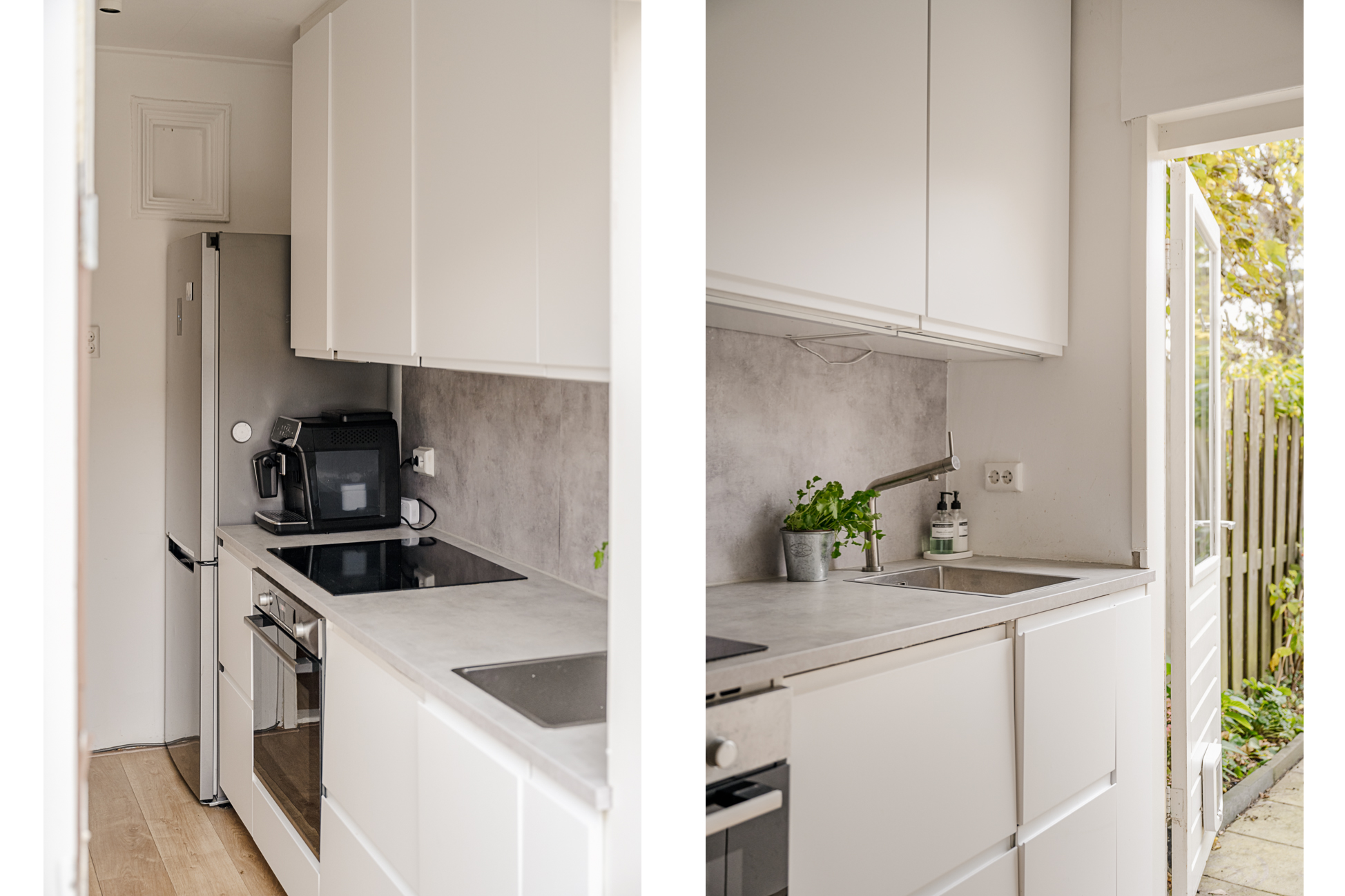 De keuken ligt aan de achterzijde en is uitgerust met moderne apparatuur en een deur naar de tuin. Fijn detail: je stapt met je kopje koffie of borrelplank zó naar buiten. De tuin op het westen biedt volop middag- en avondzon. Achterin staat een houten berging met elektra, ideaal voor fietsen of extra opslag.