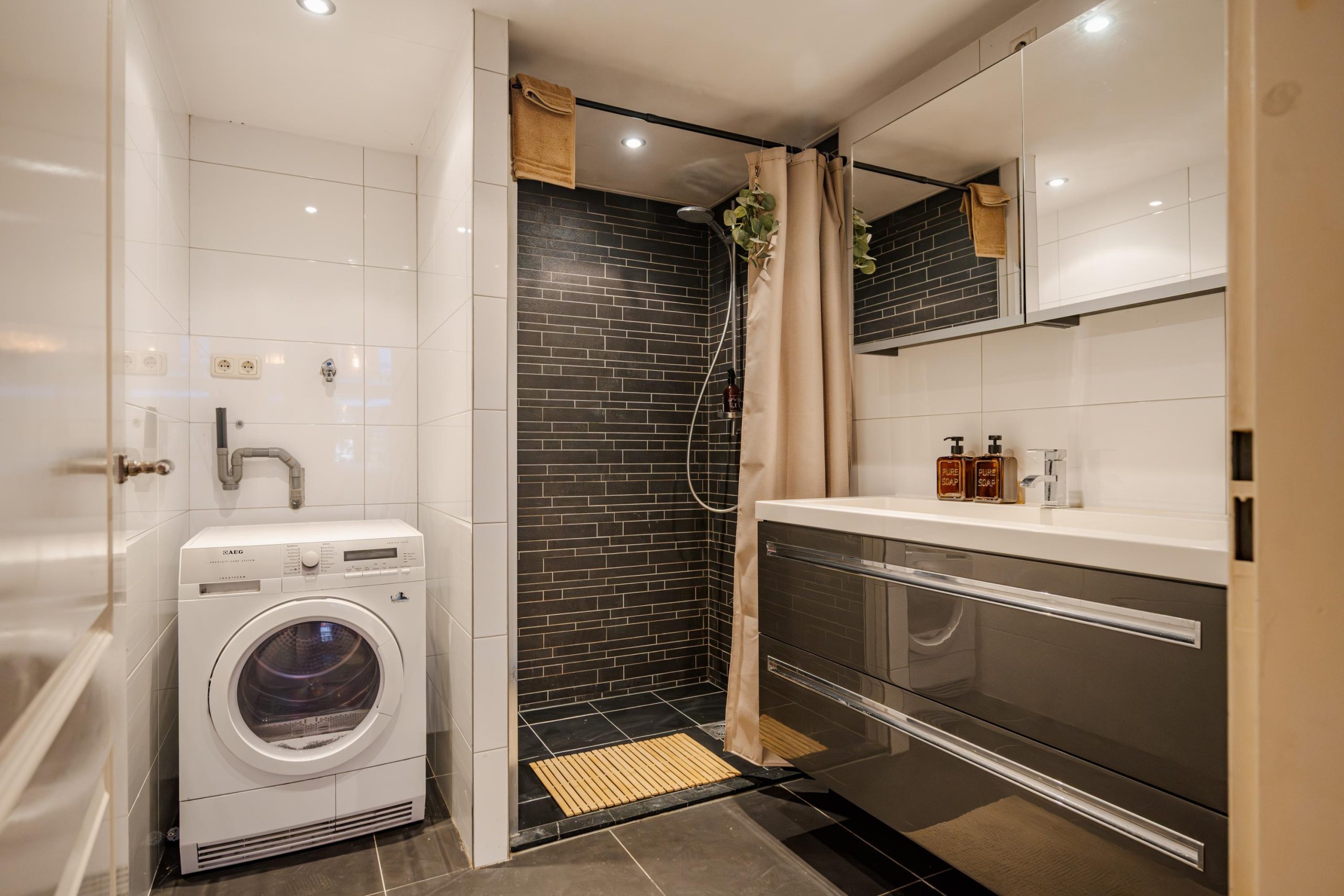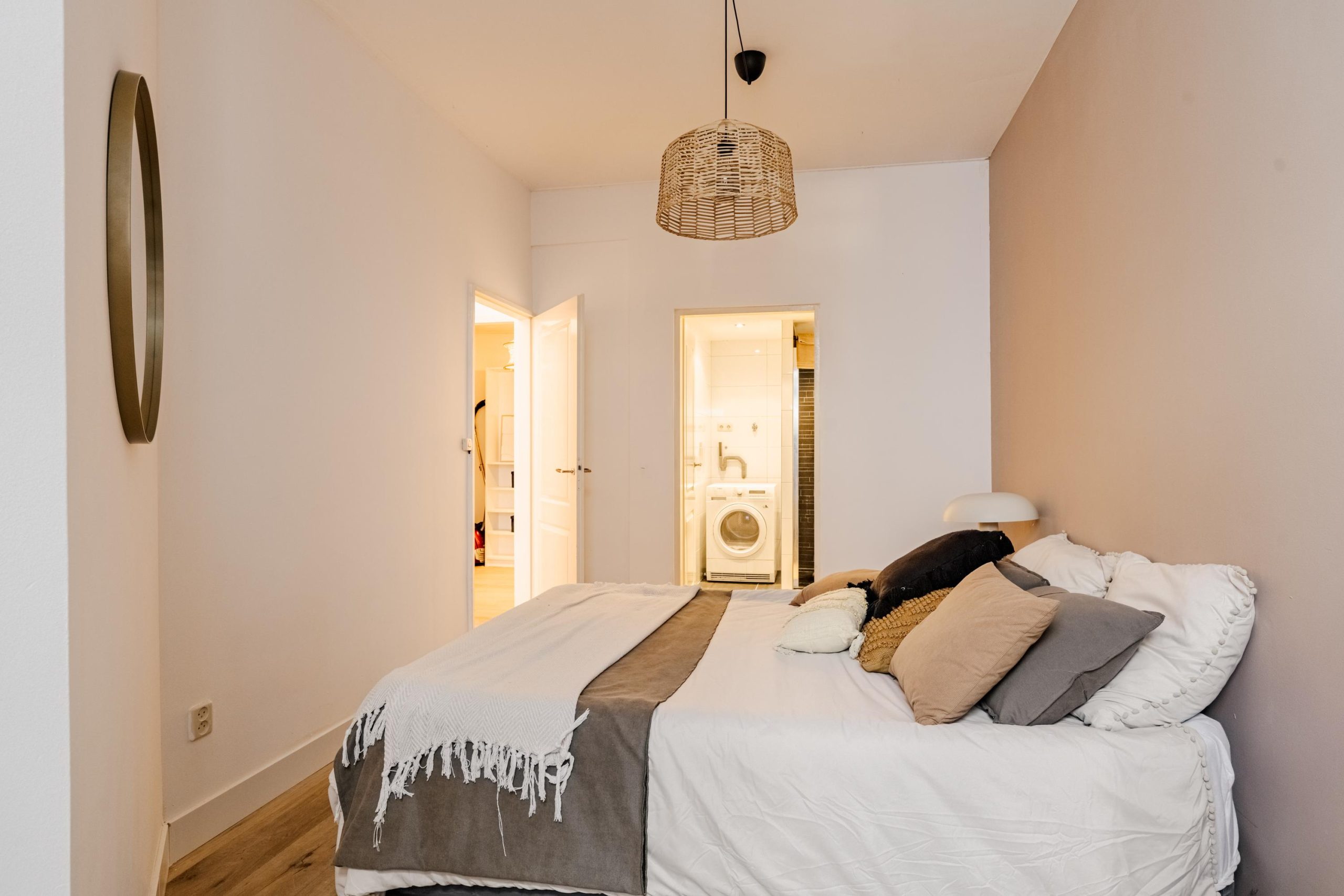Aan de voorzijde bevindt zich een ruime slaapkamer. Op dezelfde verdieping ligt de badkamer, voorzien van een douche, wastafelmeubel en aansluiting voor de wasmachine.