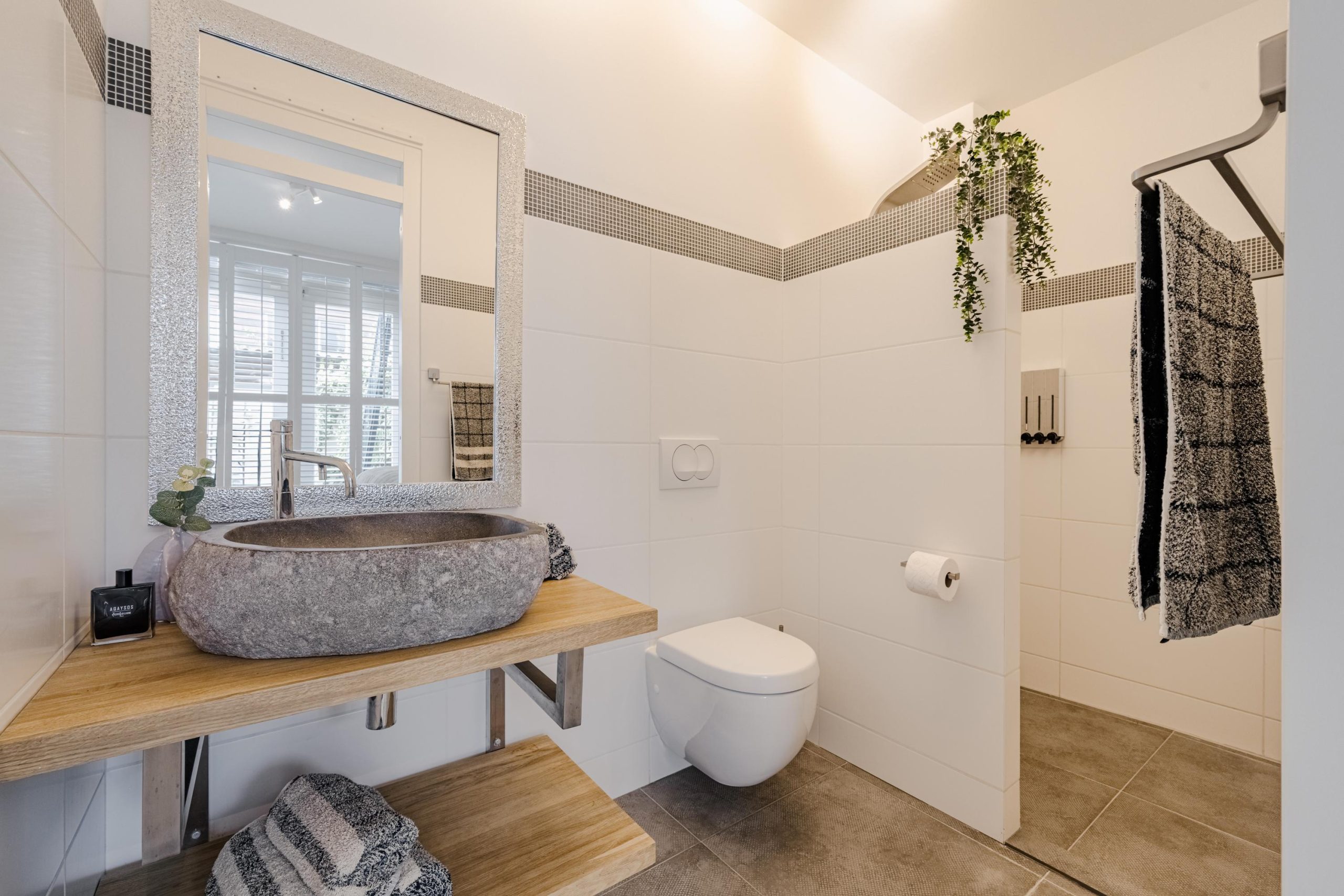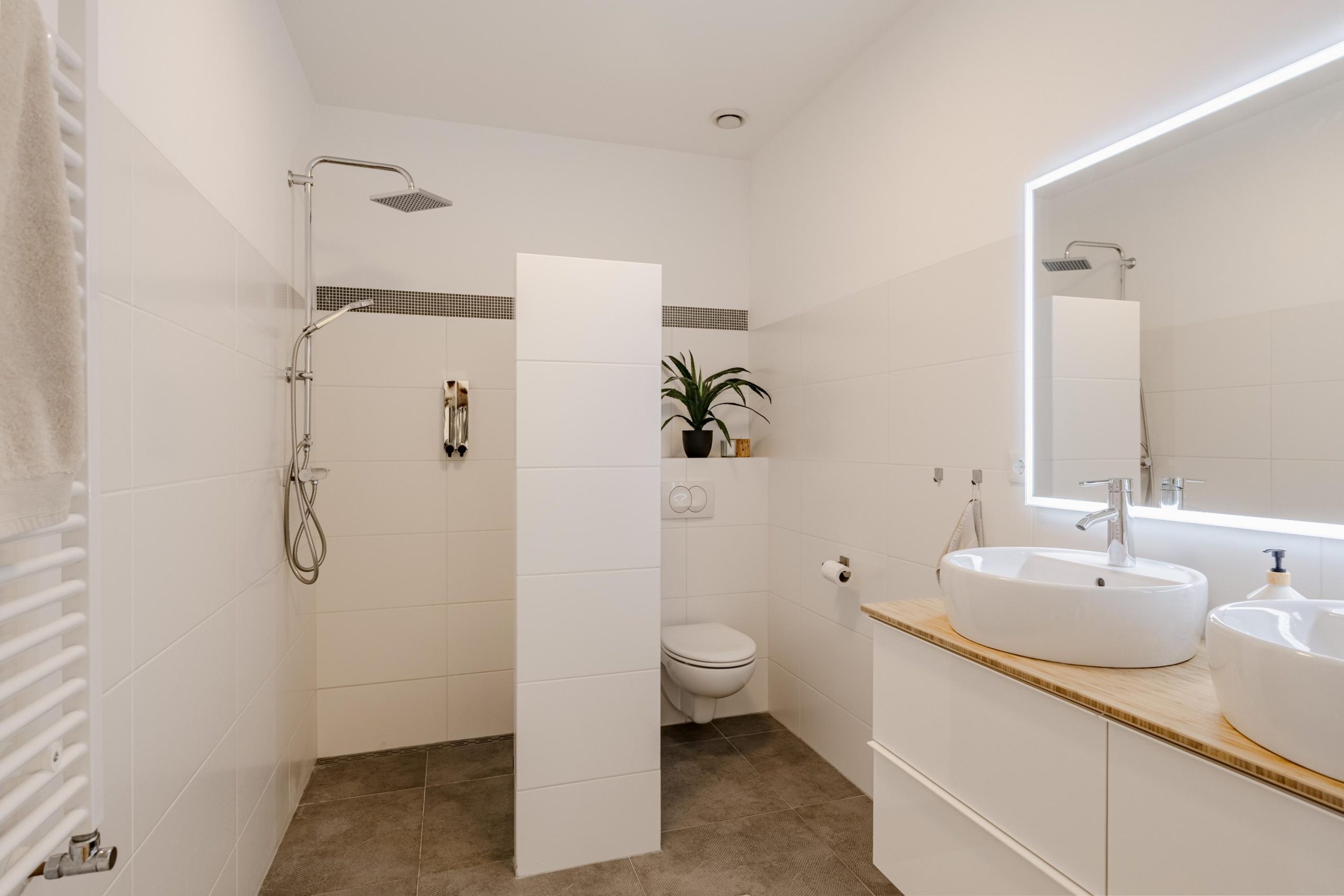een ruime inloopdouche, wastafelmeubel en toilet.