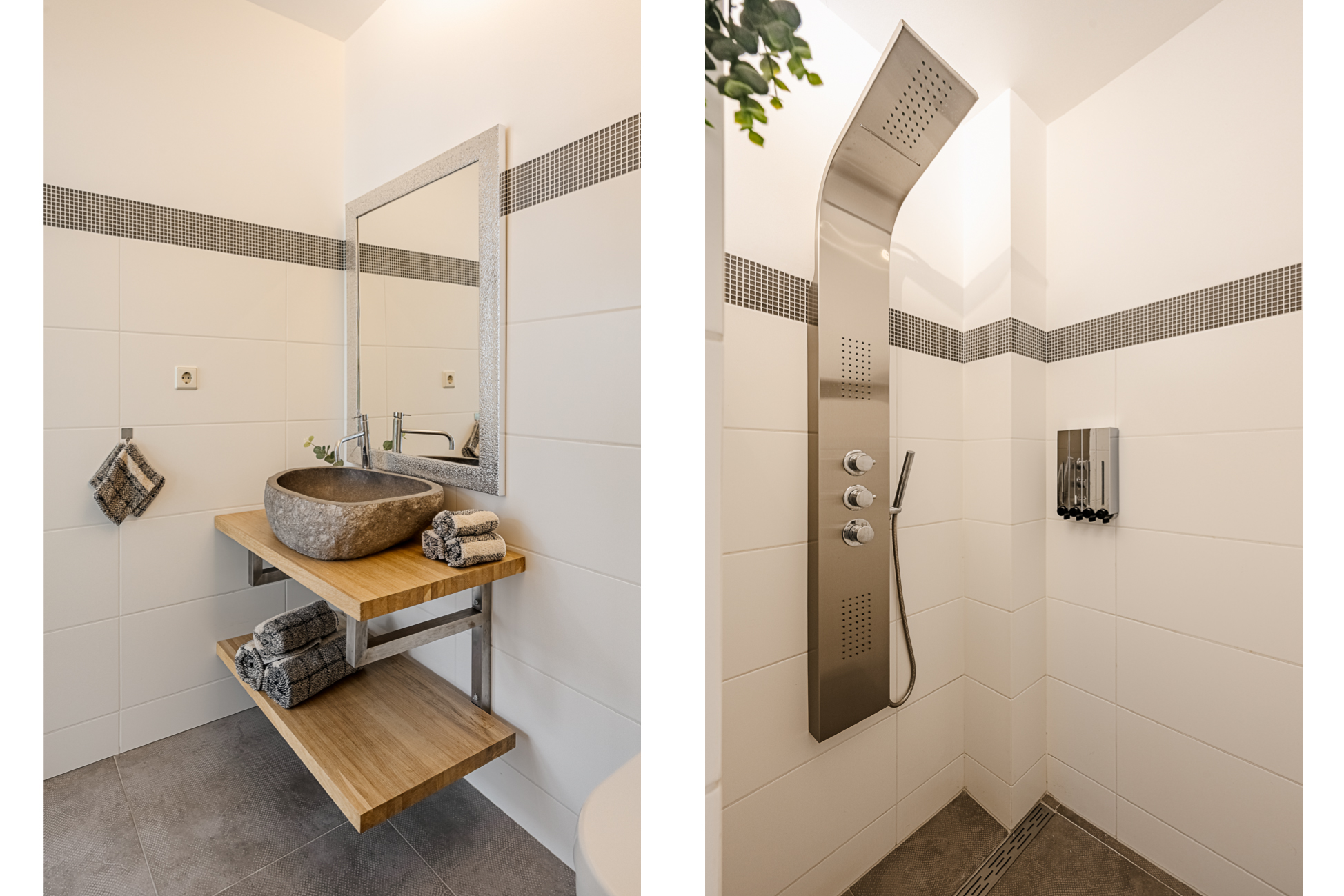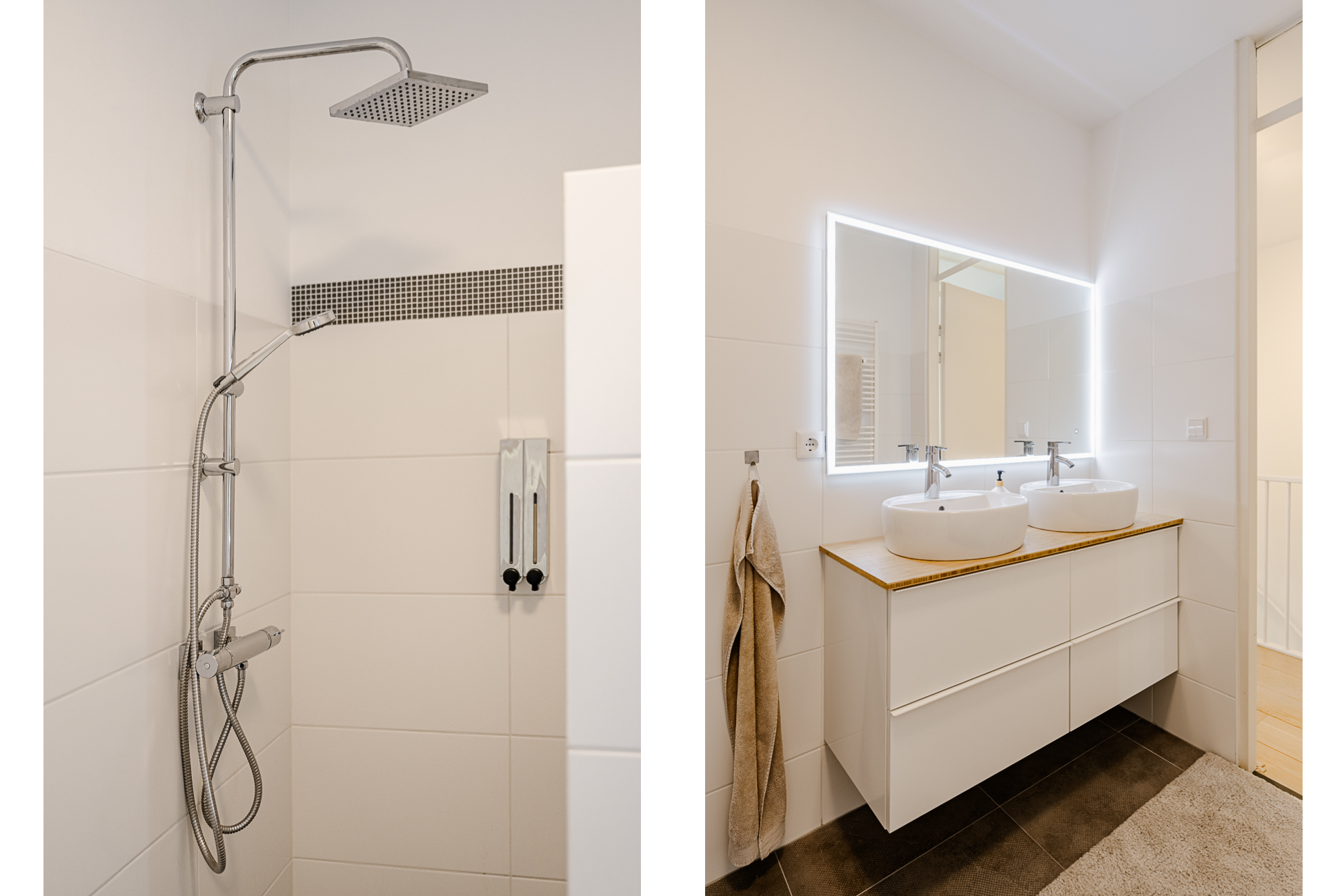 midden van de verdieping. Deze badkamer is voorzien van een inloopdouche, dubbele
