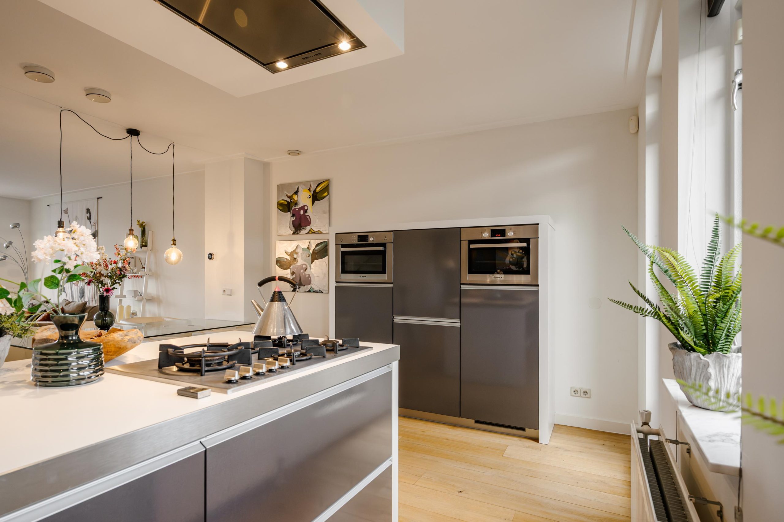 schiereiland. De keuken beschikt over een gaskookplaat, quooker, oven en magnetron. Via het