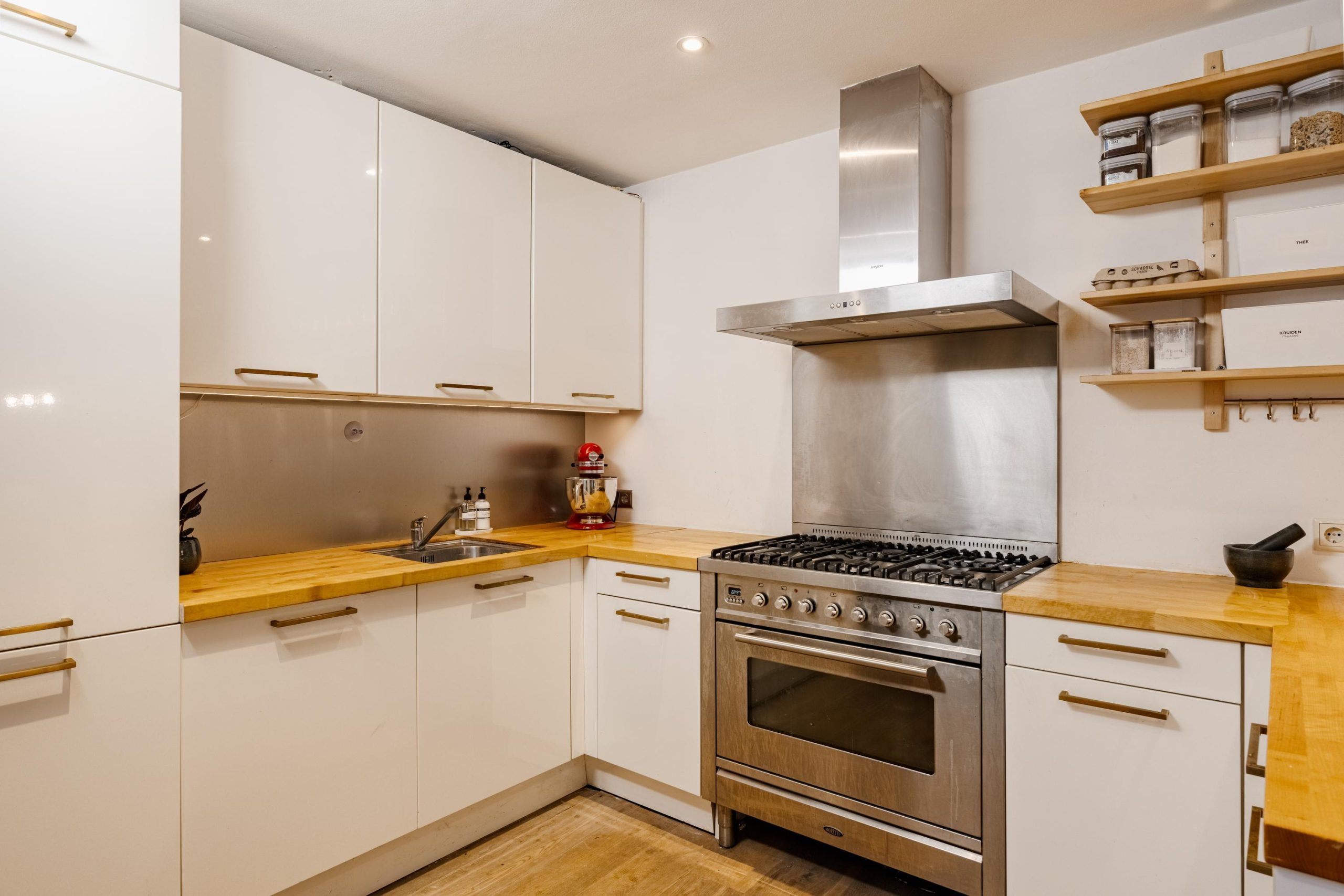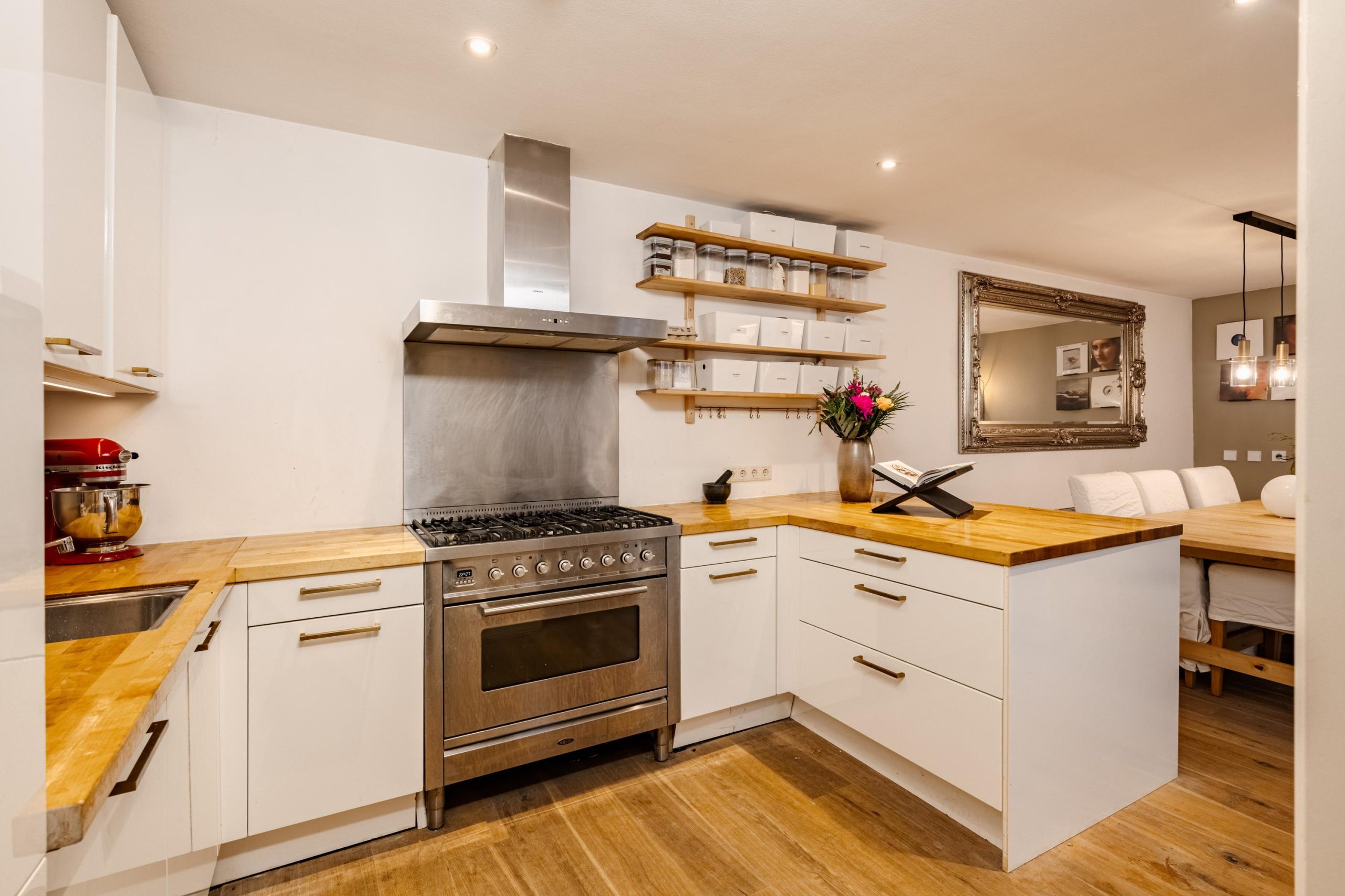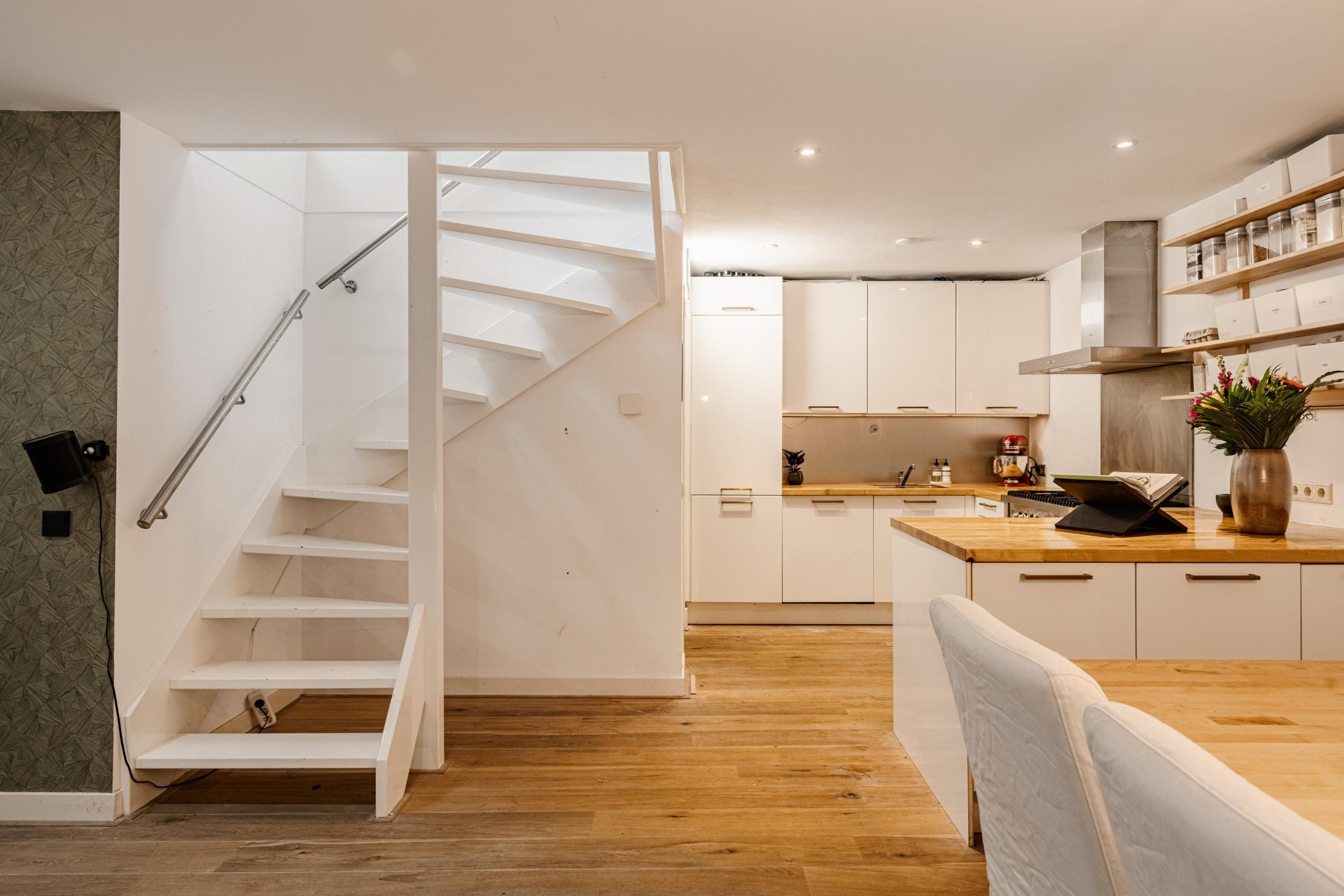 Via het charmante hek betreed je de woning. In de ruime hal bevindt zich de meterkast en het moderne toilet met fonteintje. De living is verrassend licht, met een warme houten vloer en een open keuken aan de achterzijde. De keuken is uitgerust met hoogwaardige inbouwapparatuur van onder andere Boretti en Siemens – een heerlijke plek voor kookliefhebbers. Aansluitend vind je de praktische inpandige bijkeuken met ruimte voor wasmachine, berging en extra opslag.