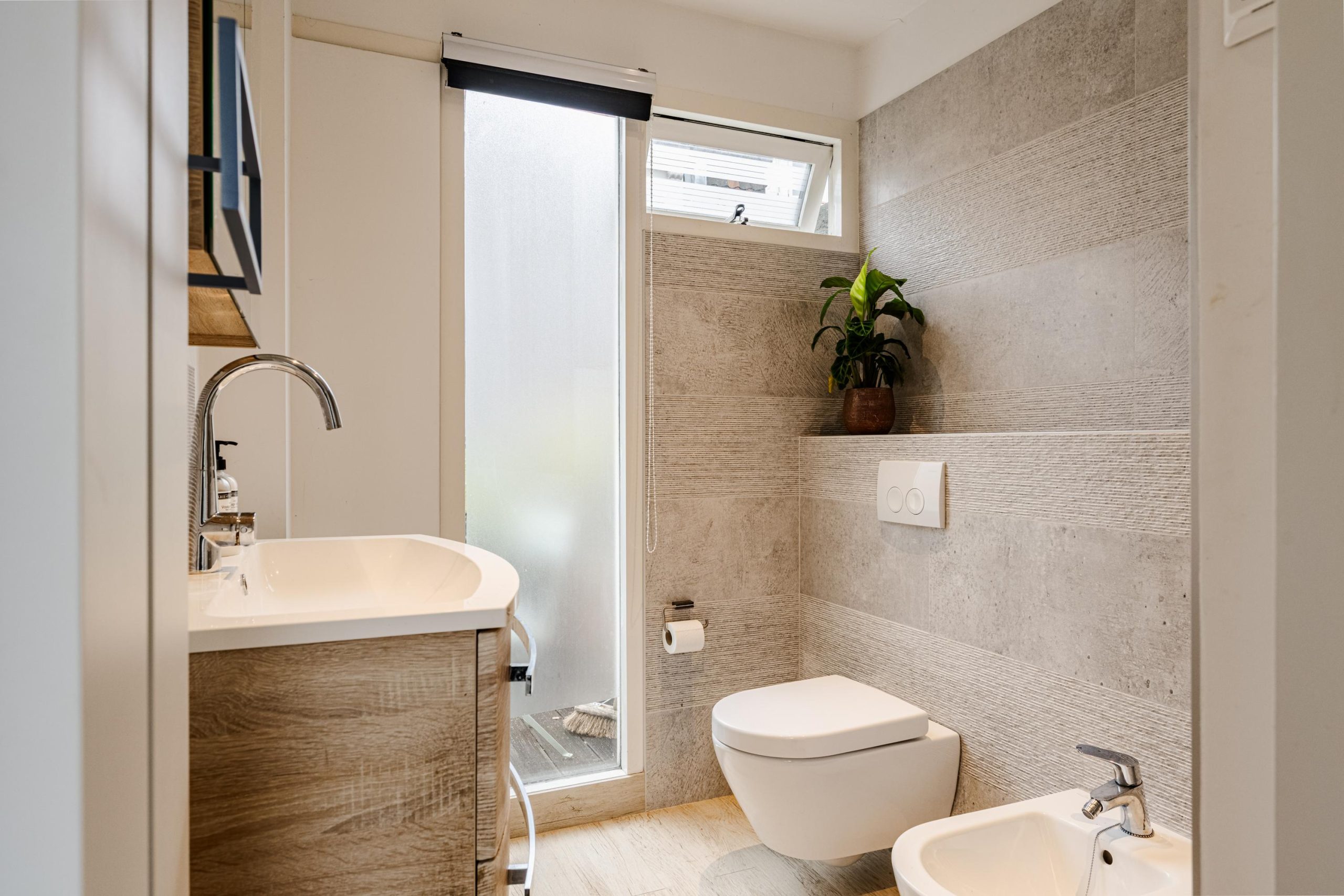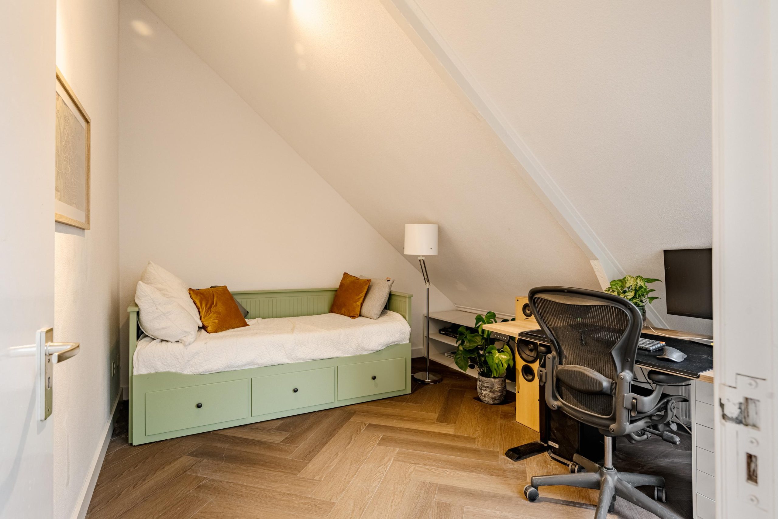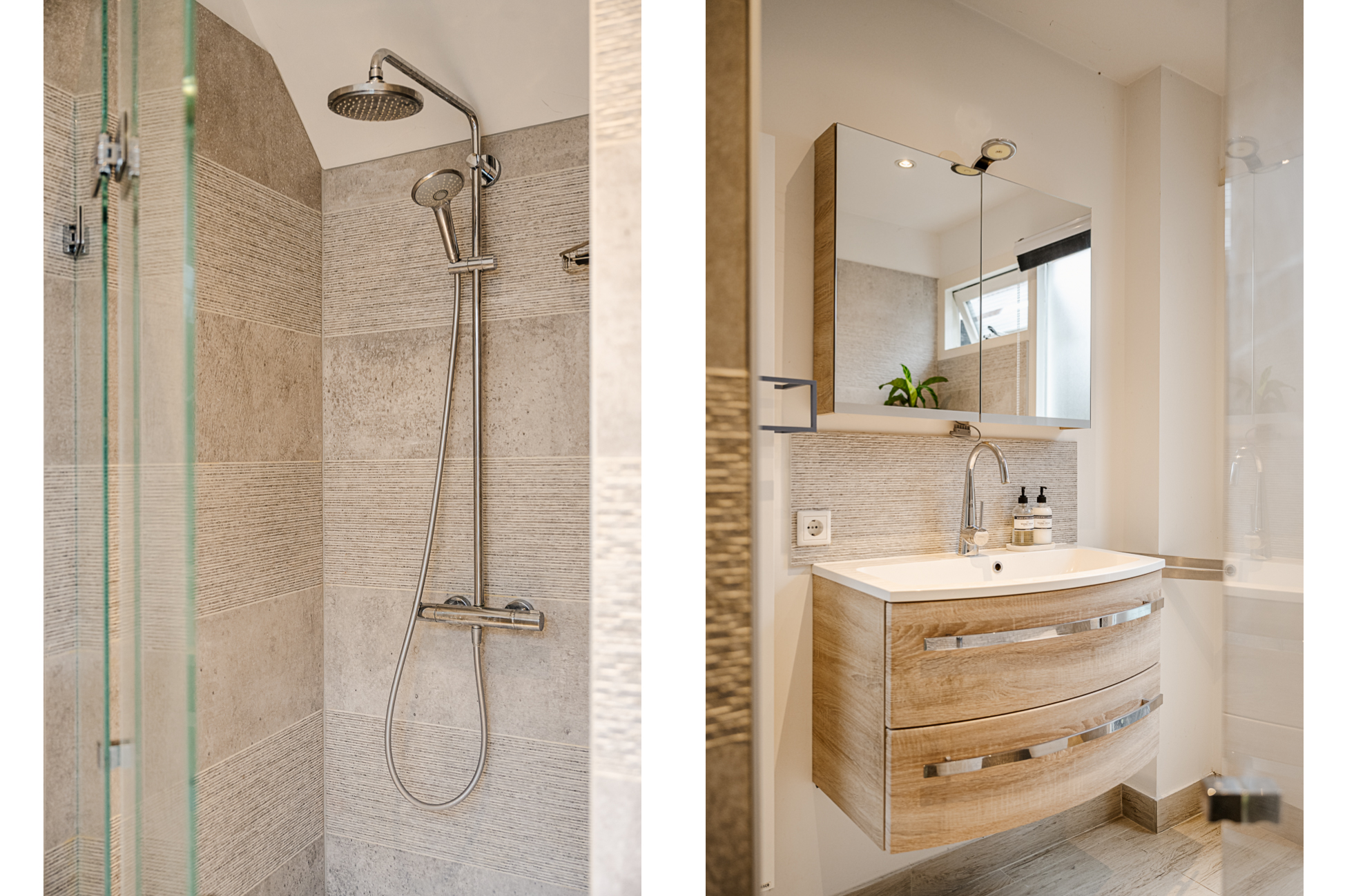 Op de eerste etage bevinden zich twee comfortabele slaapkamers: één aan de voorzijde en één aan de achterzijde van de woning. De moderne badkamer is voorzien van een inloopdouche, tweede toilet, bidet, wastafel én wastafelmeubel. De C.V.-ketel (Intergas HR uit 2005) bevindt zich in de separate bergruimte.