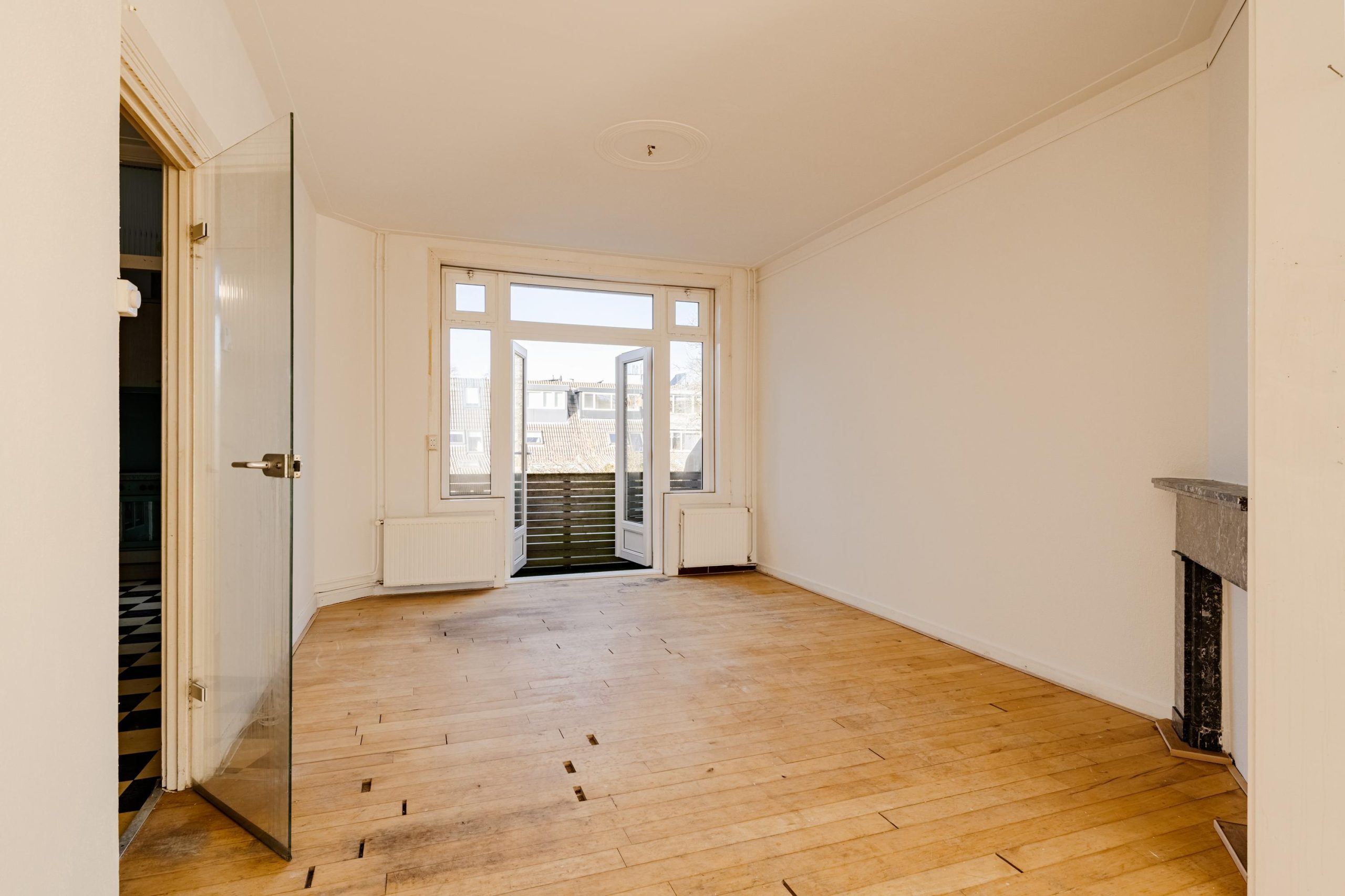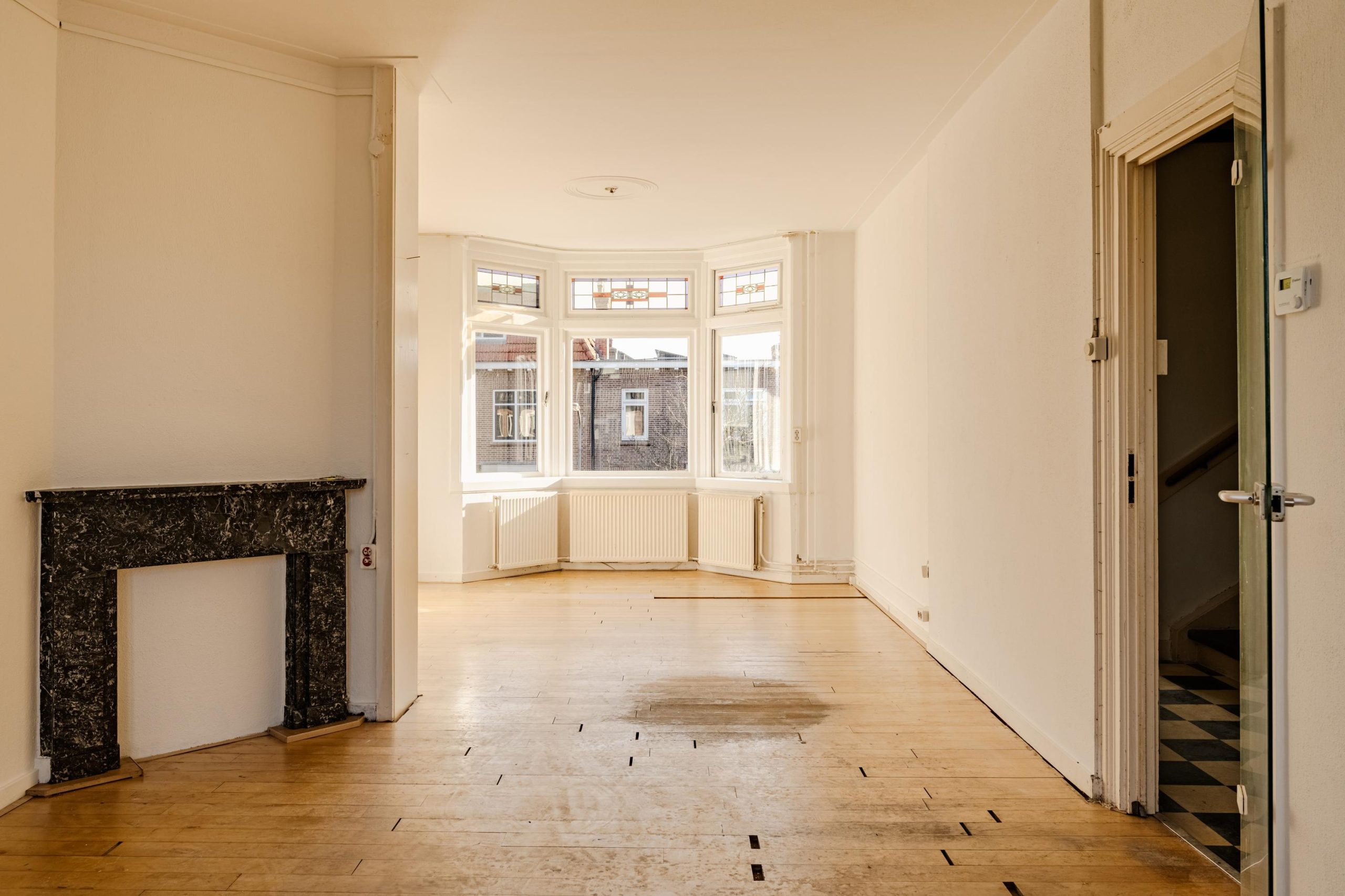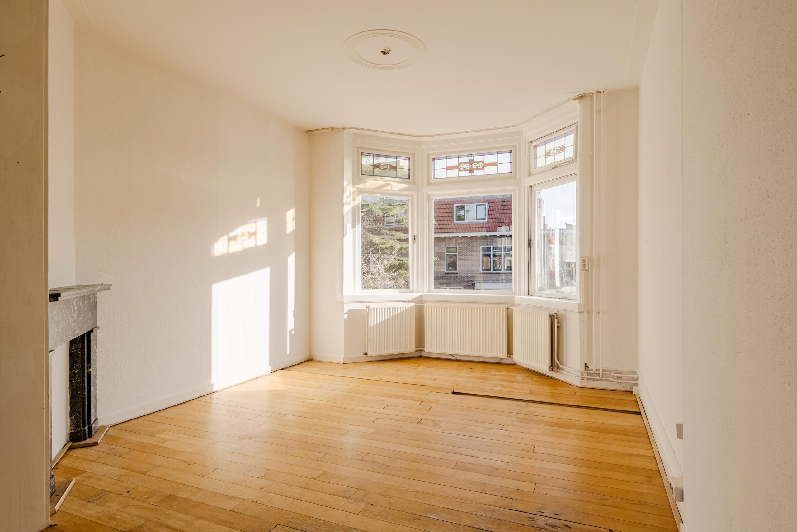 Aan de voorzijde bevindt zich de lichte en ruime woonkamer met erker, houten vloer en karakteristieke details zoals een glas in lood bovenlicht en een marmeren schouw. De ruimte biedt volop plaats voor een comfortabele zithoek en een royale eettafel.