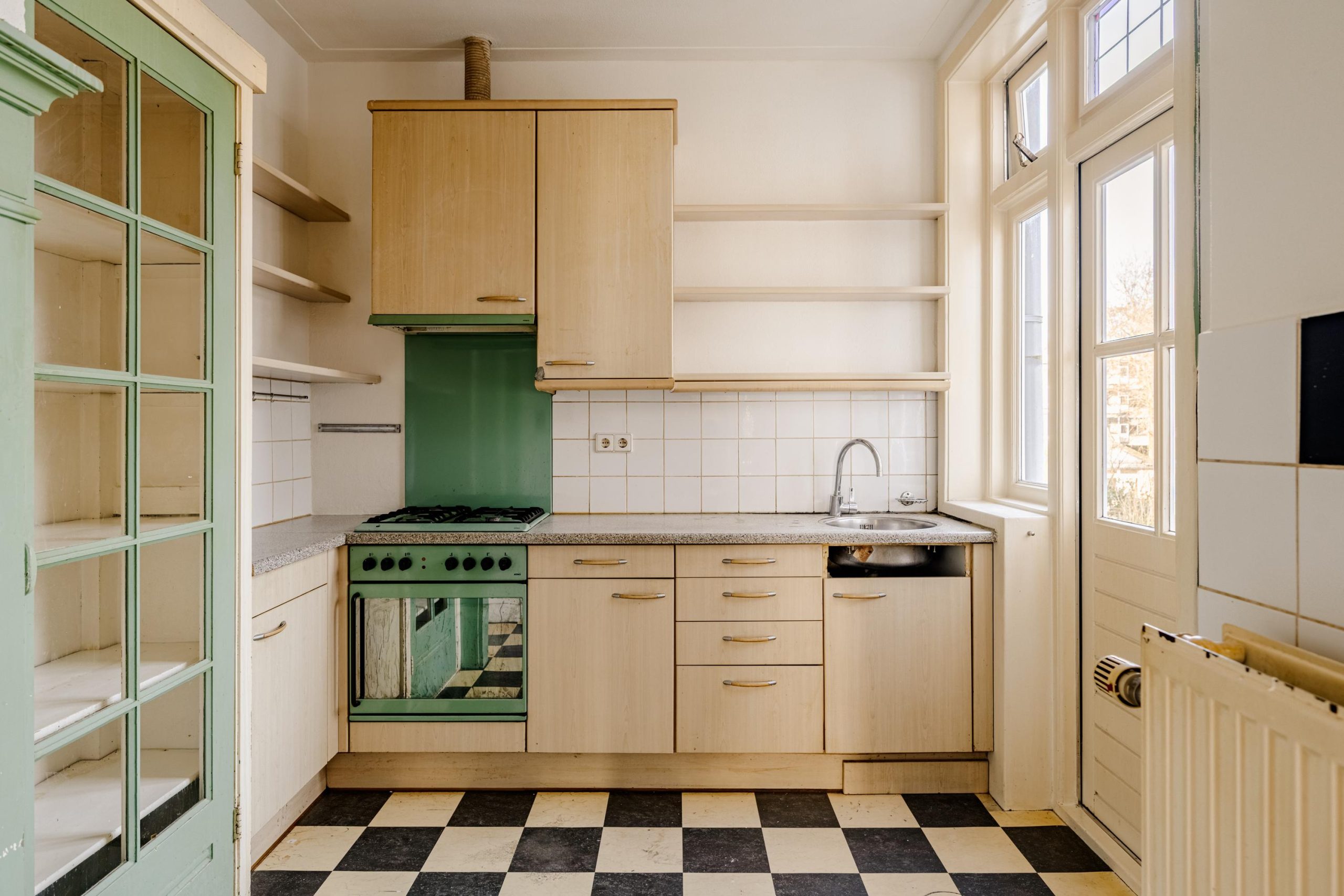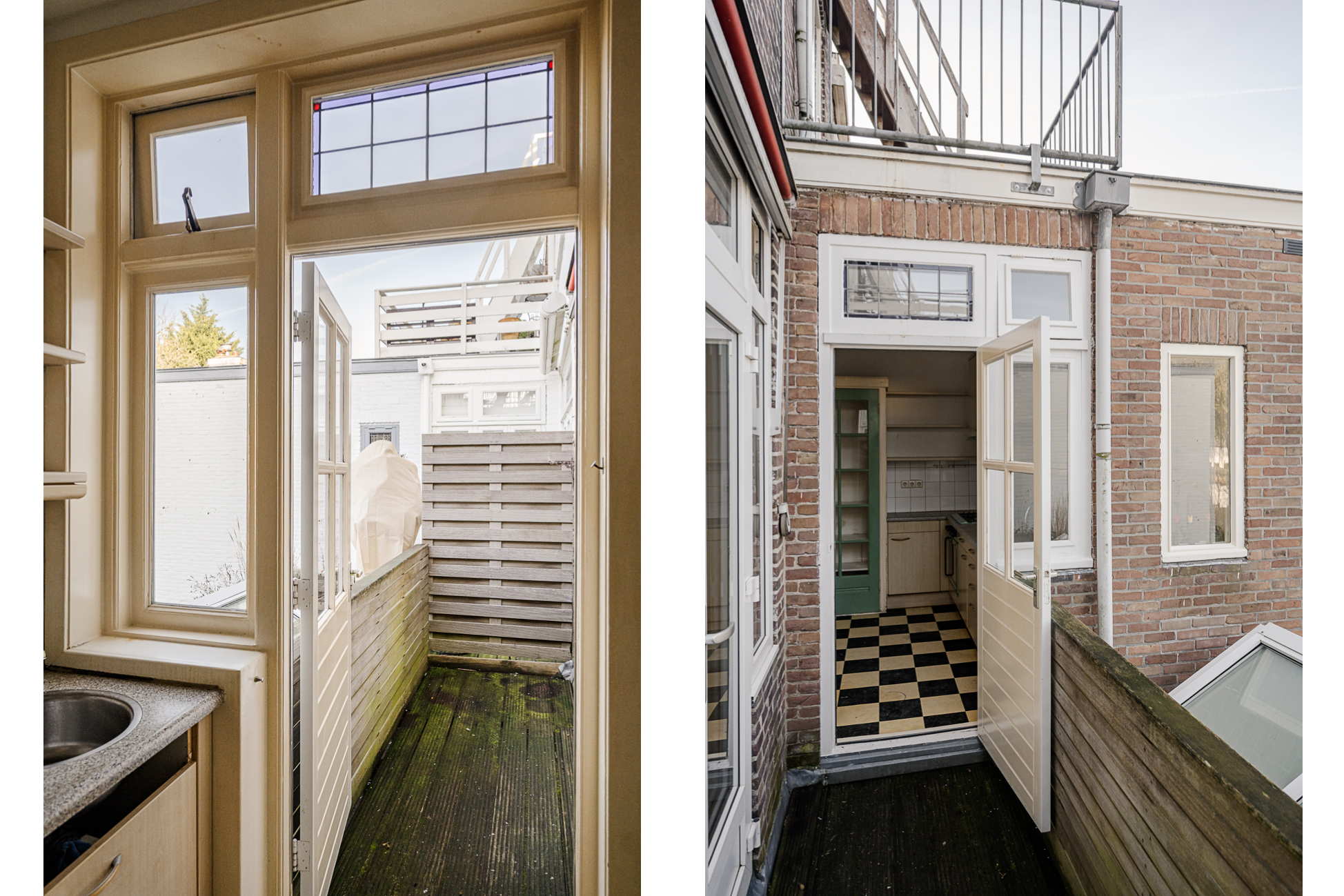 Aan de achterzijde ligt de keuken met toegang tot het eerste dakterras, een beschutte plek die zich perfect leent voor een kop koffie in de ochtendzon of een lunch buiten.