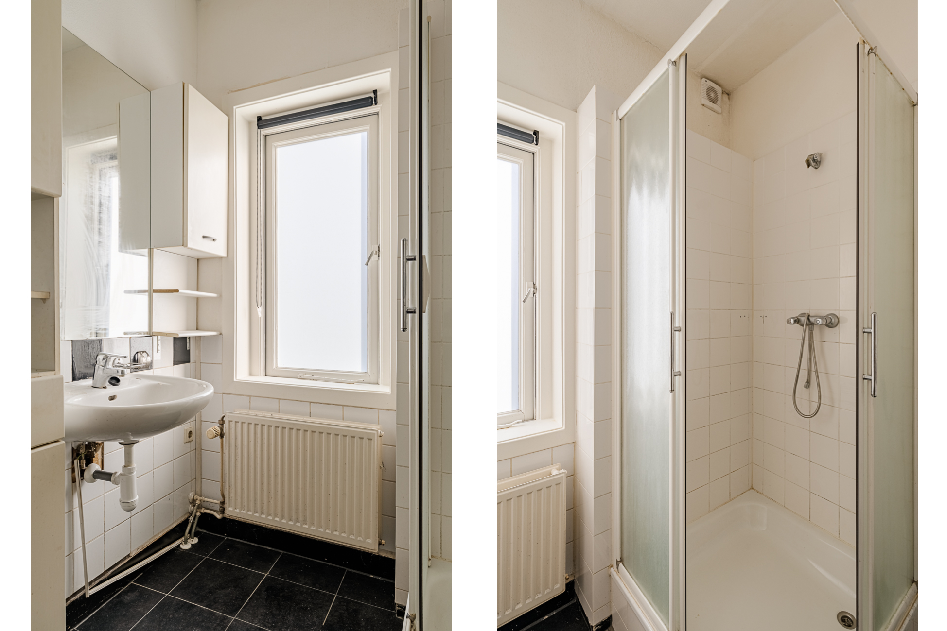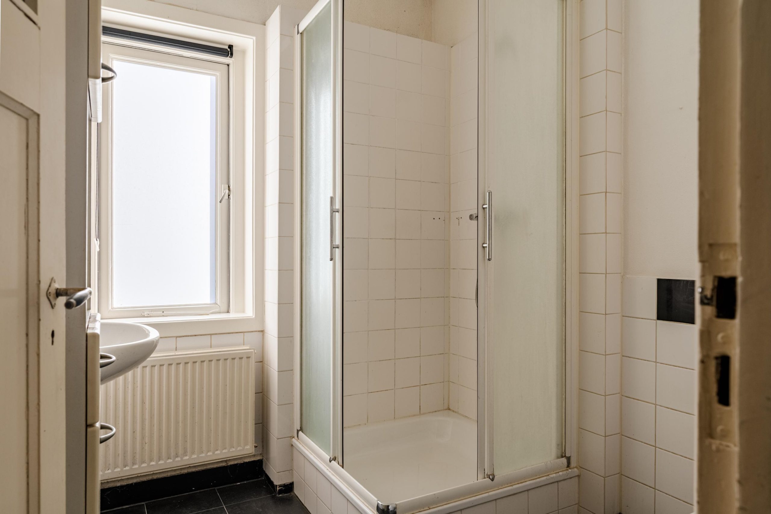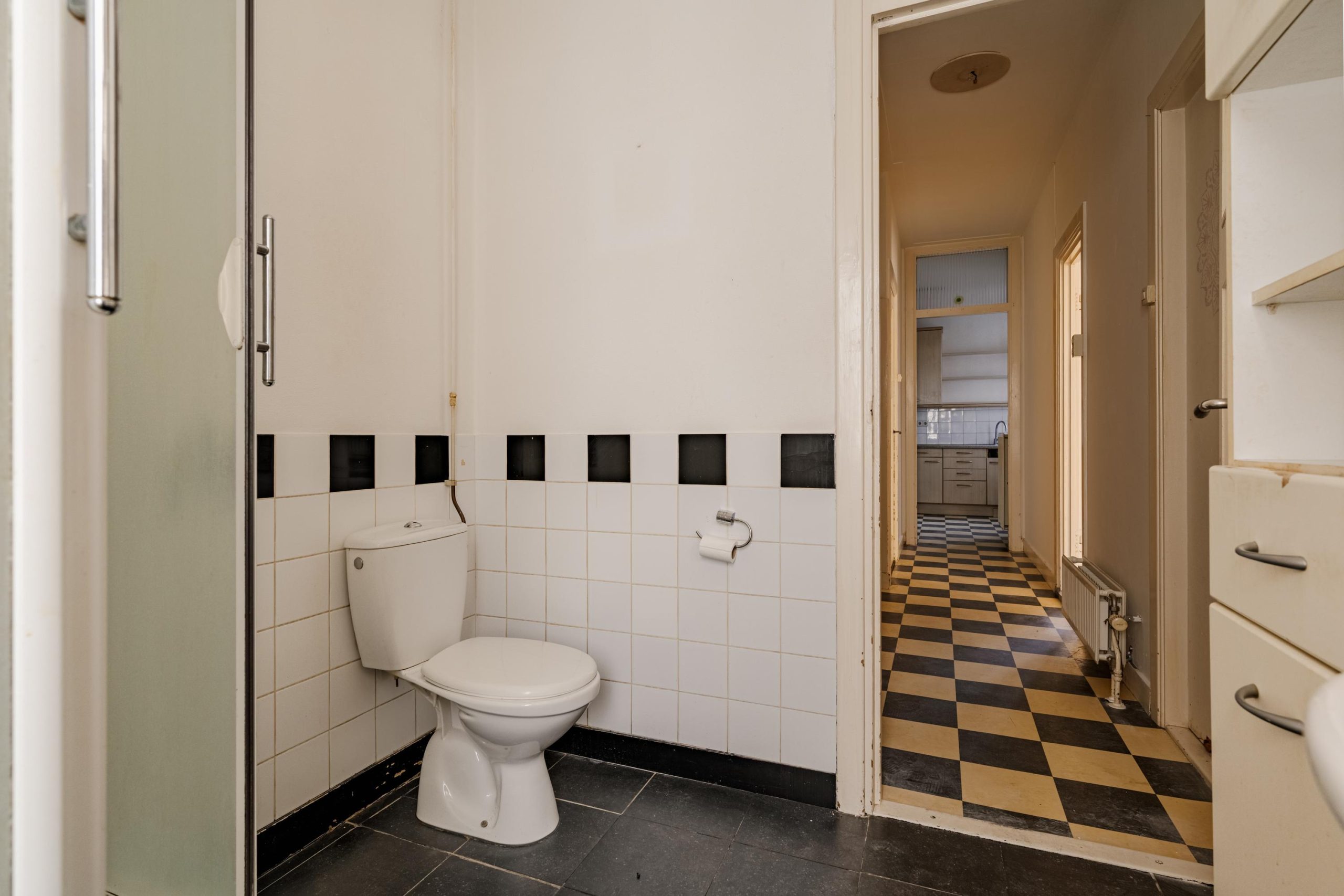 Aan de voorzijde van de woning ligt de badkamer, voorzien van een toilet, wastafel, douche en raam voor daglicht en ventilatie. Dit is het enige toilet in de woning.