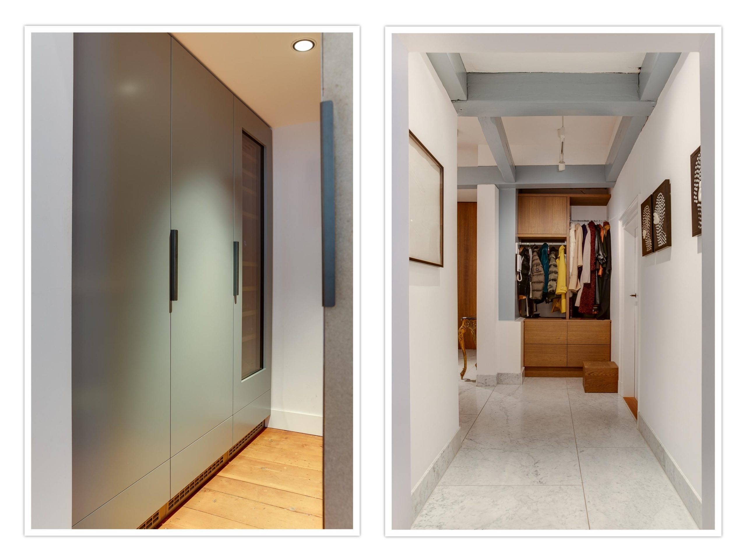Vanuit de hal achter kom je vervolgens in een pantry en een aparte C.V.-ruimte. Aangrenzend bevindt zich een ruimte met inbouwkasten die nu als kantoor-/praktijkruimte wordt gebruikt.