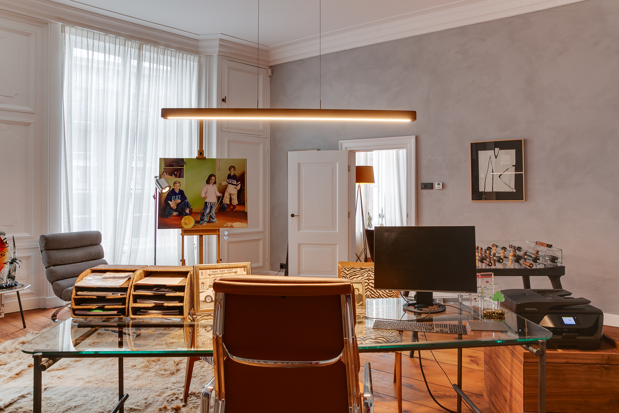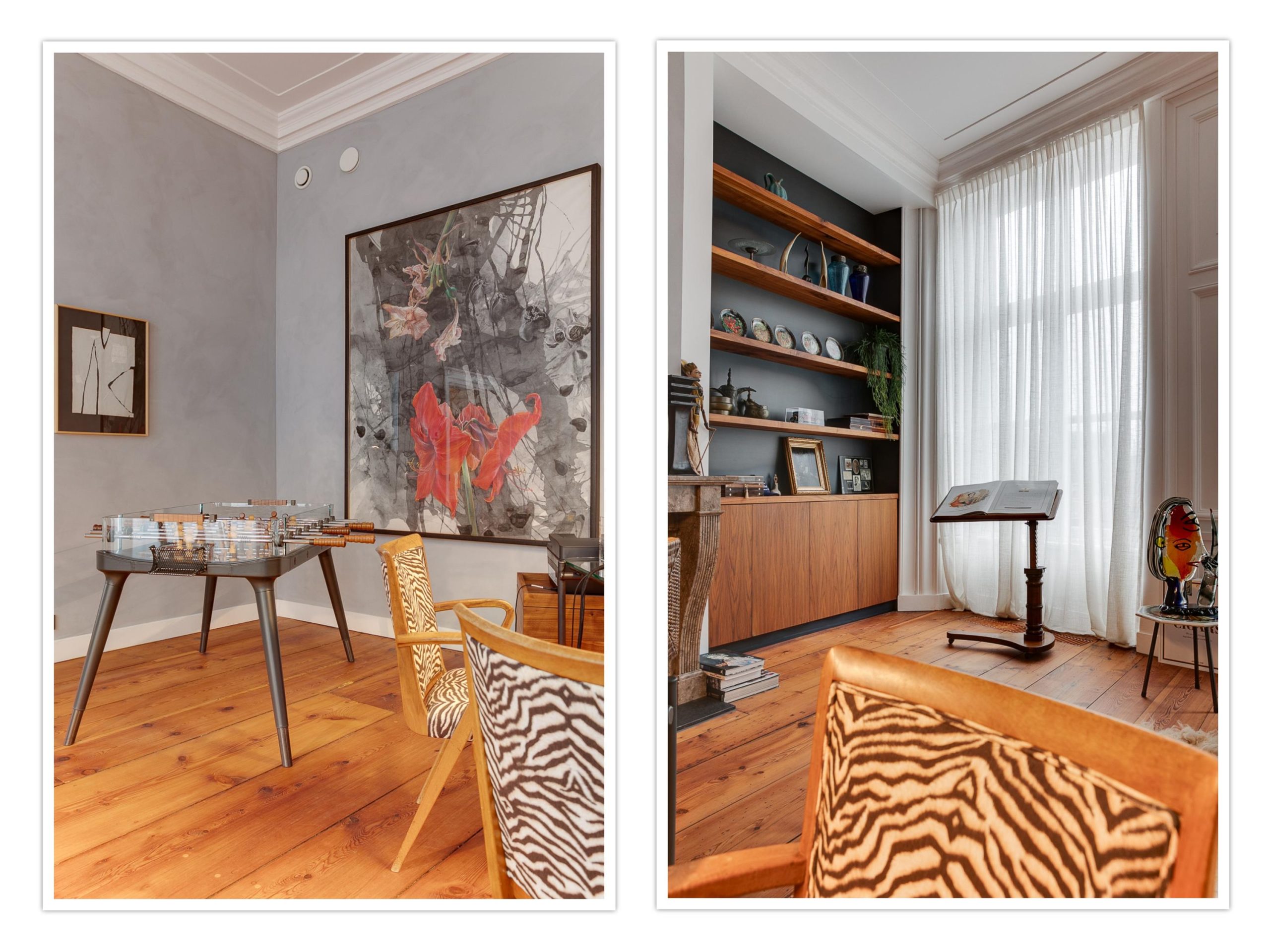 Je wordt ontvangen in een zeer ruime hal met toegang tot het toilet met wastafel en inloopdouche. Vanuit de hal kun je een aantal kamers bereiken. Zo bevinden zich de woonkamer, eetkamer en een extra (werk)kamer zich aan de voorzijde. Alle kamers zijn voorzien van inbouwkasten; in twee kamers staan mooie marmeren schouwen.