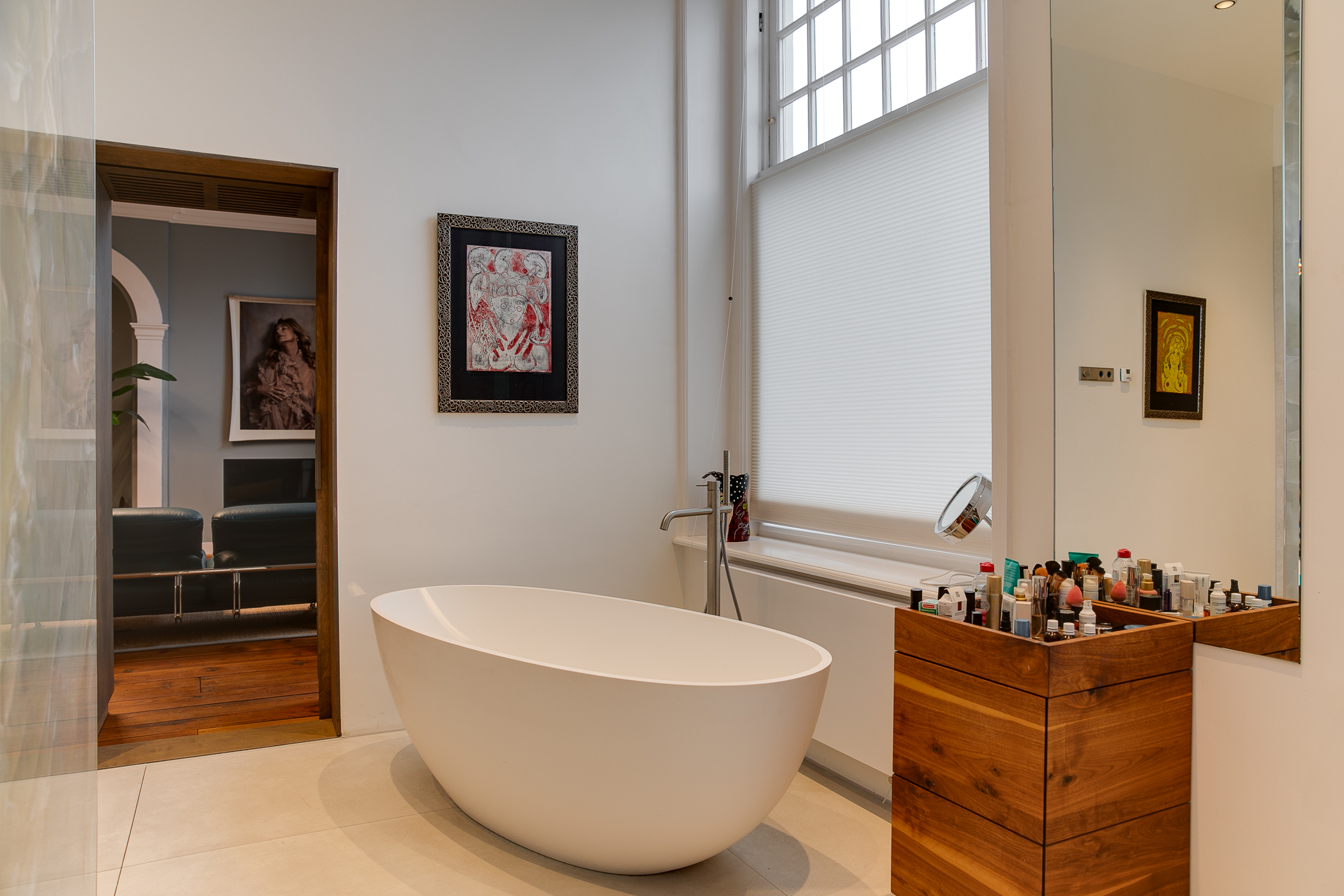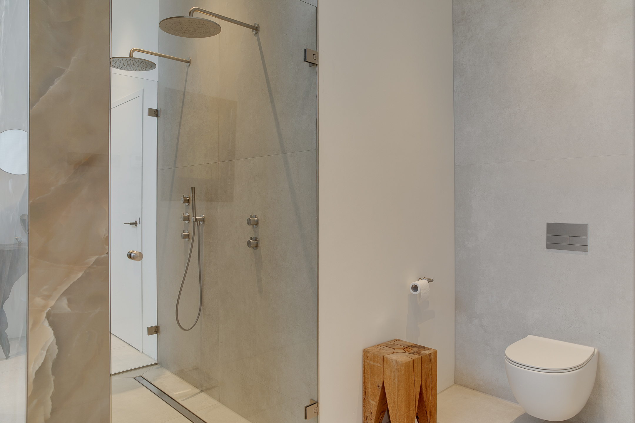 Aan de achterzijde bevindt zich de ruime slaapkamer met inbouwkasten en toegang tot de moderne badkamer met een dubbele wastafel, toilet, ligbad en dubbele douche. In de badkamer is tevens toegang tot de wasruimte met een aansluiting voor de wasmachine en droger.