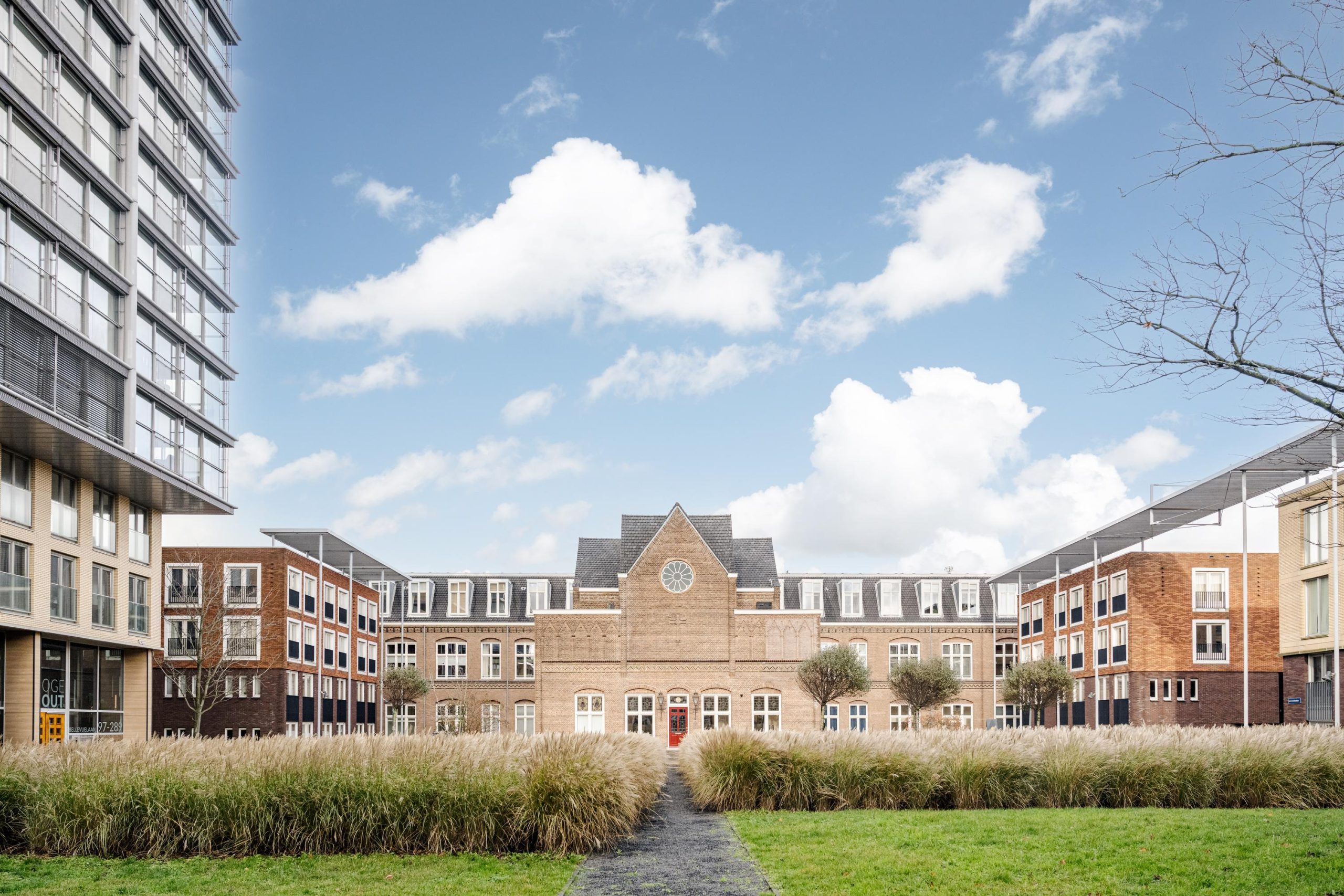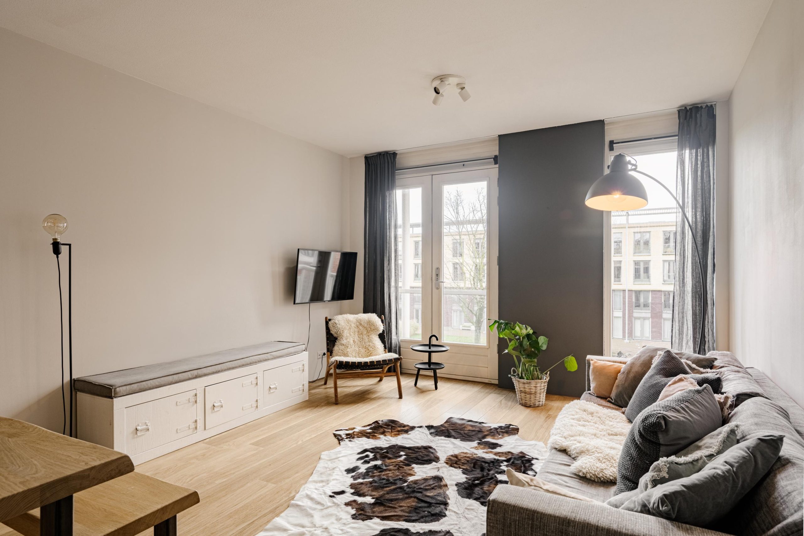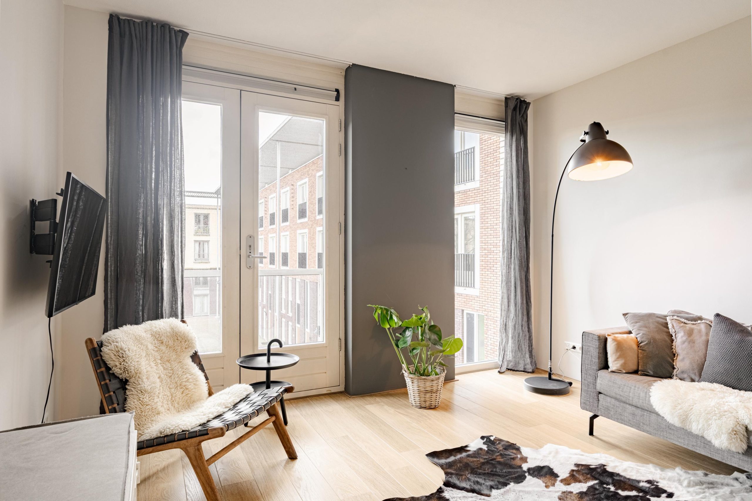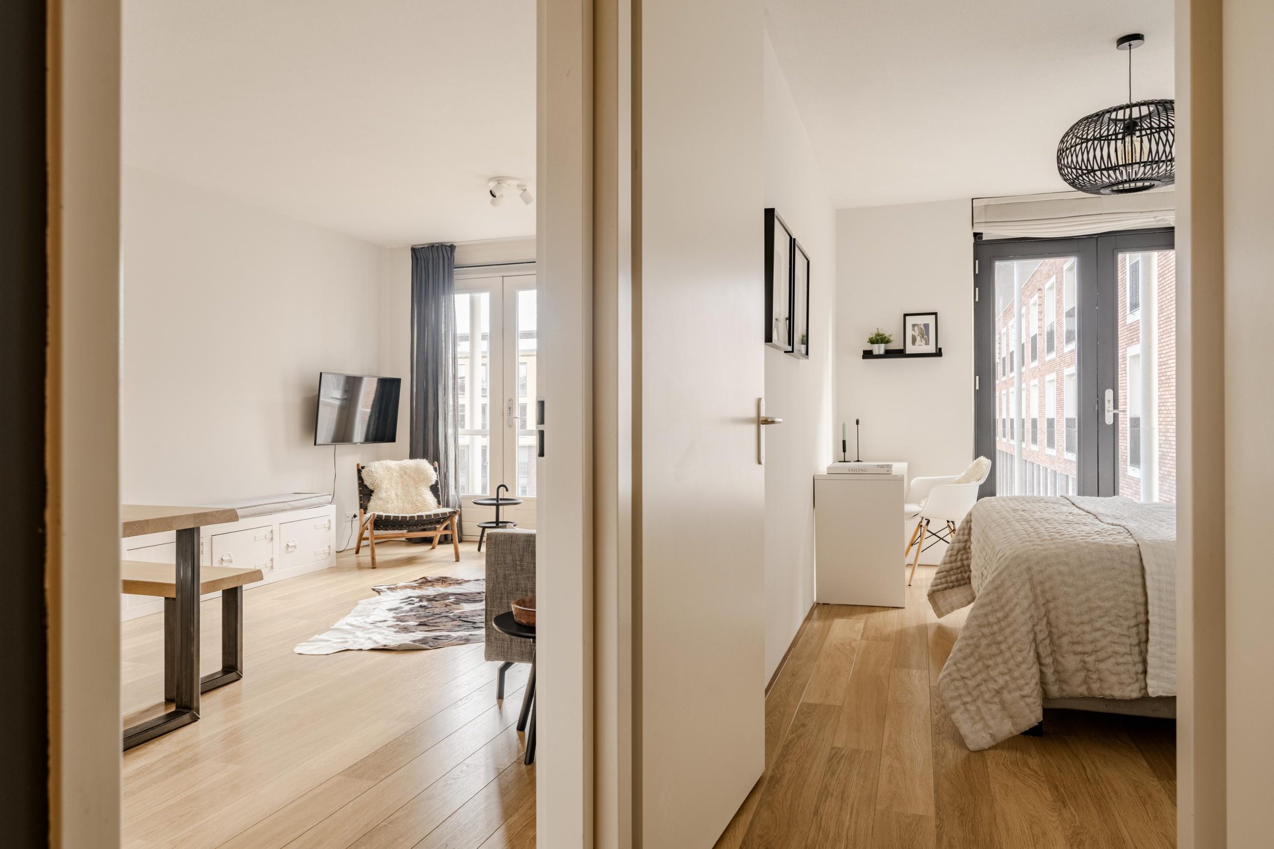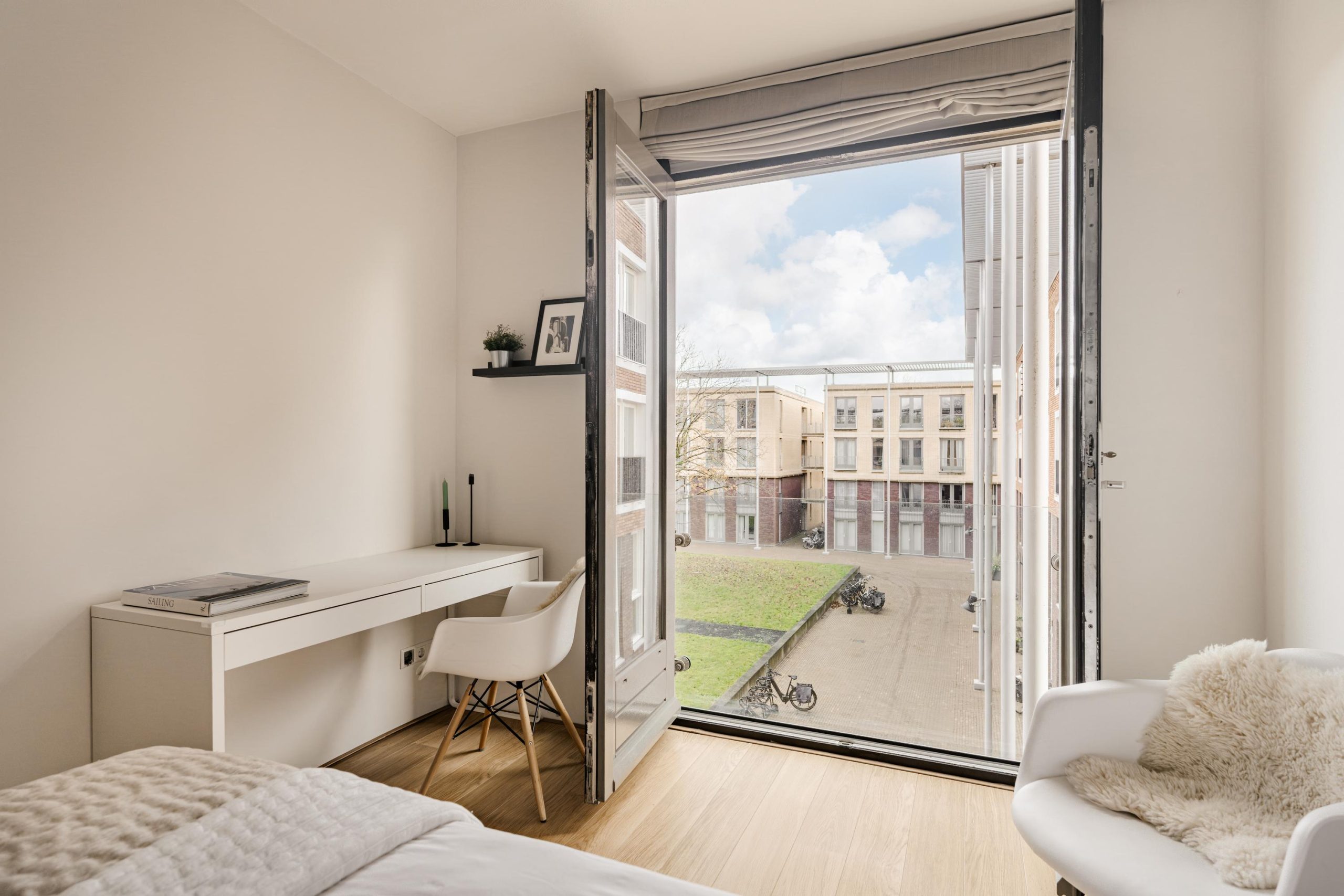 De living is open en licht, met hoge ramen en openslaande deuren naar een Frans balkon. Je kijkt hier uit over het groene plein: een fijne, rustige plek midden in de stad. De open keuken is uitgerust met moderne inbouwapparatuur en een ruime bergkast. Dit is een heerlijke plek om te leven, koken en ontspannen.