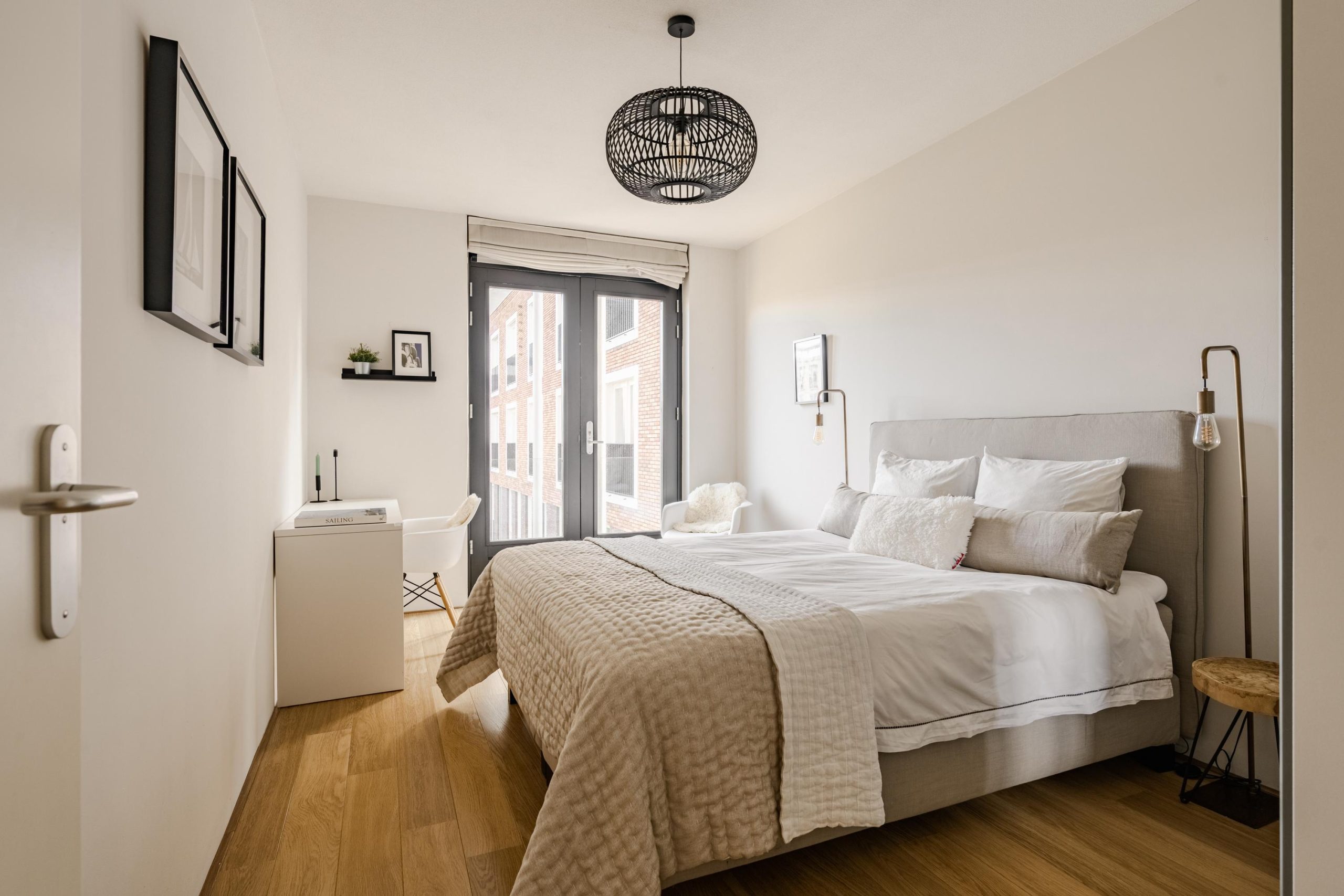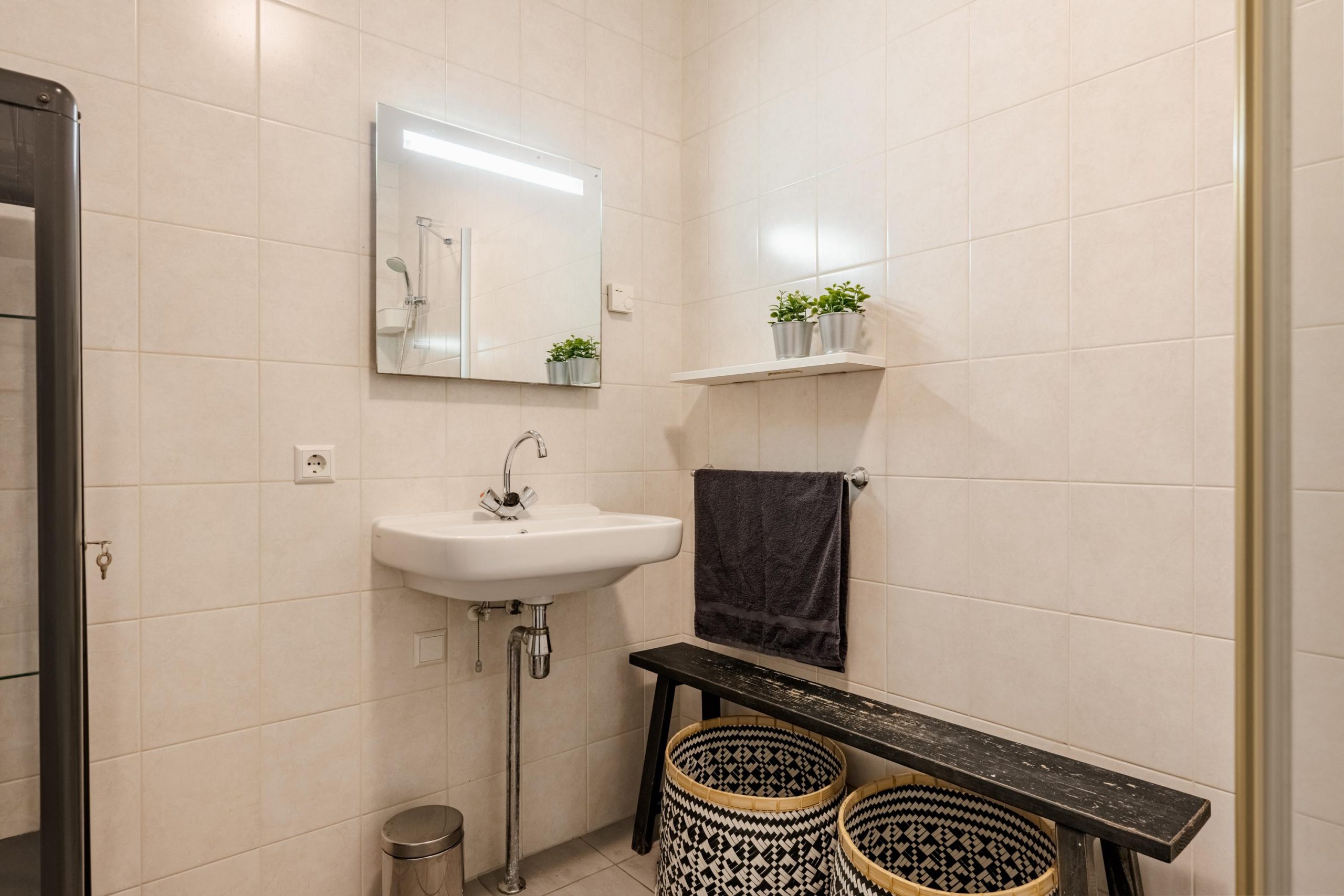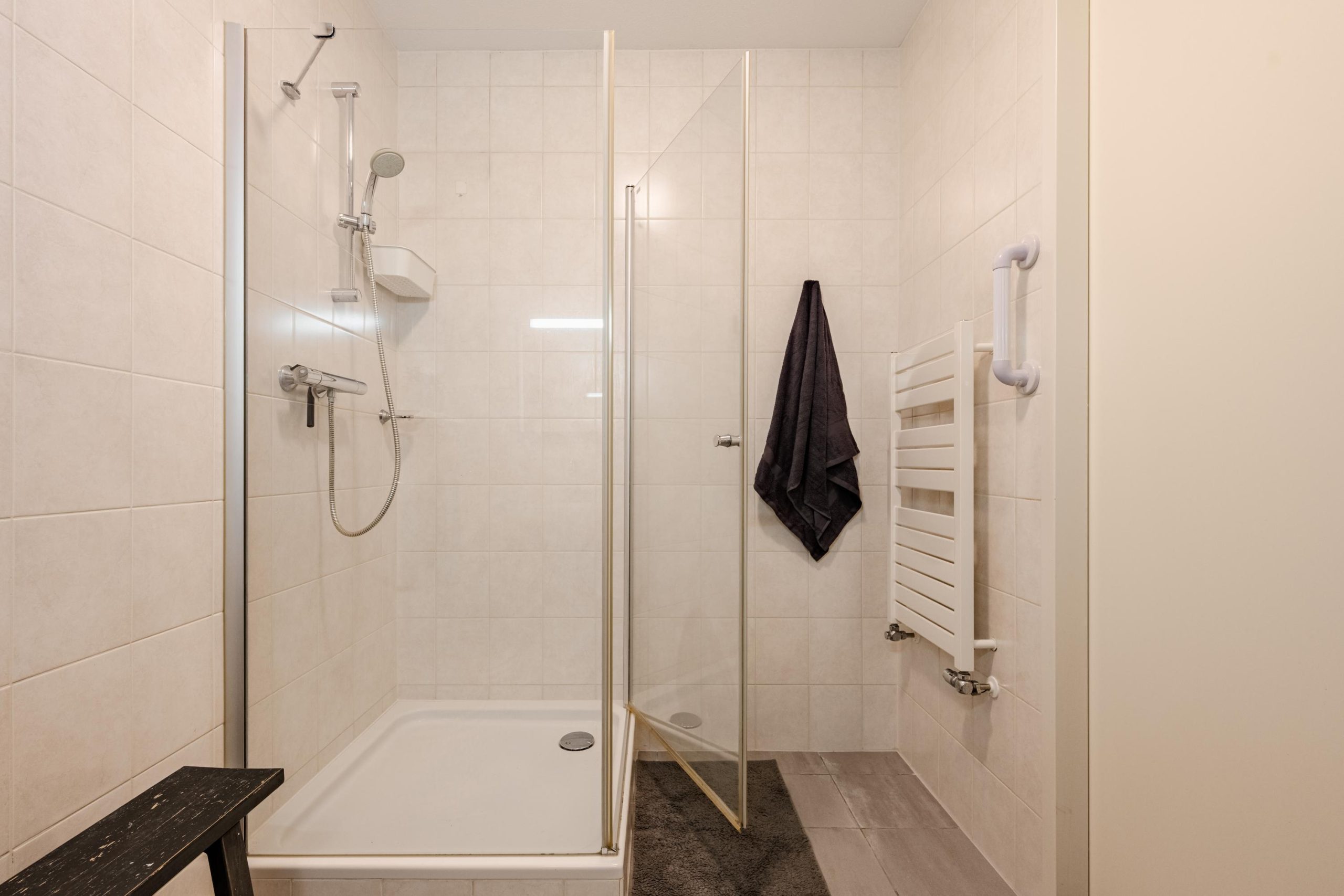 Aan de rustige zijde van het appartement ligt de ruime slaapkamer met uitzicht op de tuin. De badkamer is voorzien van een douche en wastafel.