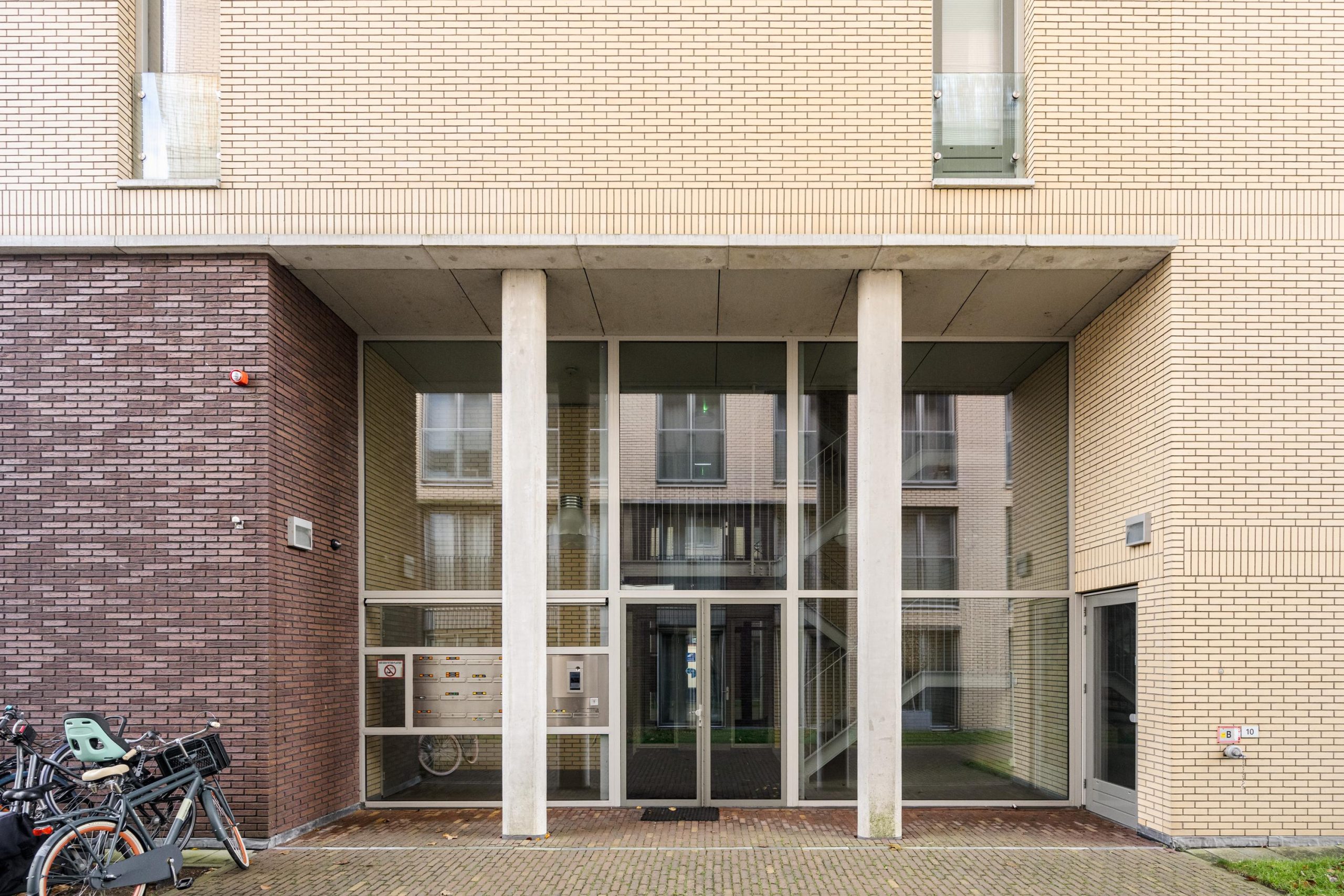 We komen binnen via de chique centrale hal met lift, video-intercom en trappenhuis. Vanaf hier bereiken we het appartement op de tweede verdieping.