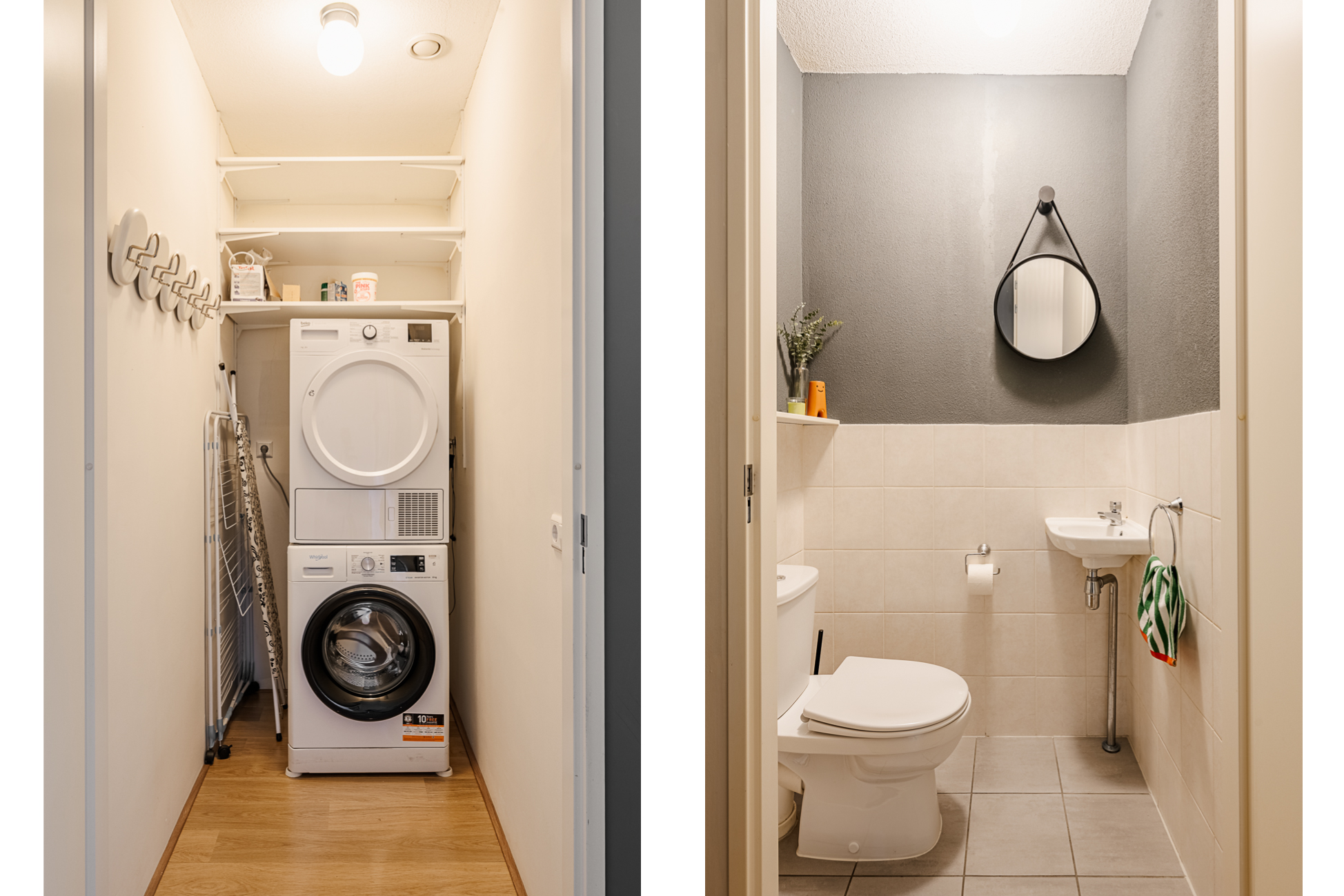 De hal is ruim en licht, met een hoog plafond dat direct een gevoel van ruimte geeft. Hier vinden we toegang tot de slaapkamer, badkamer, wasruimte, modern toilet en natuurlijk de woonkamer met open keuken.