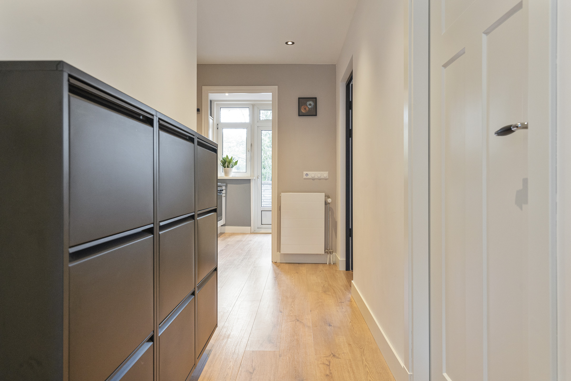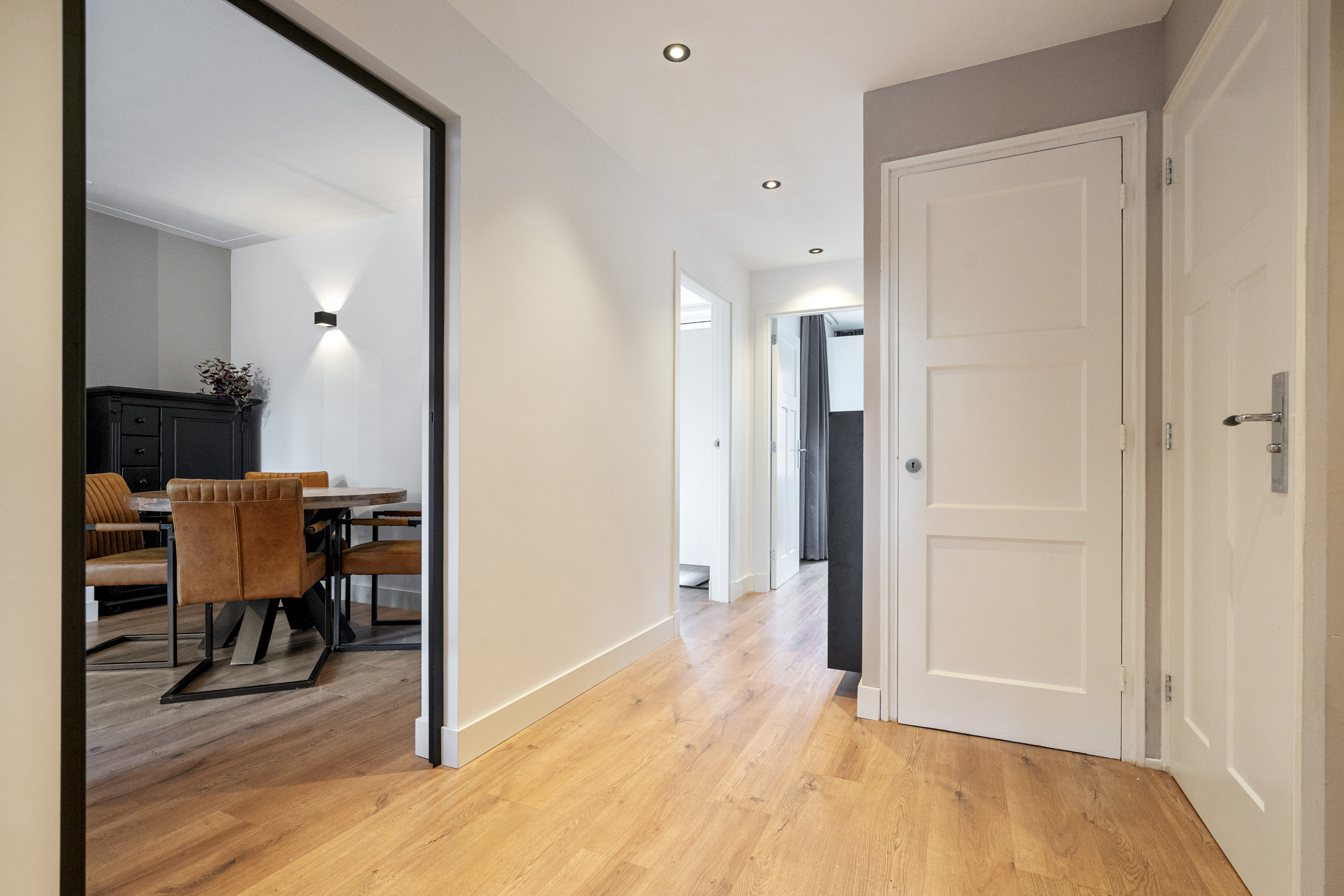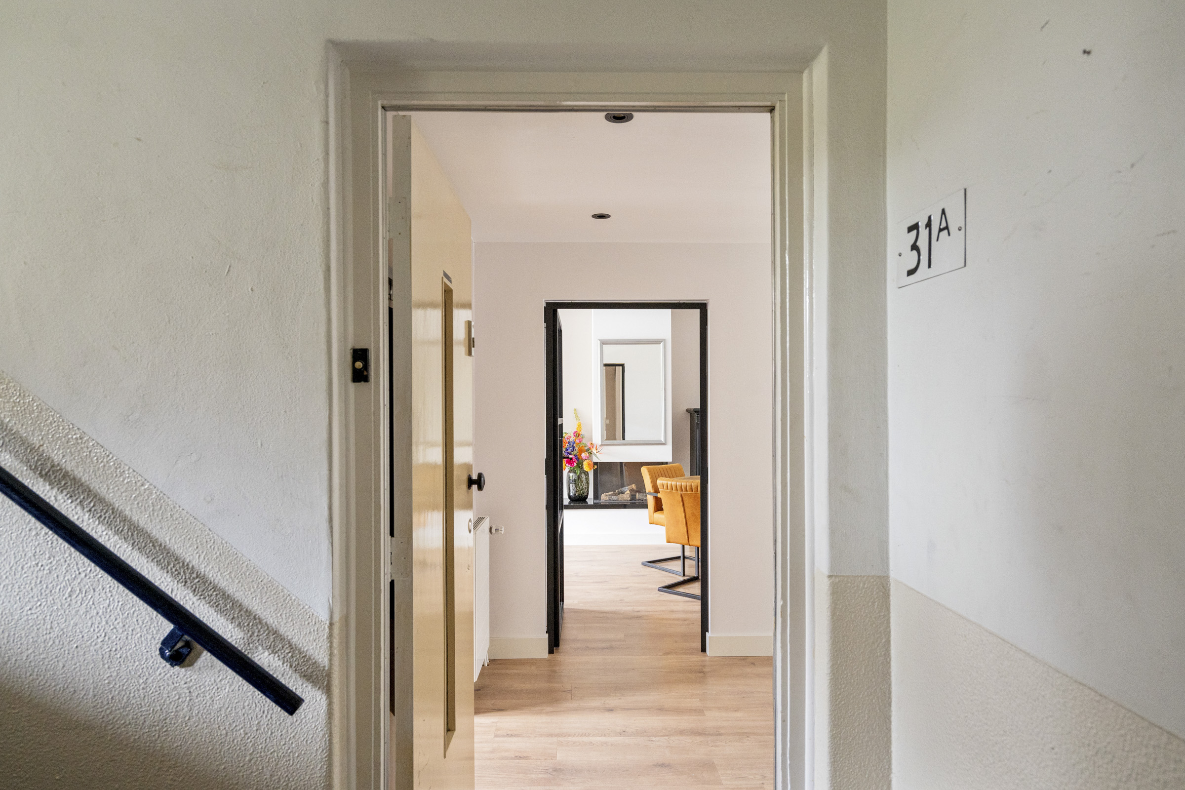 Via het gezamenlijke trappenhuis bereik je de eerste verdieping. Binnenkomst in de ruime hal die toegang geeft tot vrijwel alle vertrekken.