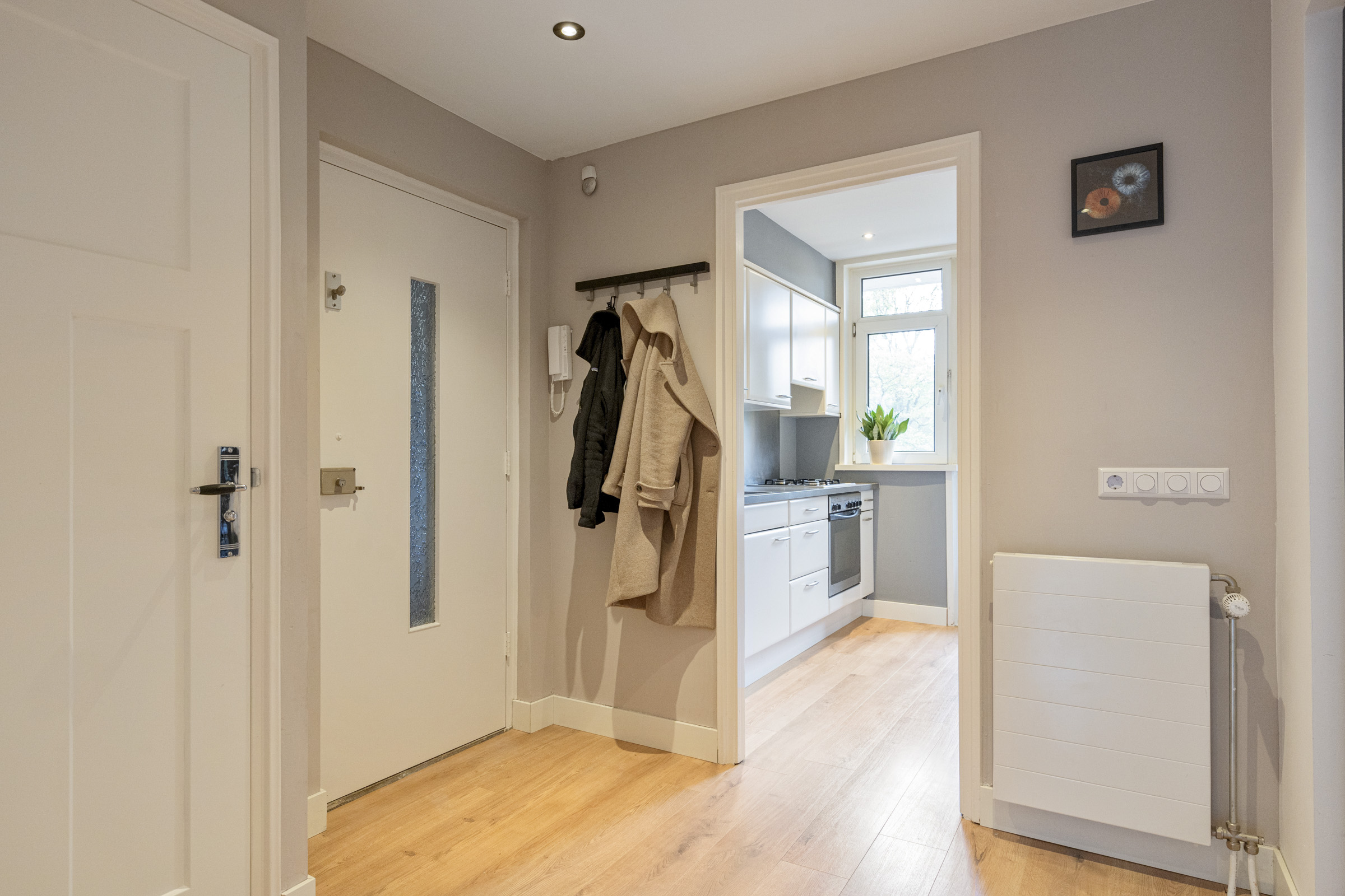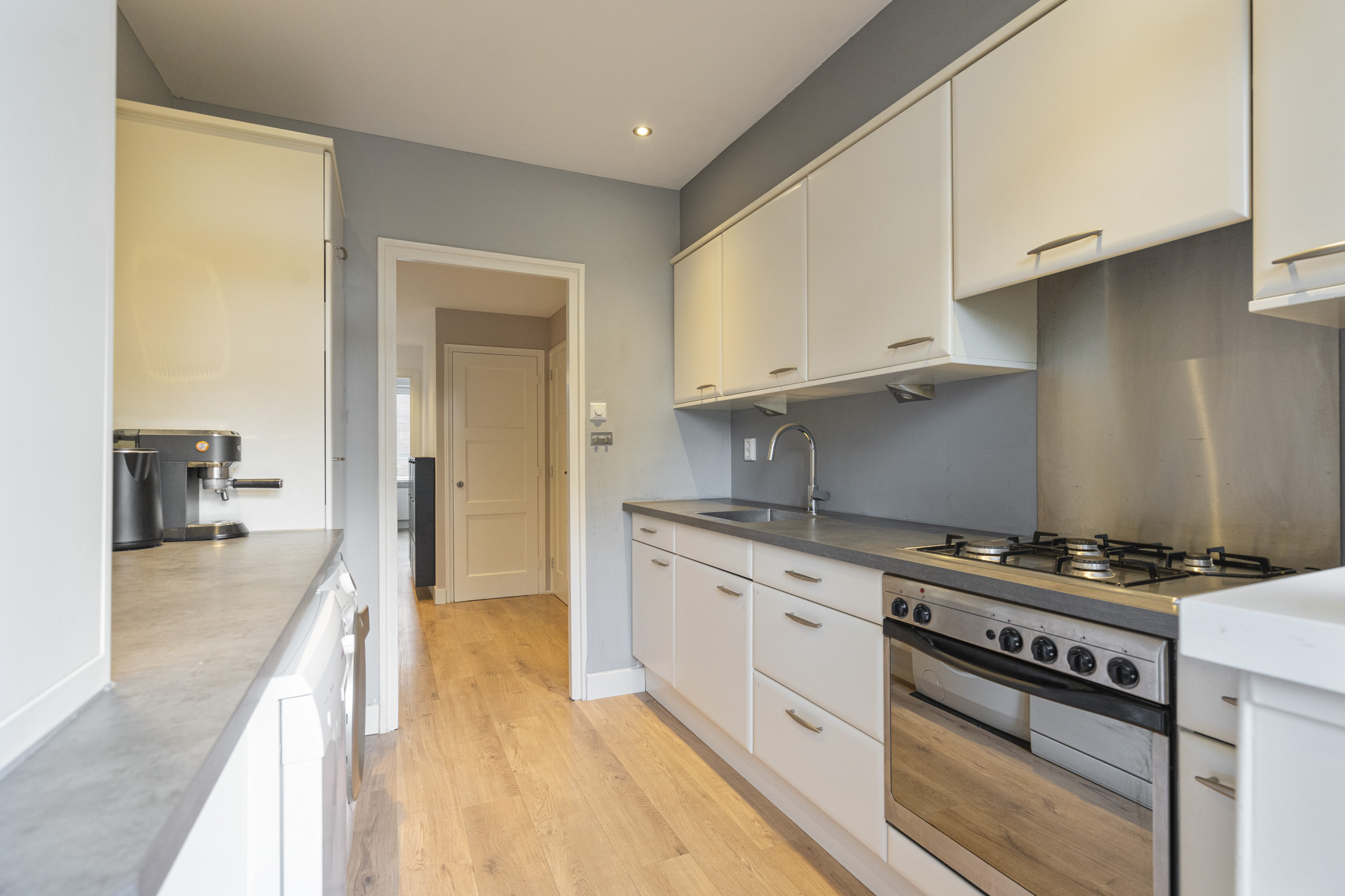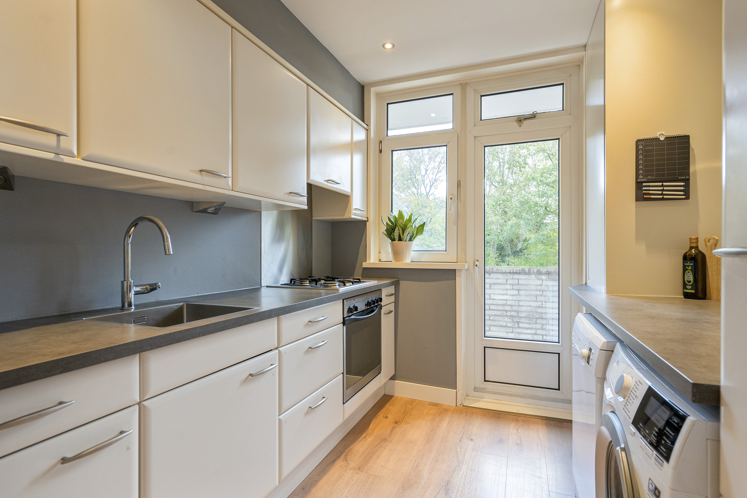 Aan de voorzijde ligt de keuken, uitgevoerd in een rechte opstelling met gaskookplaat, oven, spoelbak, aansluitingen voor wasmachine en droger én de opstelling van de cv-ketel. Vanuit de keuken heb je toegang tot het balkon aan de voorzijde, een fijne plek om de dag te beginnen.