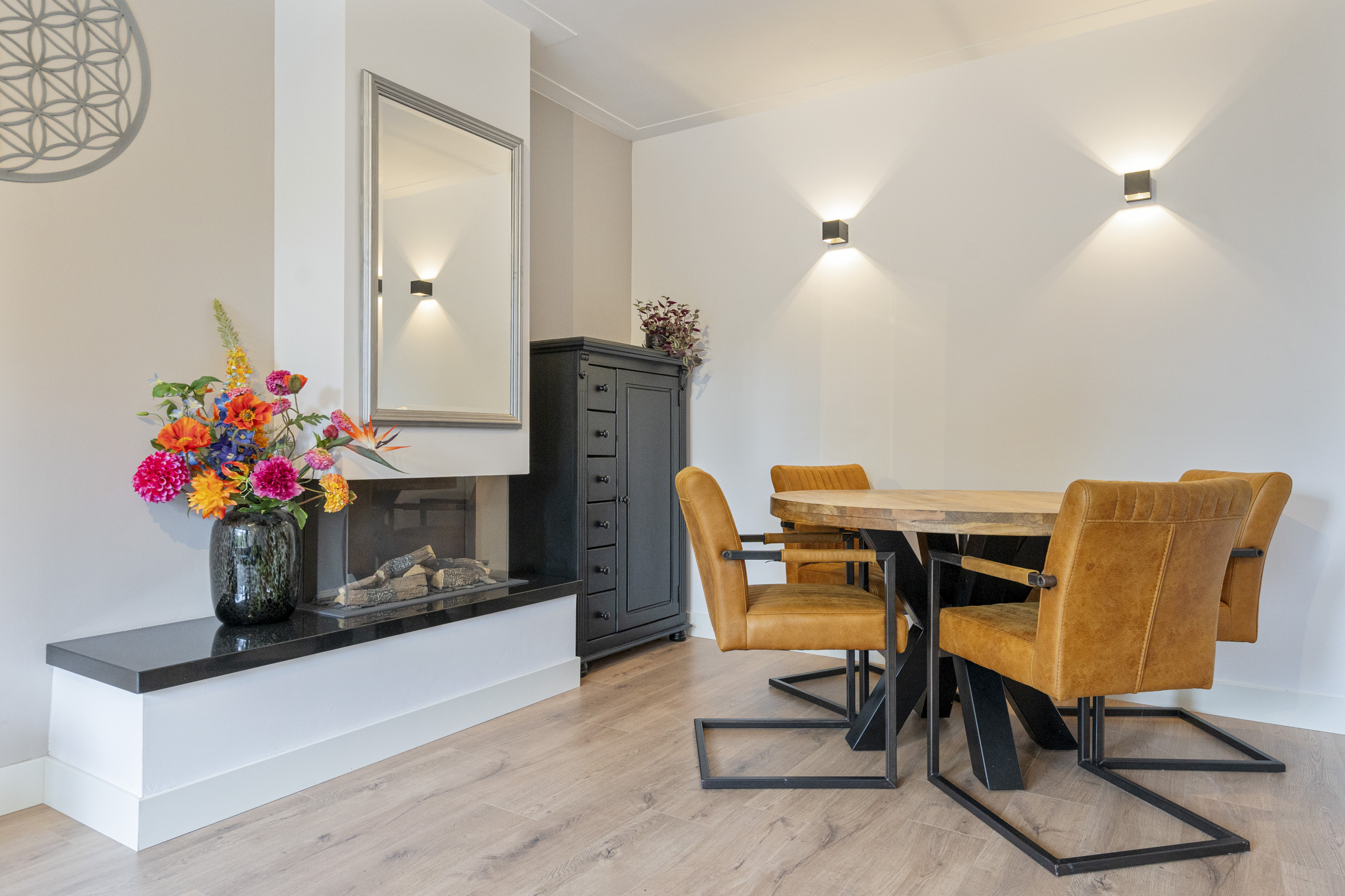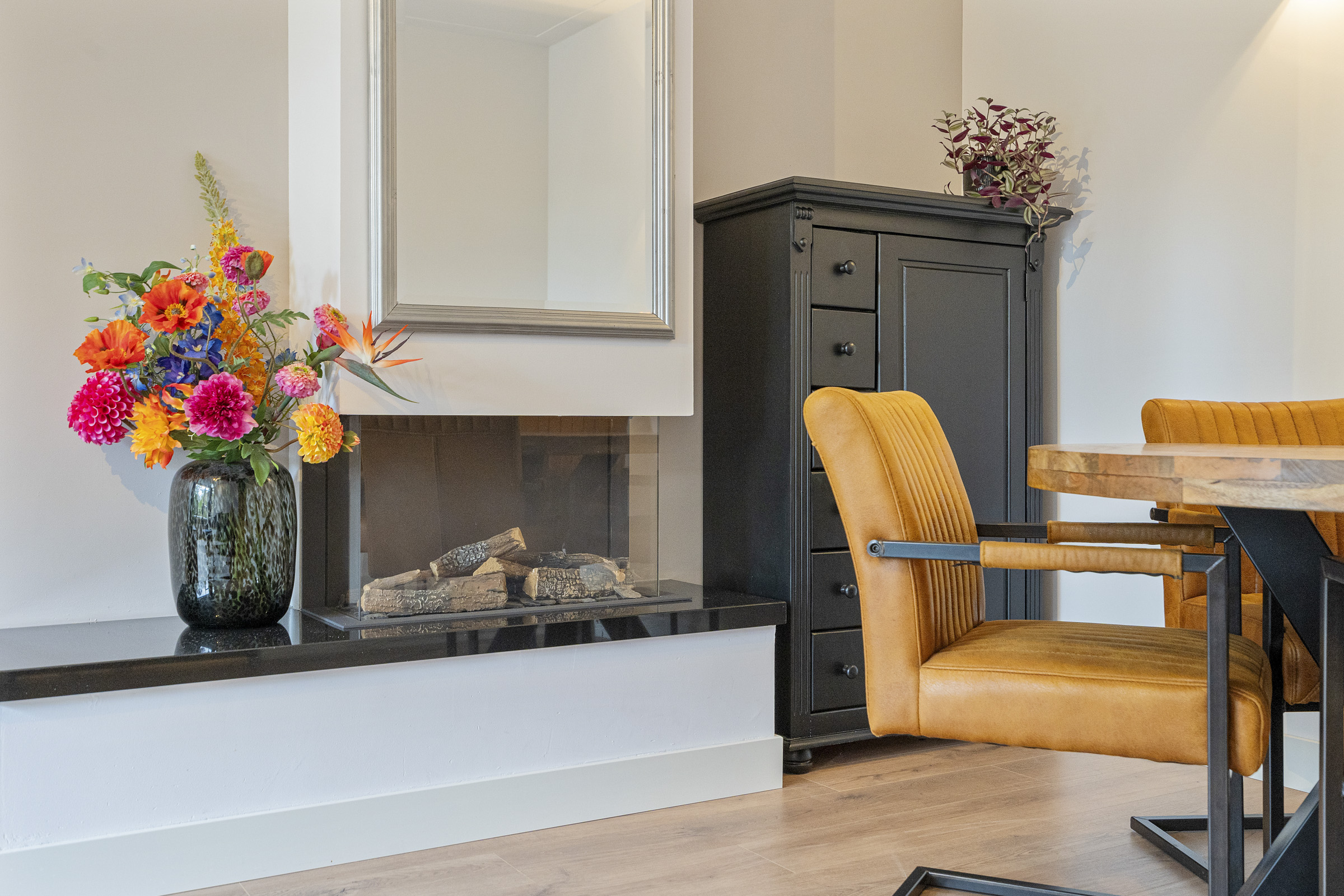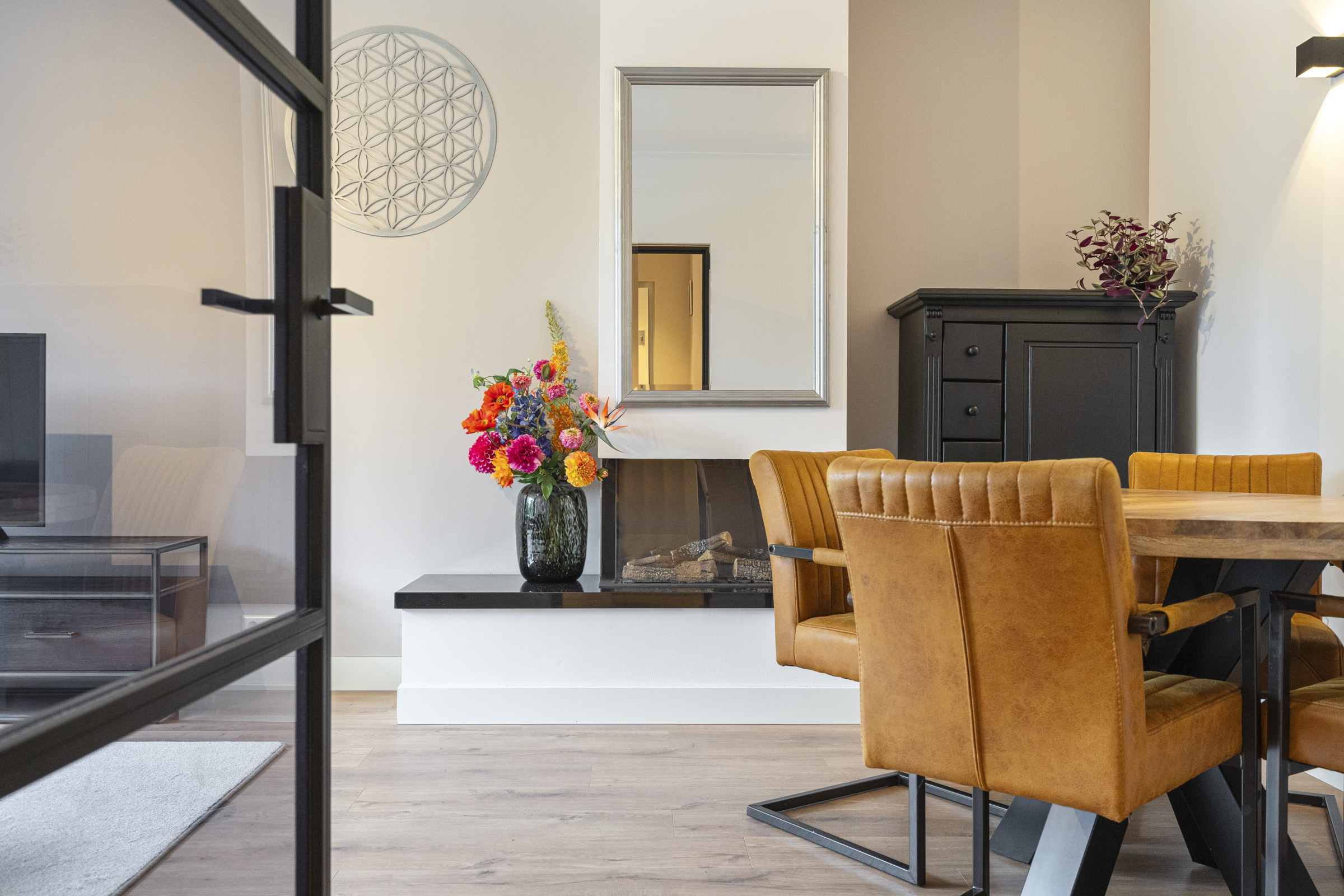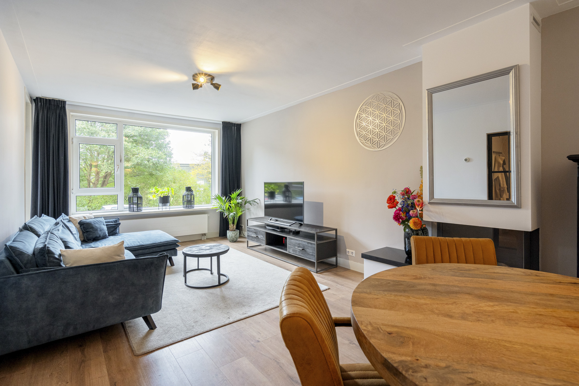 De sfeervolle woonkamer aan de voorzijde is voorzien van een gashaard, nette laminaatvloer en grote raampartijen die zorgen voor veel lichtinval. Een fijne plek voor zowel een zit- als eetgedeelte, met uitzicht op het groen aan de overkant.