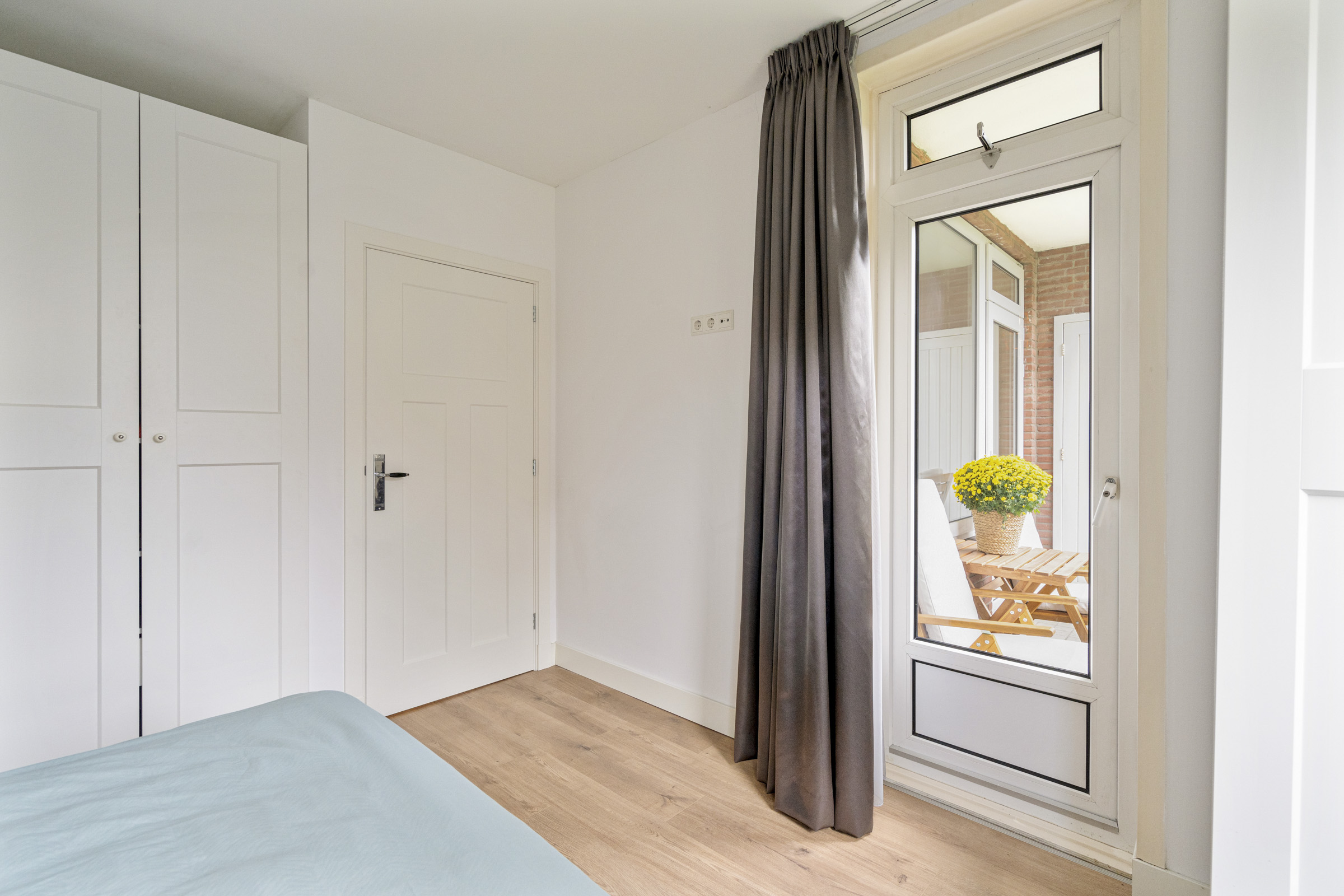 Aan de achterzijde bevinden zich twee slaapkamers. Zowel de ruime hoofdslaapkamer als de tweede kamer biedt toegang tot het zonnige balkon op het zuiden, met praktische bergkast.