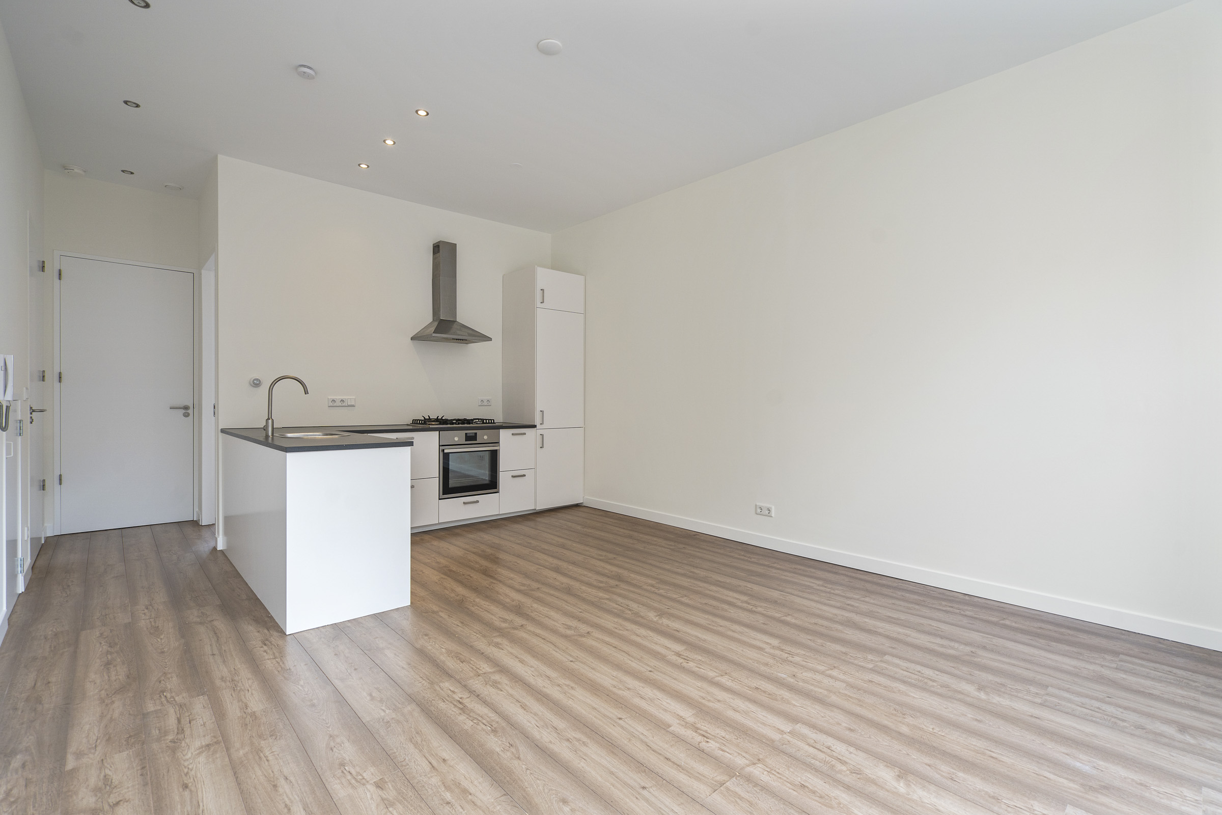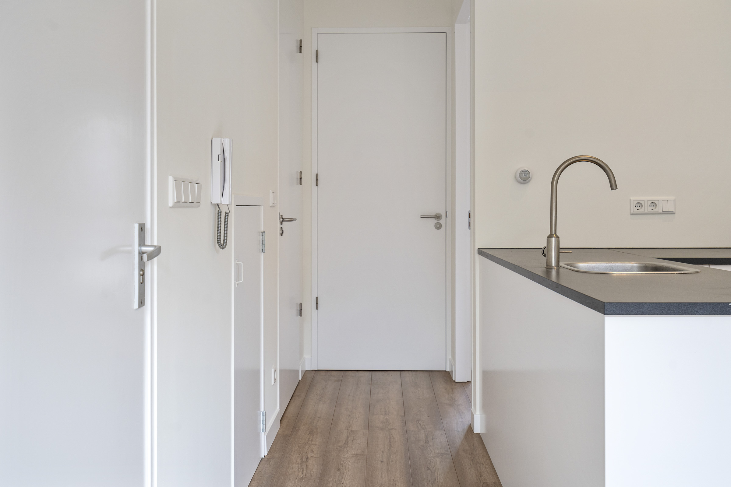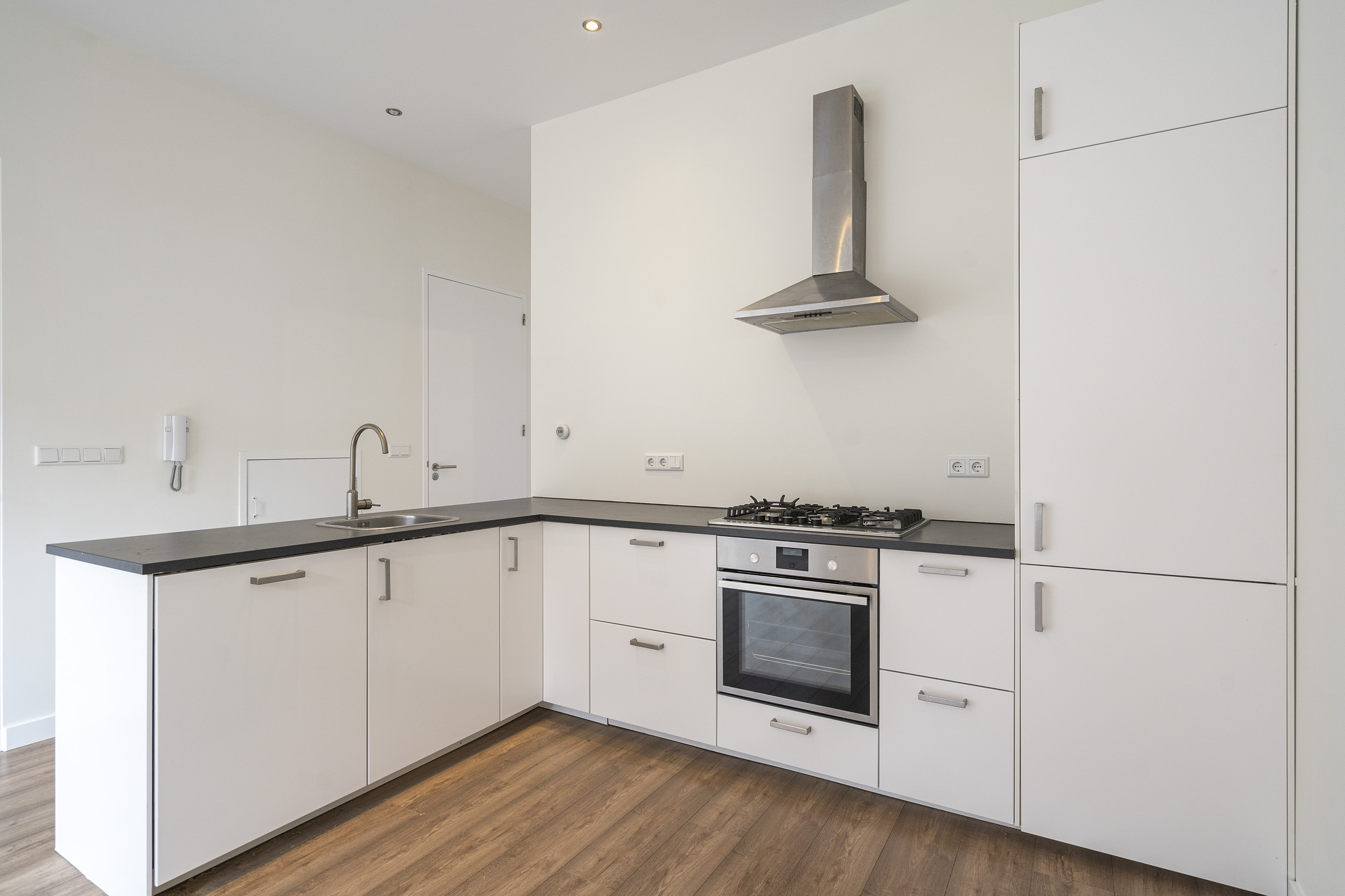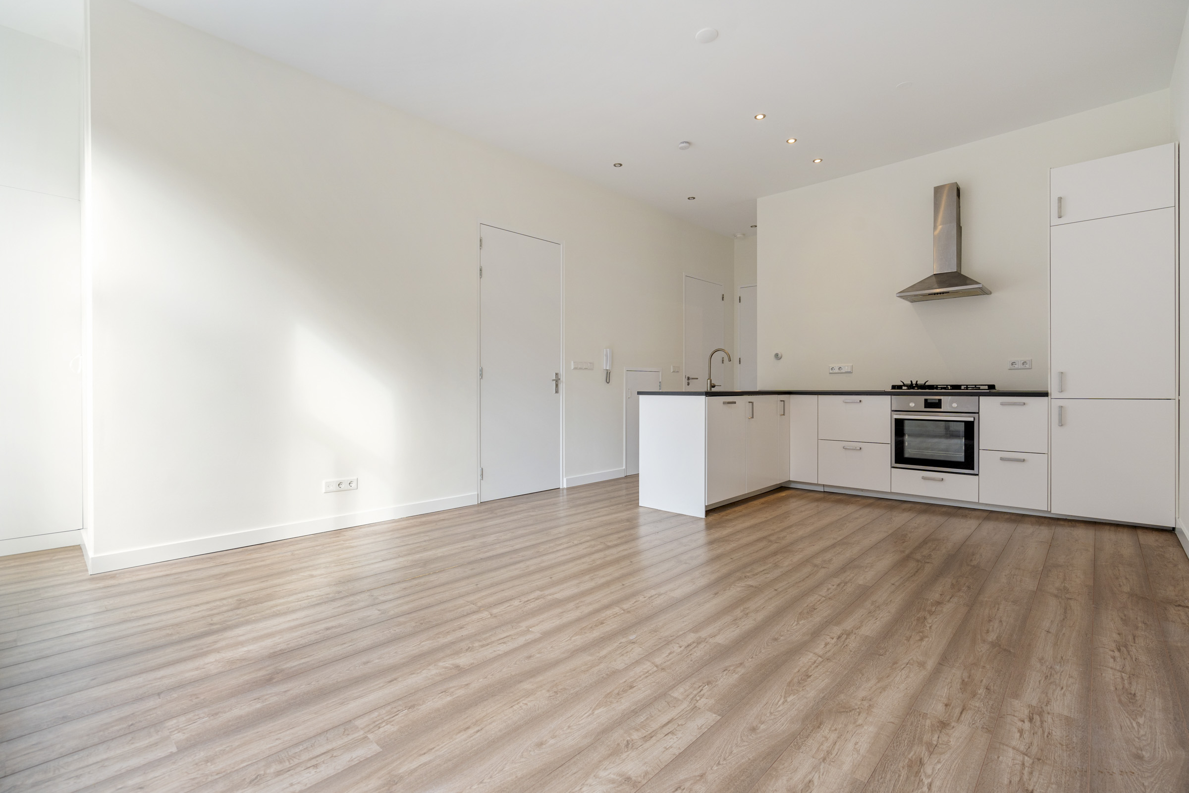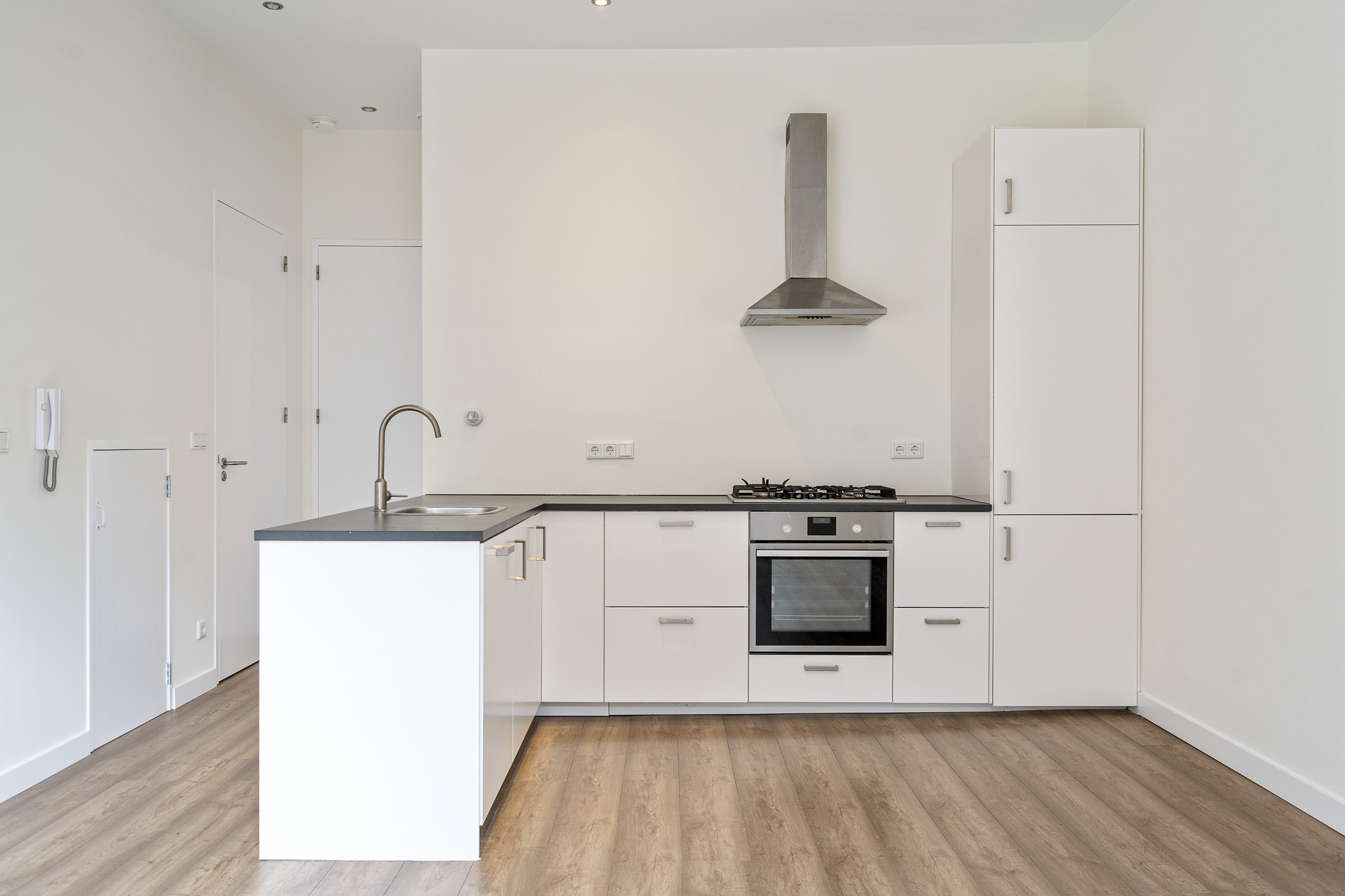 Binnenkomend aan de voorzijde ligt de lichte woonkamer met open keuken, waar hoge ramen zorgen voor veel daglicht en uitzicht op de charmante straat. Via de hal bereik je de slaapkamer aan de achterzijde, die grenst aan het zonnige dakterras, een heerlijke plek om buiten te zitten en te genieten van privacy. De badkamer is modern en ruim, met een inloopdouche, een stijlvol wastafelmeubel en plek voor de wasmachine. Er is daarnaast een separaat toilet.