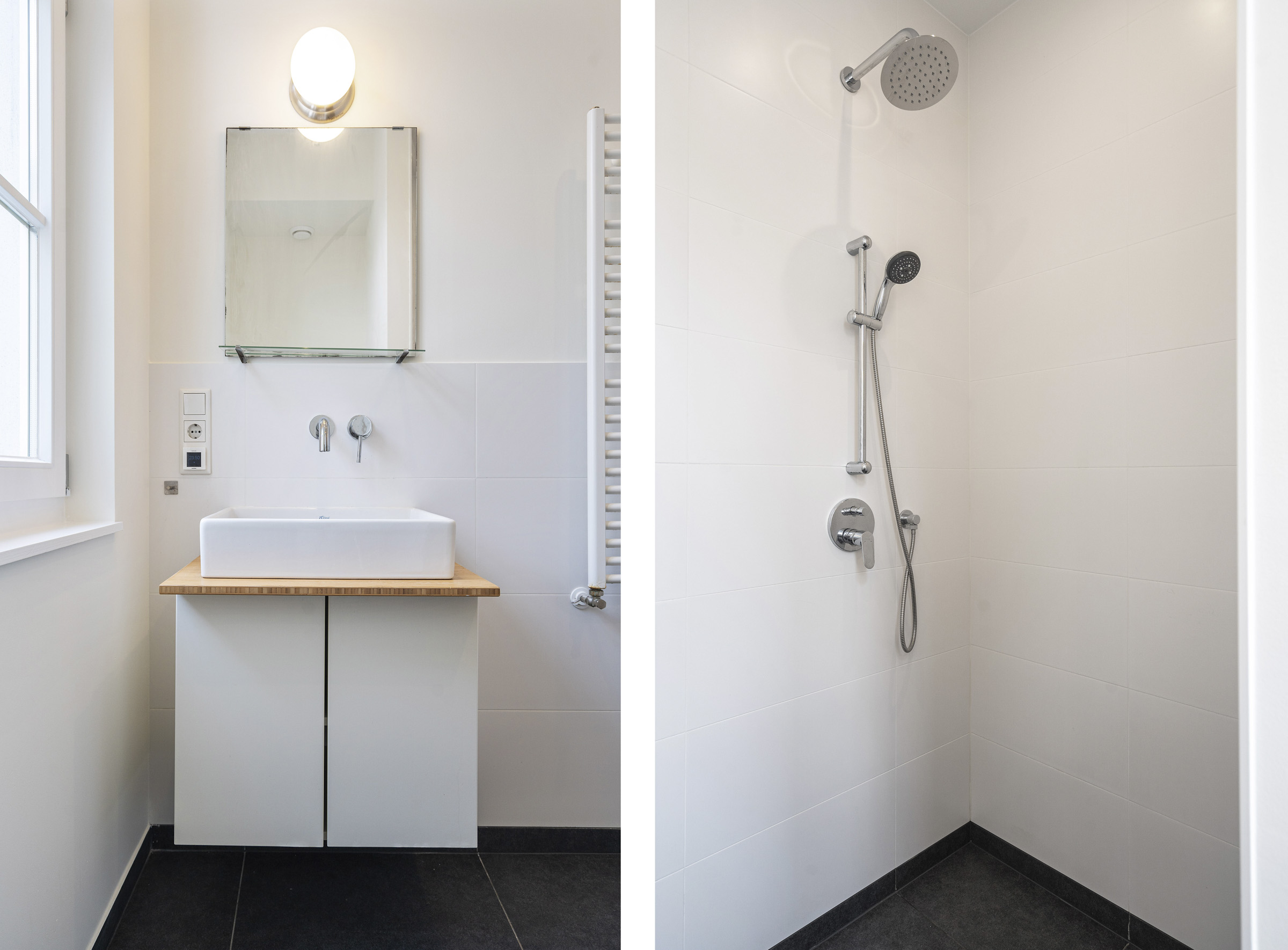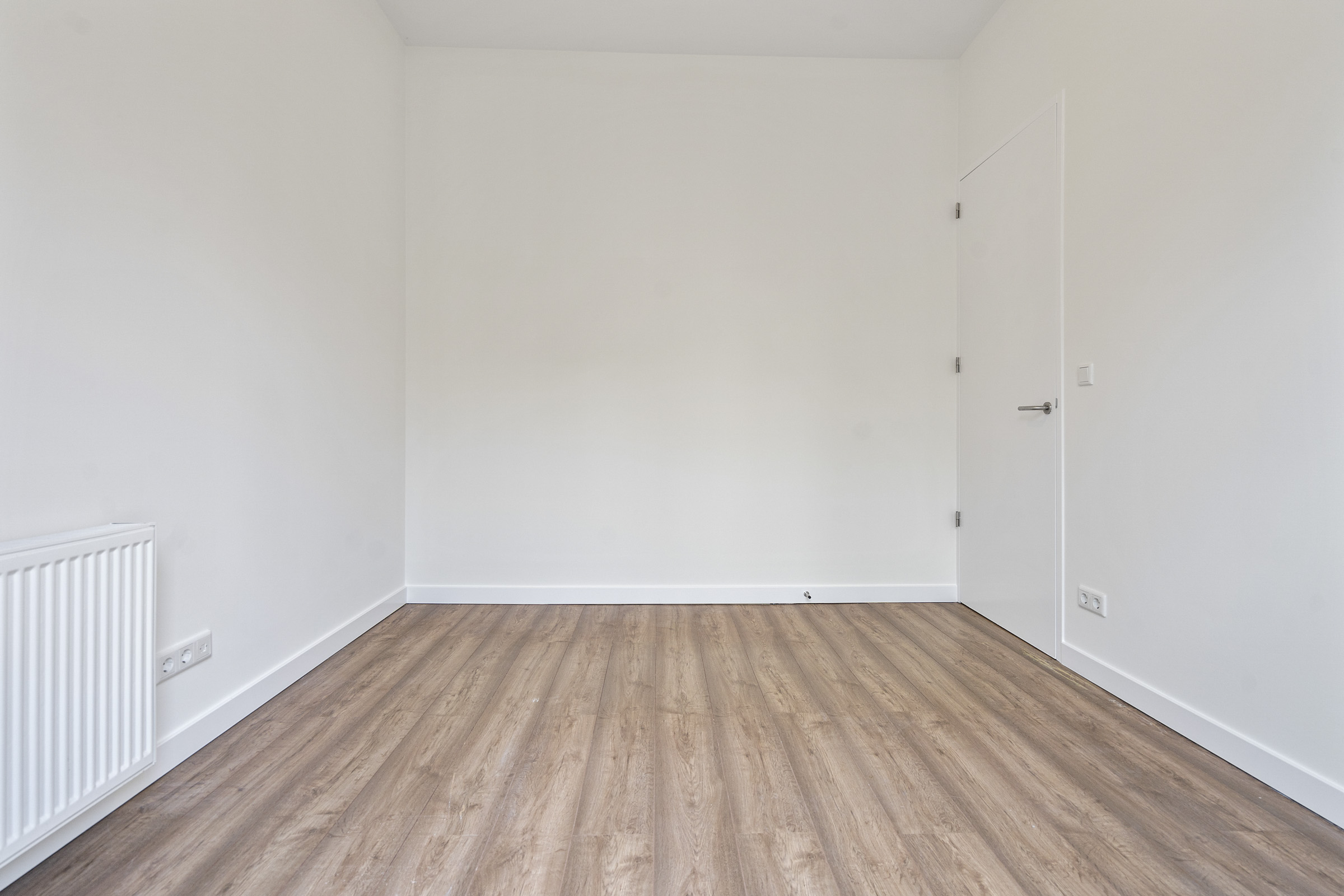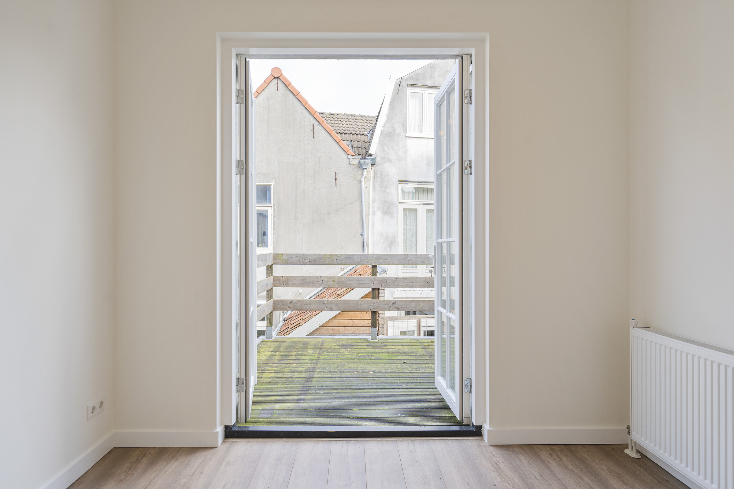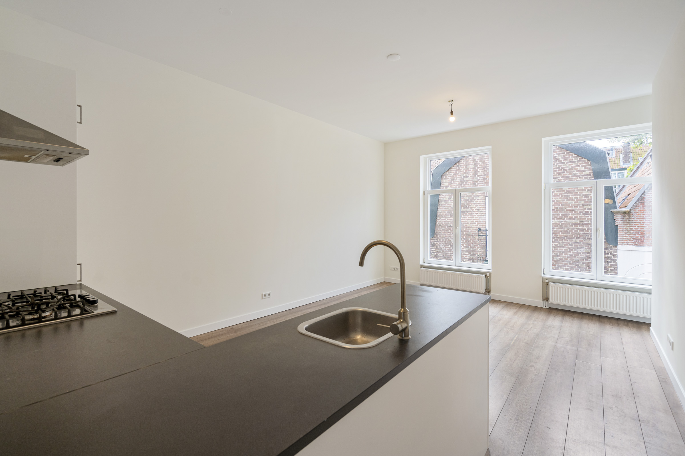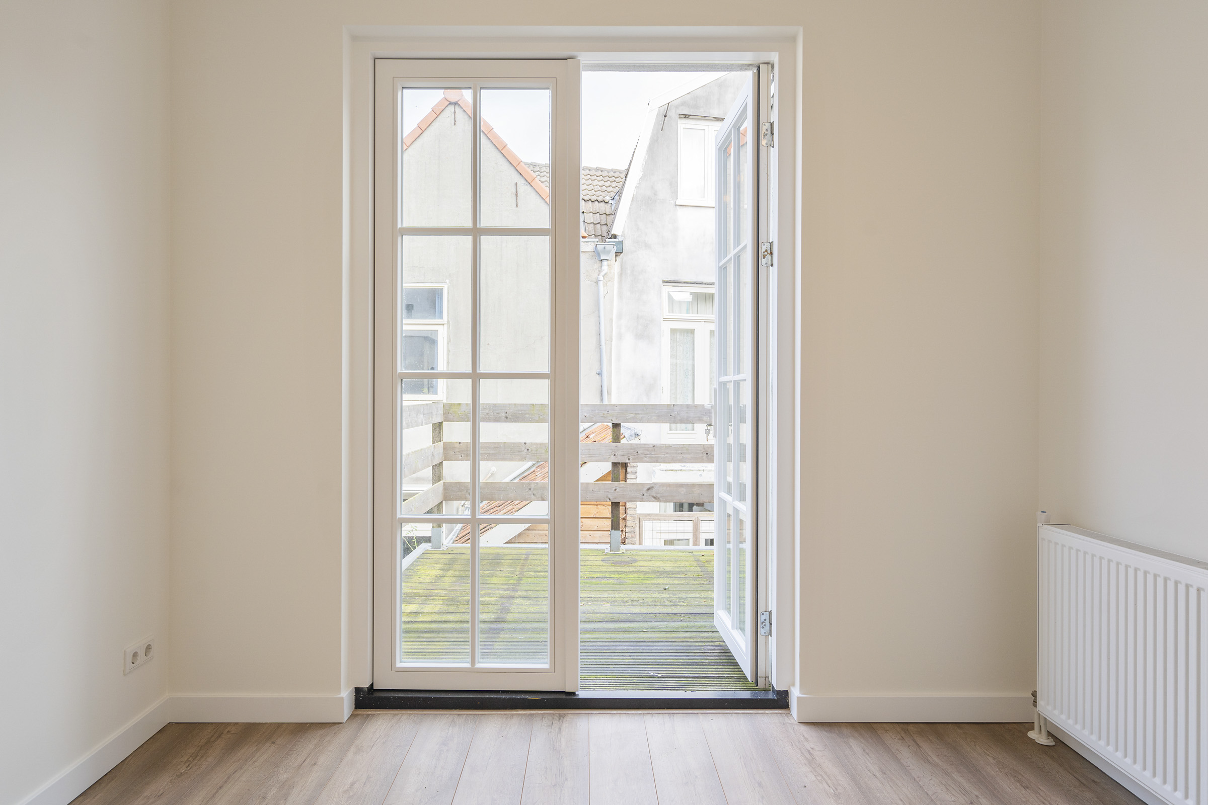 Binnenkomend aan de voorzijde ligt de lichte woonkamer met open keuken, waar hoge ramen zorgen voor veel daglicht en uitzicht op de charmante straat. Via de hal bereik je de slaapkamer aan de achterzijde, die grenst aan het zonnige dakterras, een heerlijke plek om buiten te zitten en te genieten van privacy. De badkamer is modern en ruim, met een inloopdouche, een stijlvol wastafelmeubel en plek voor de wasmachine. Er is daarnaast een separaat toilet.